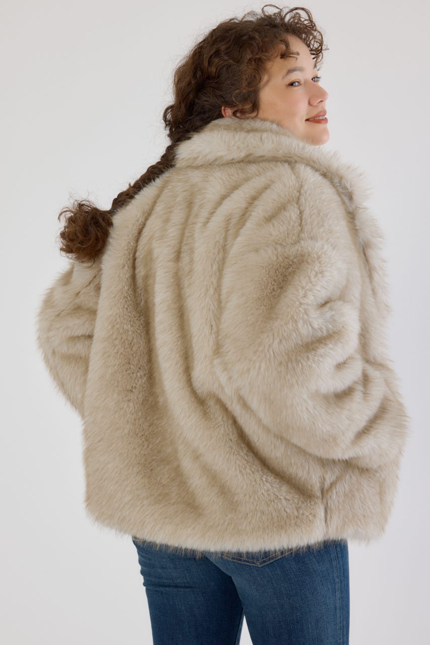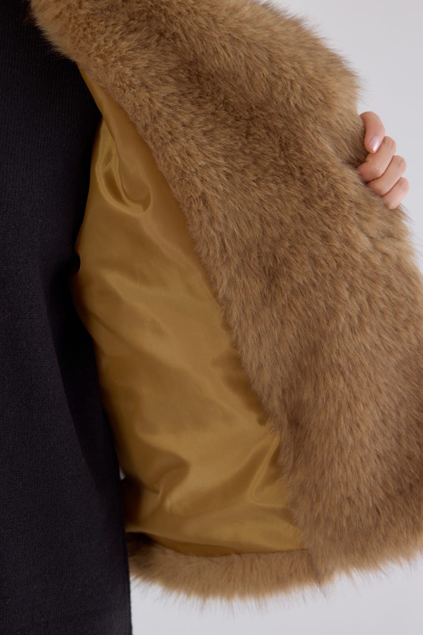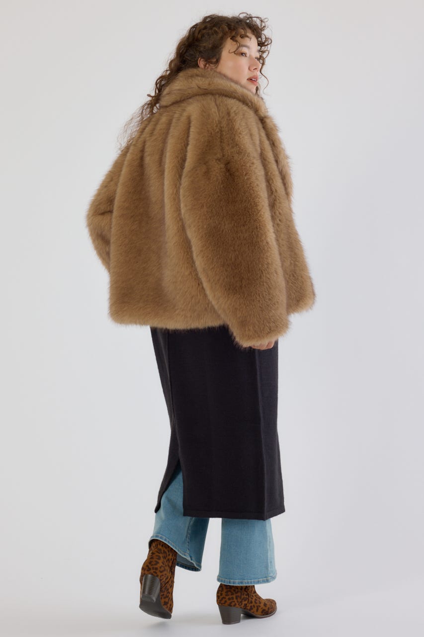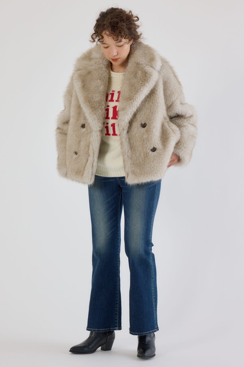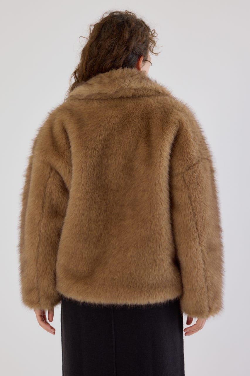 フォックスファーのような毛足長めのファーを使用し、洗練された女性の魅力を演出できるフェイクファーのPコート。