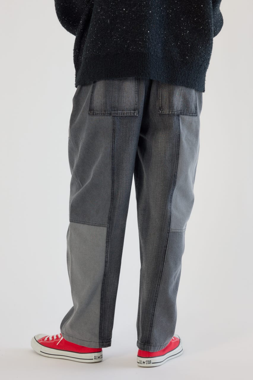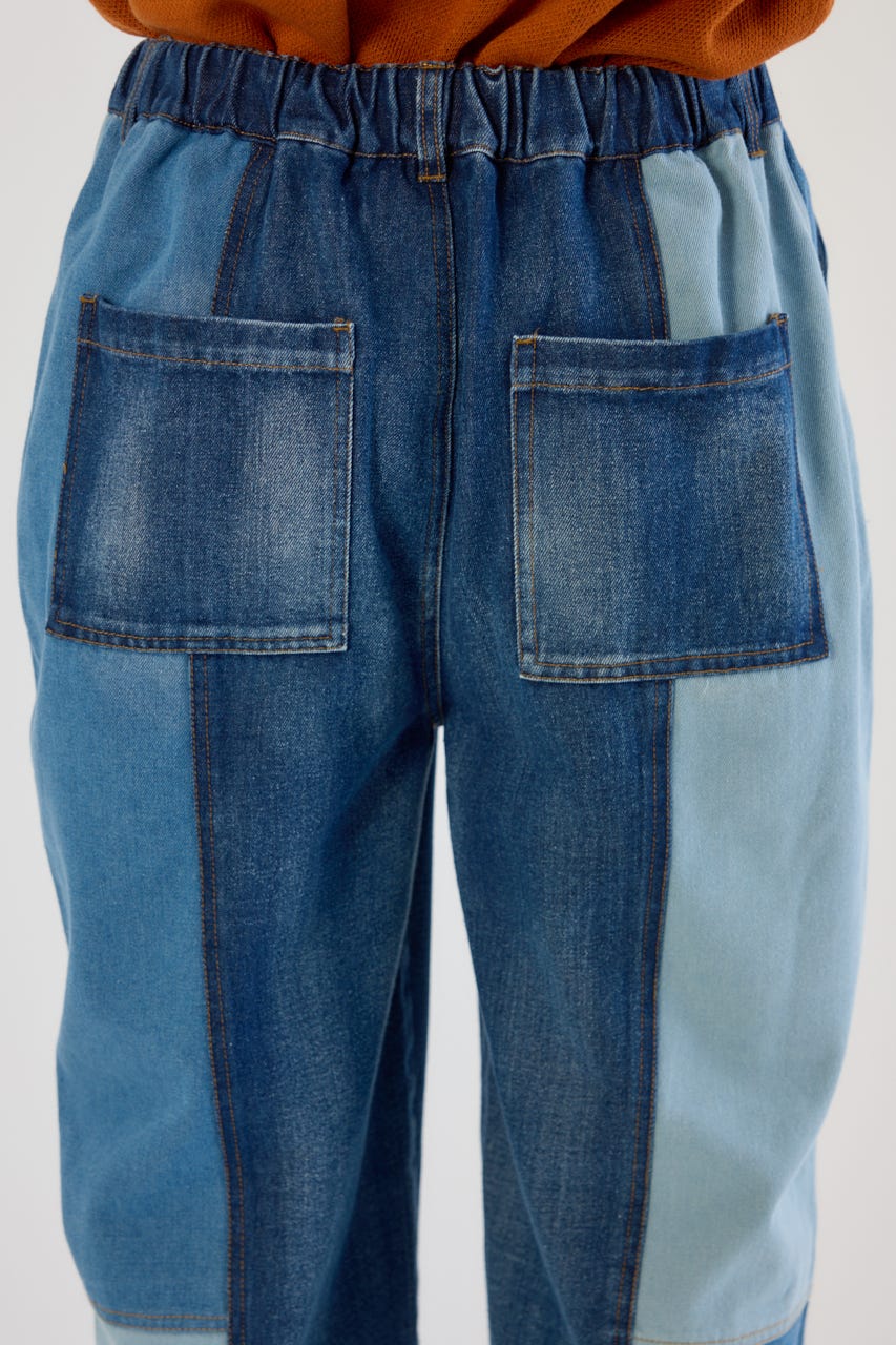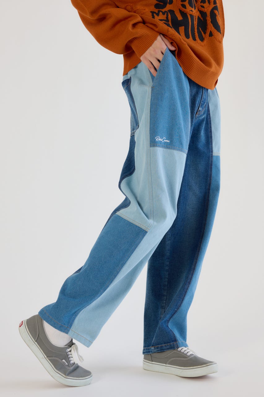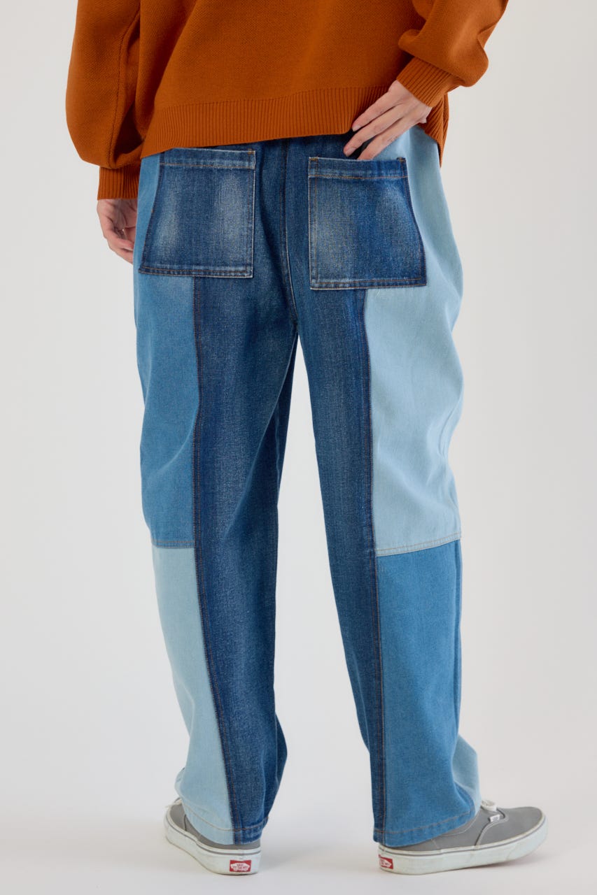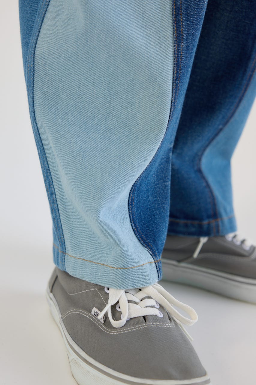 程よい太さのシルエットに濃淡の切り替えパッチワークデザインが目をひくデニムパンツです。