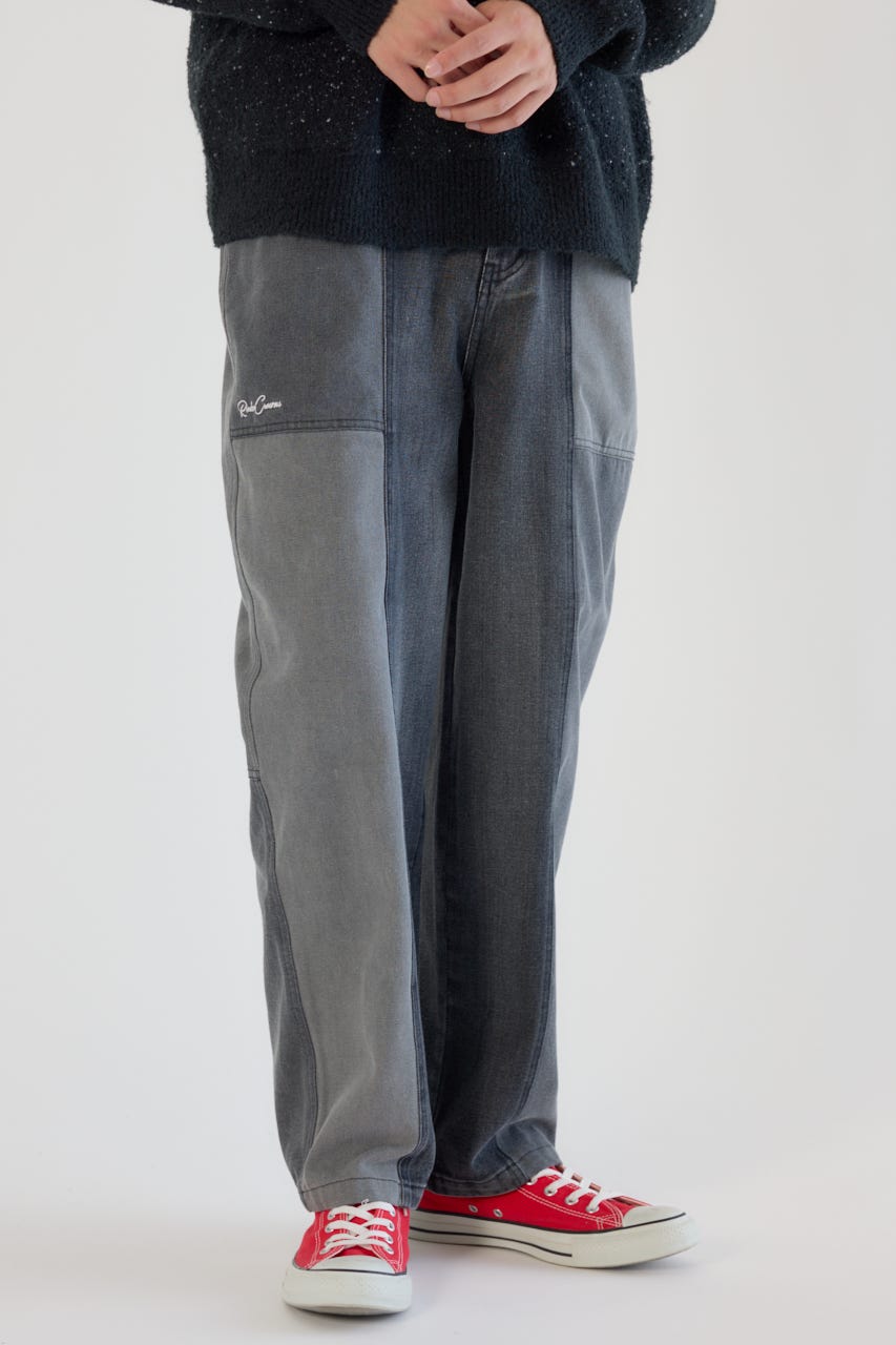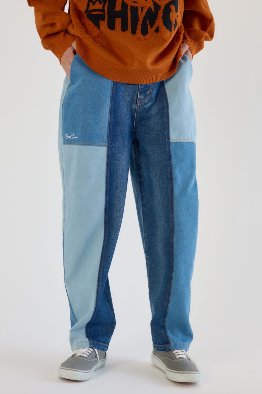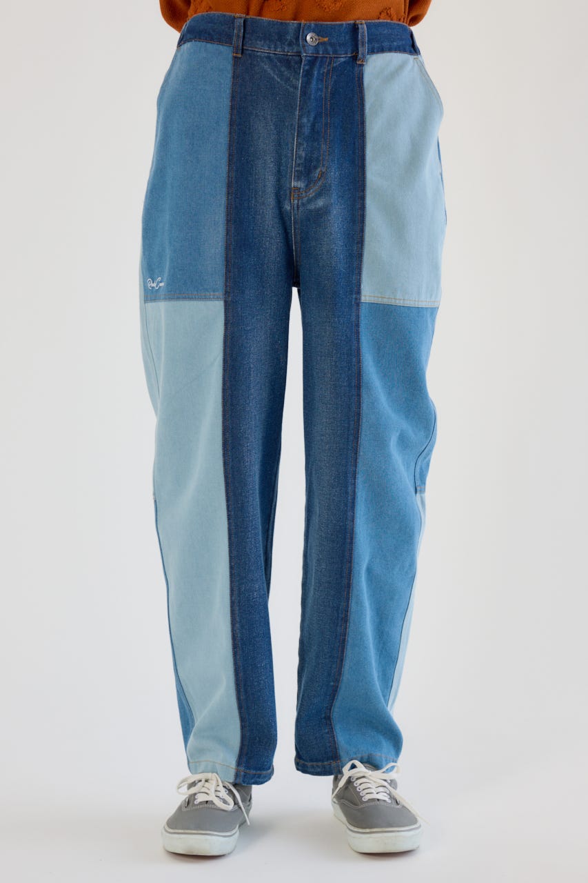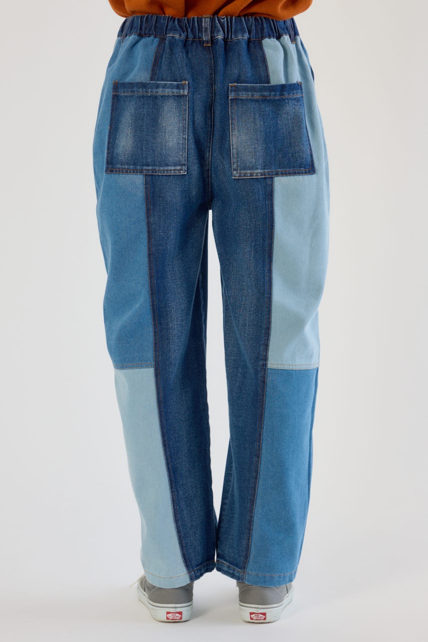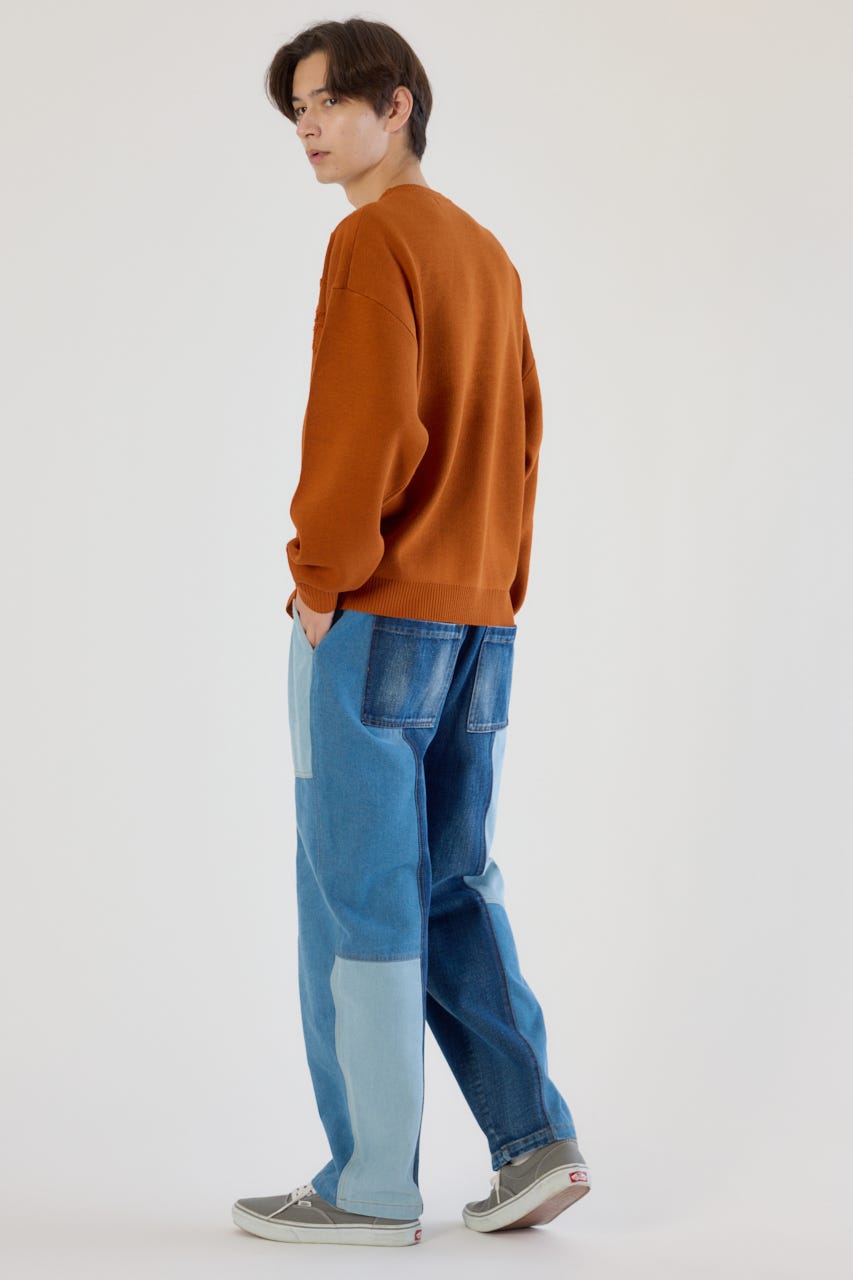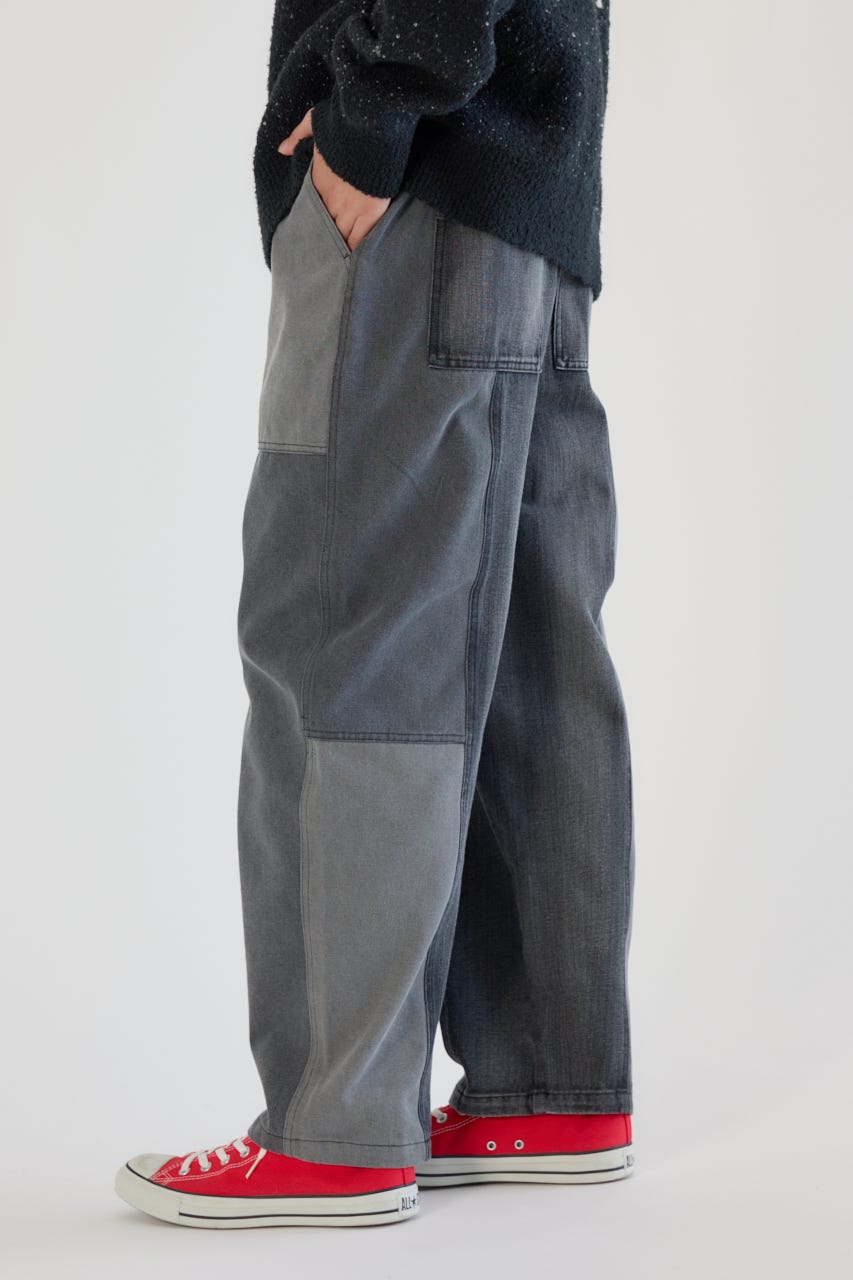 程よい太さのシルエットに濃淡の切り替えパッチワークデザインが目をひくデニムパンツです。