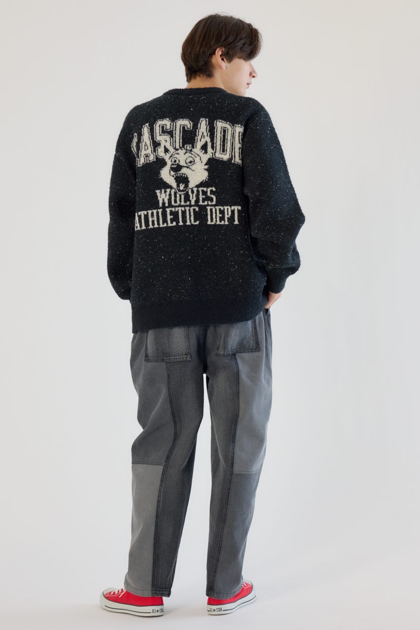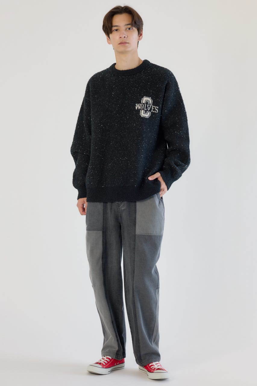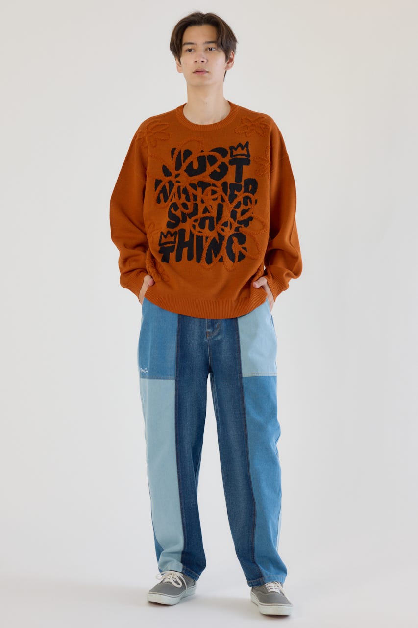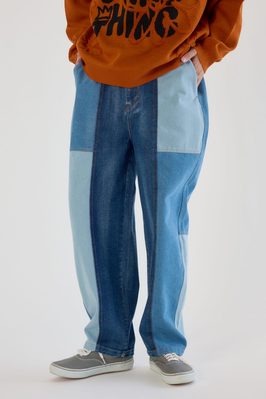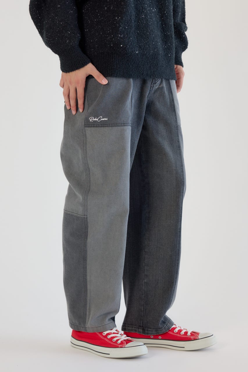 程よい太さのシルエットに濃淡の切り替えパッチワークデザインが目をひくデニムパンツです。