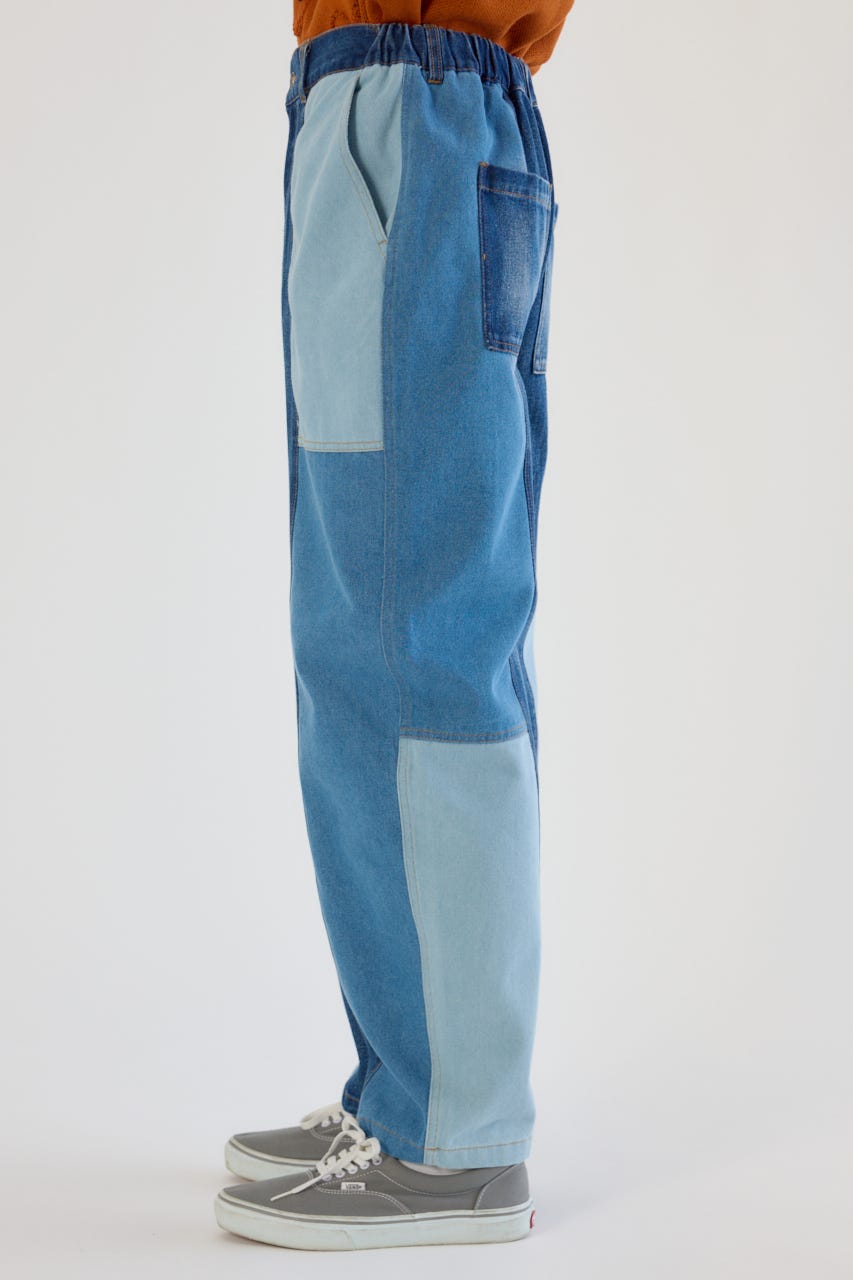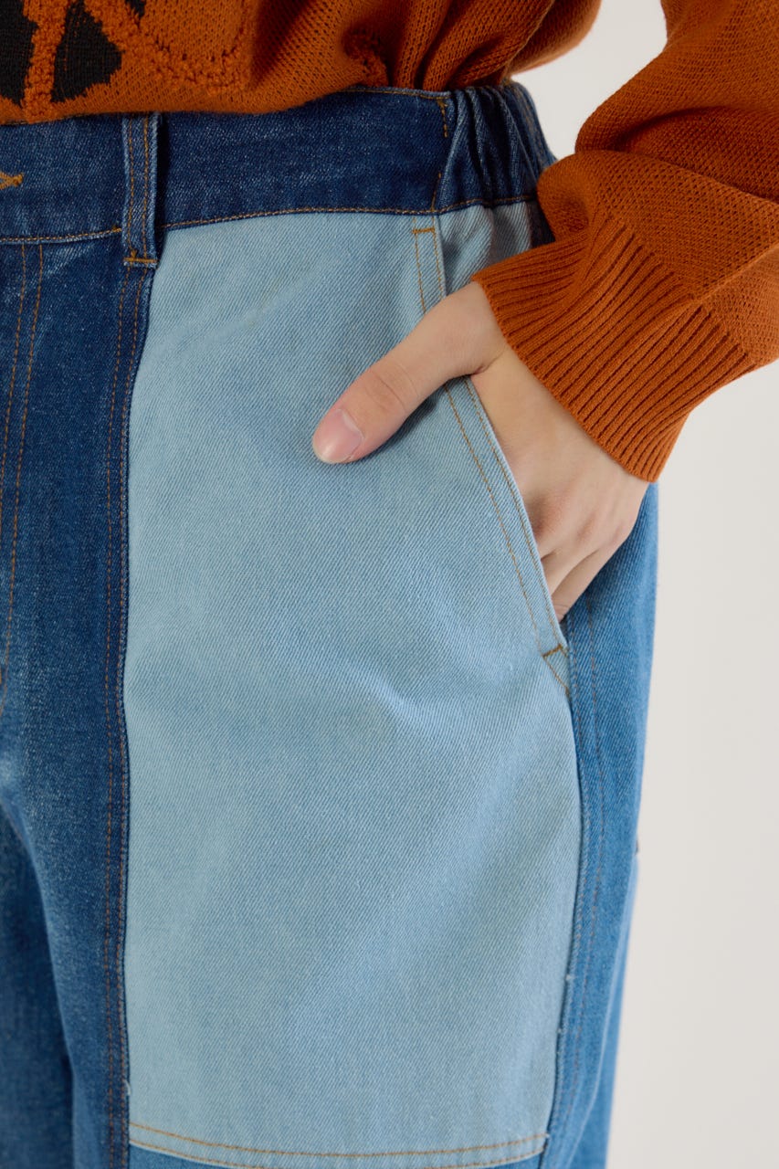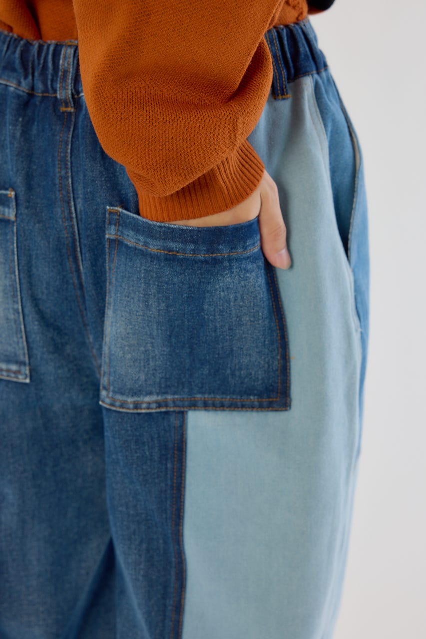 配色の生地を縫い合わせたしっかりとした生地感のパッチワークデニム。