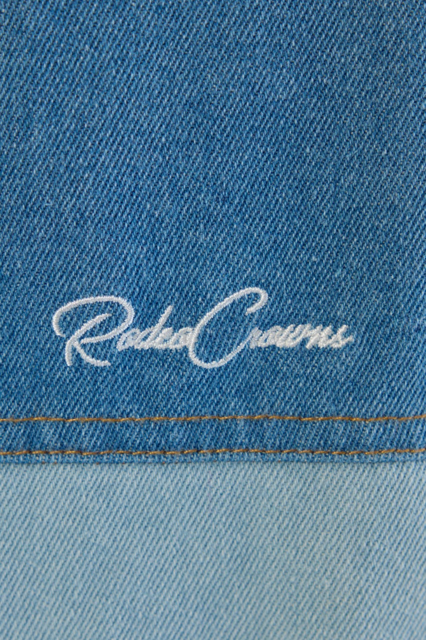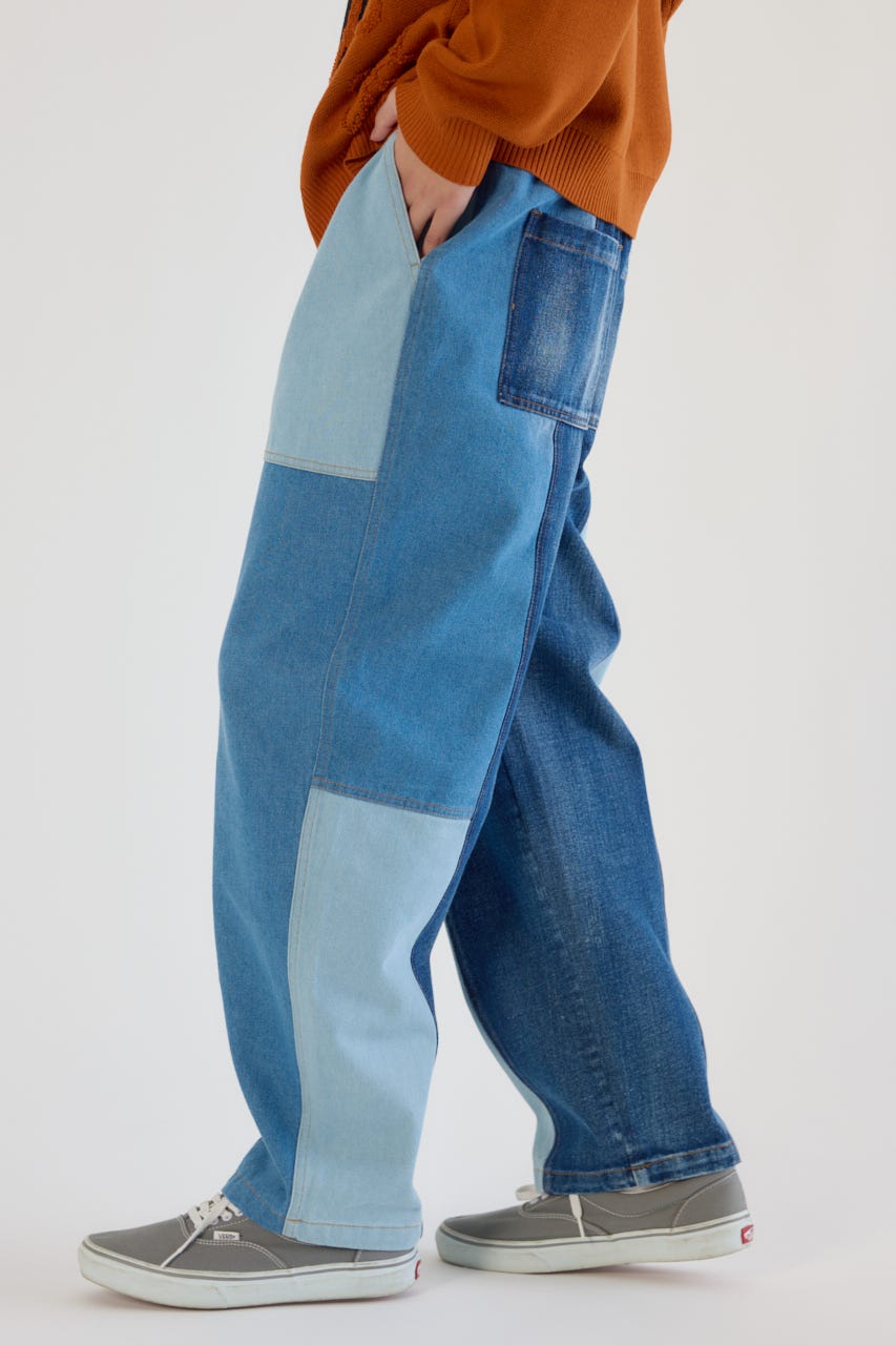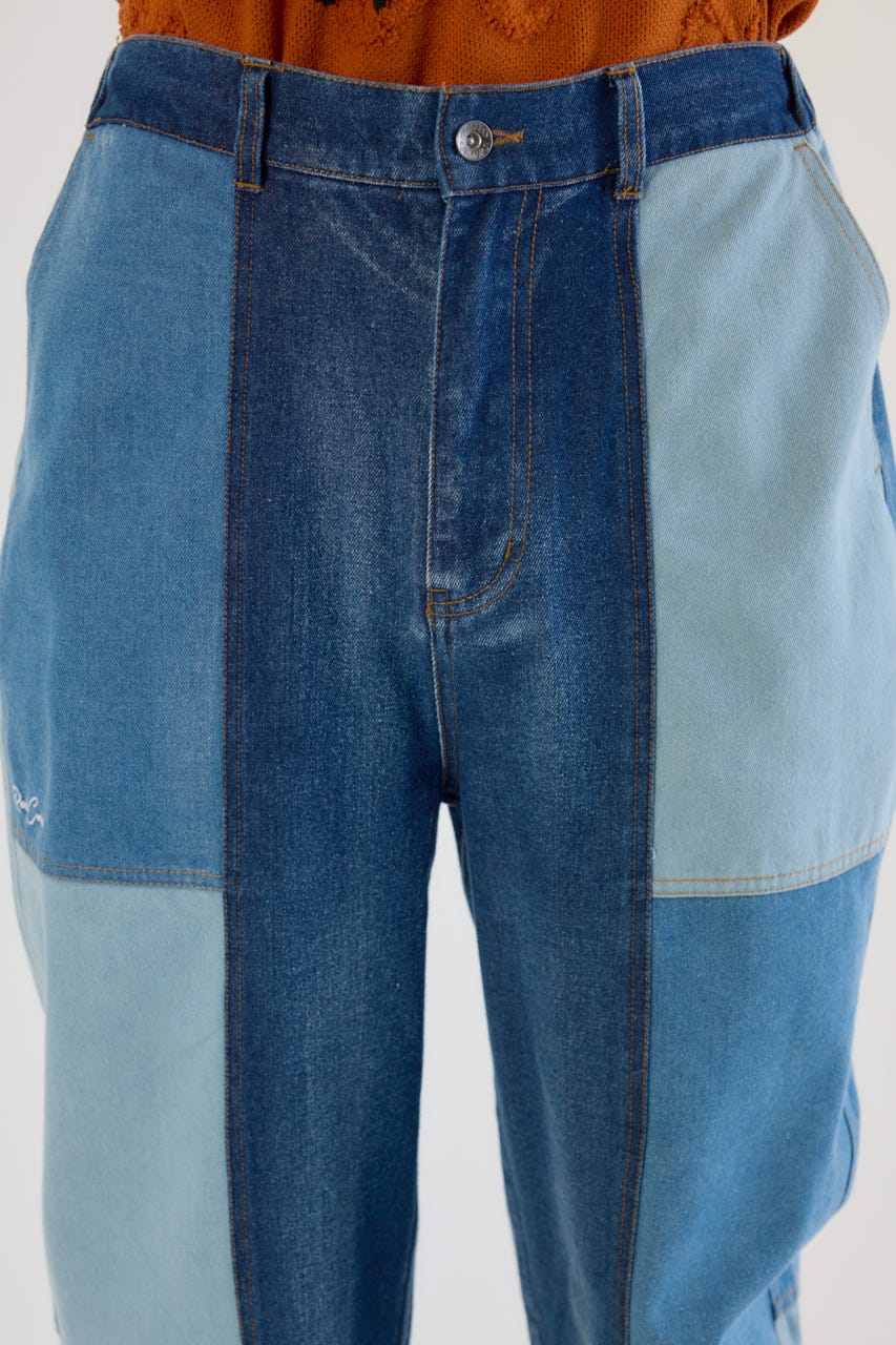 配色の生地を縫い合わせたしっかりとした生地感のパッチワークデニム。