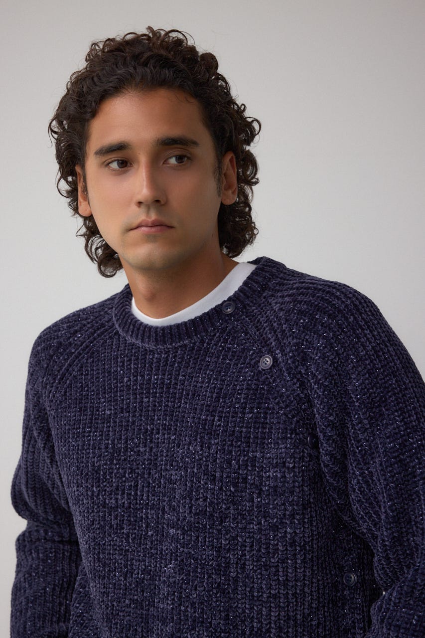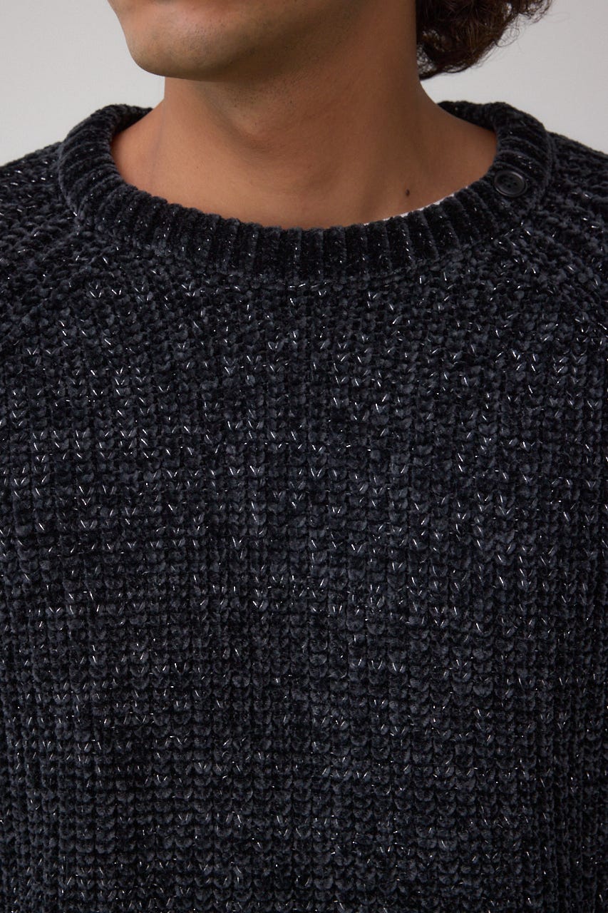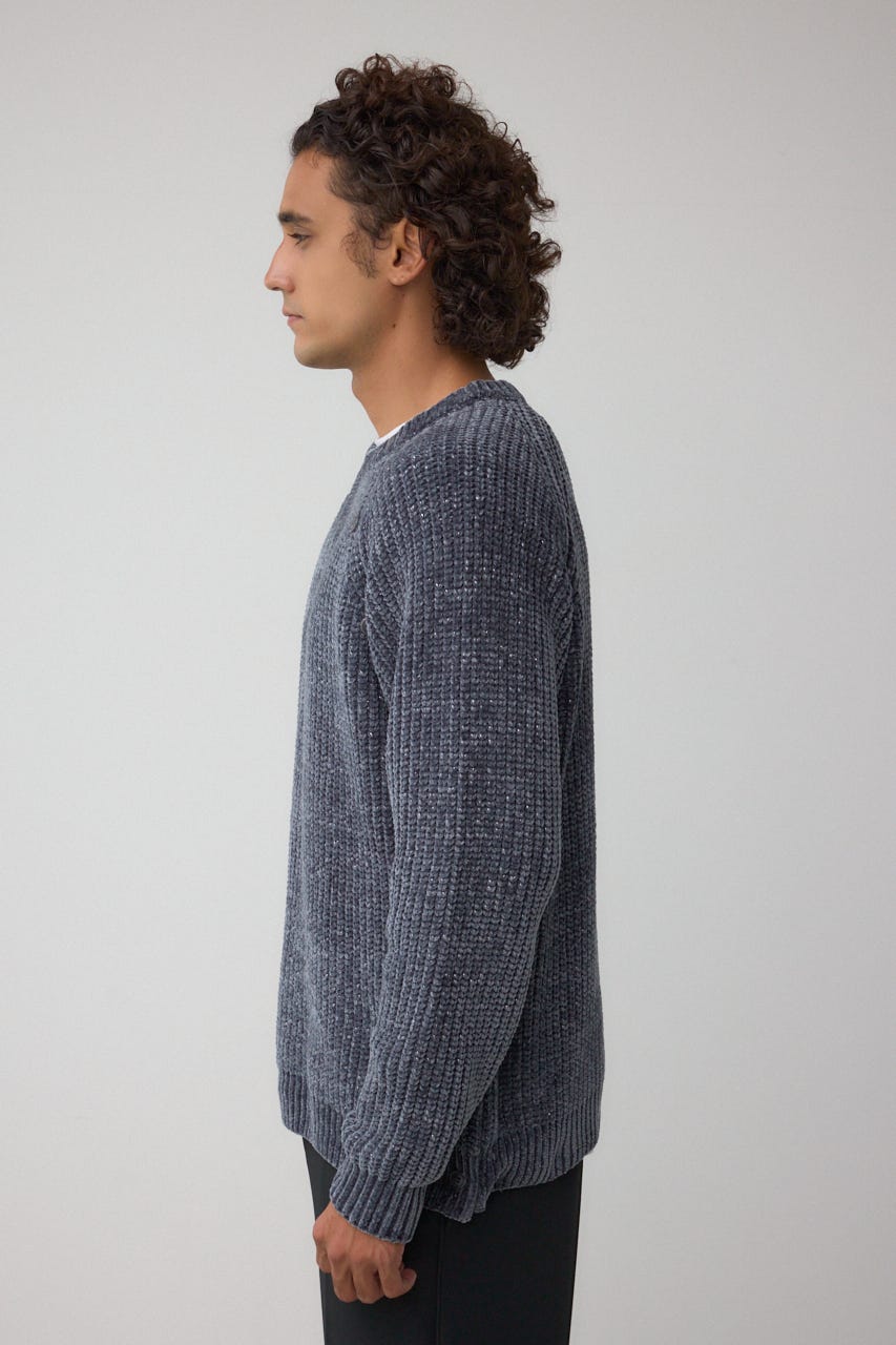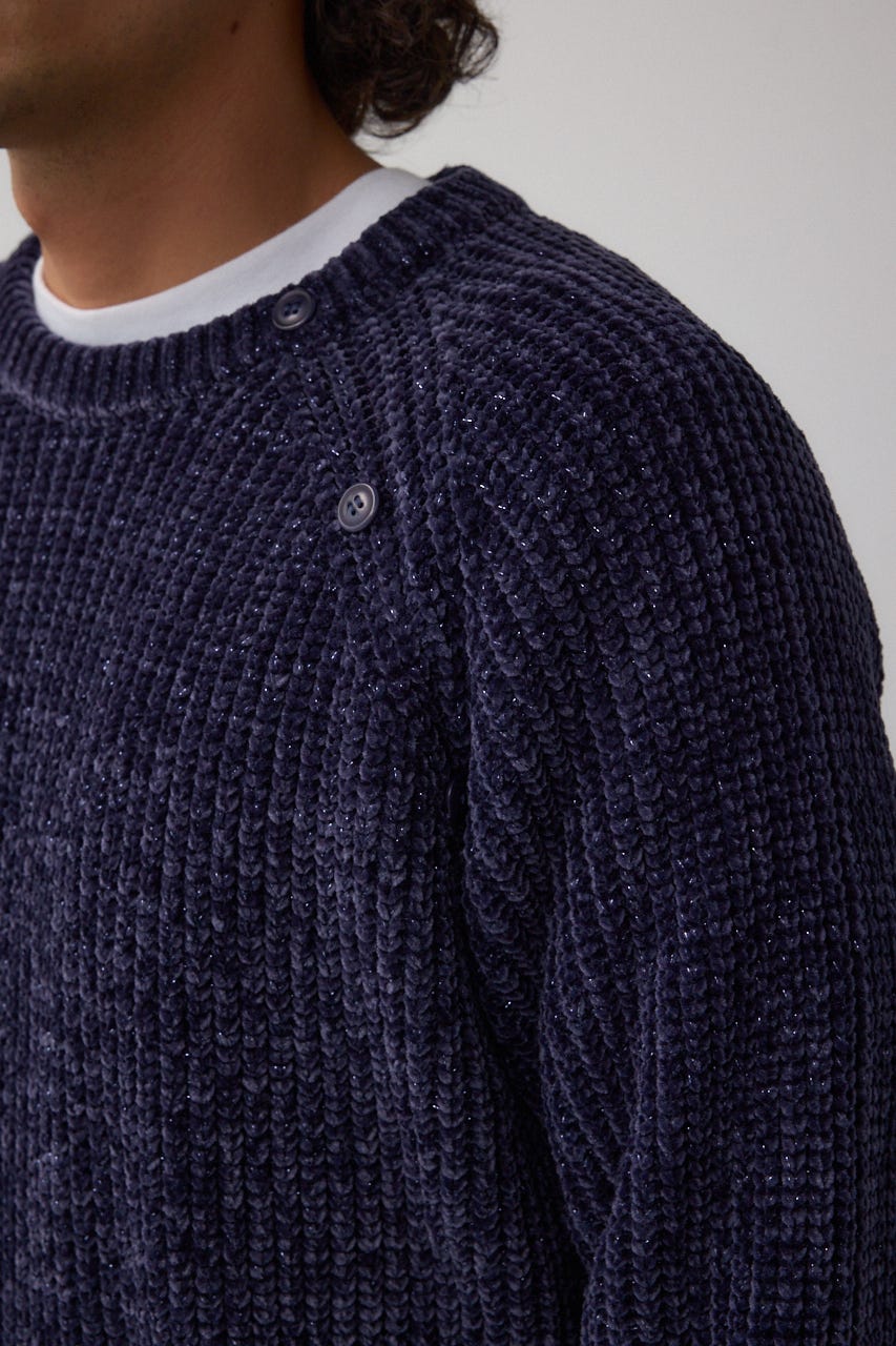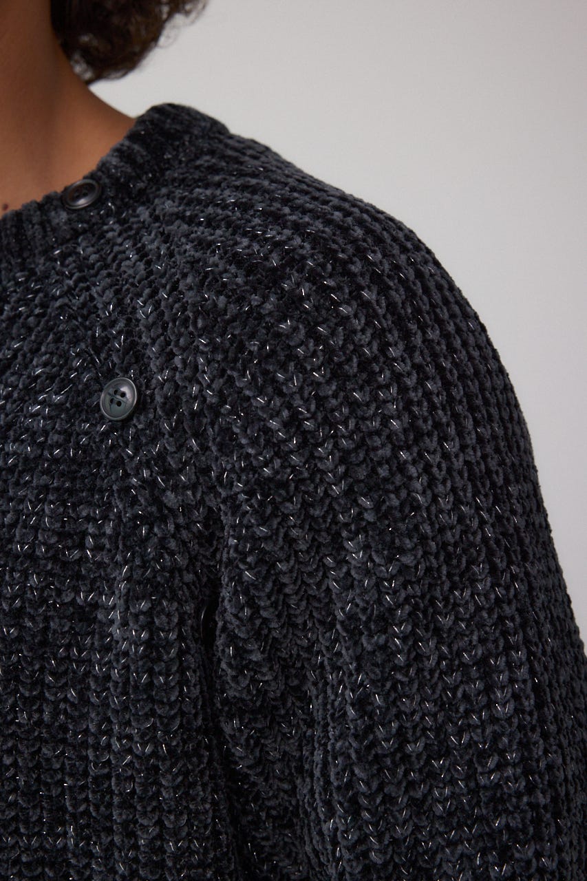モールヤーンを使用し、軽く、柔らかくモチモチした風合いとラメの光沢感の対比のミックス感が特徴です。
