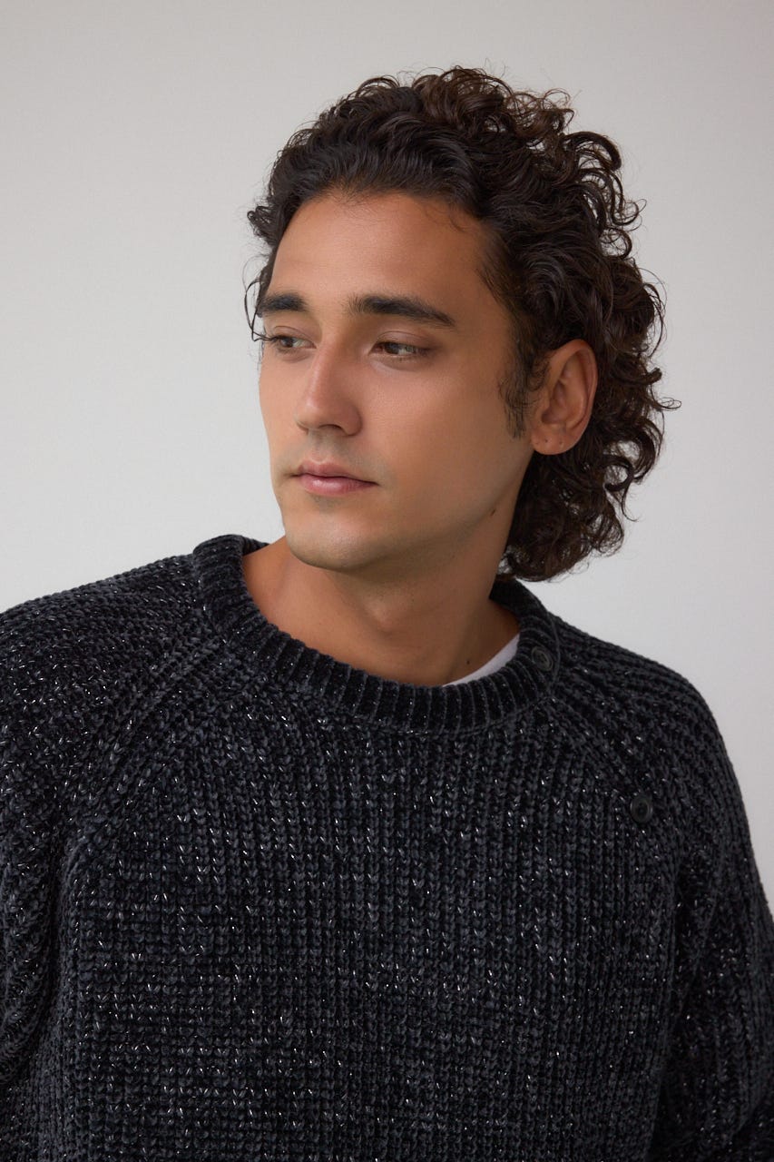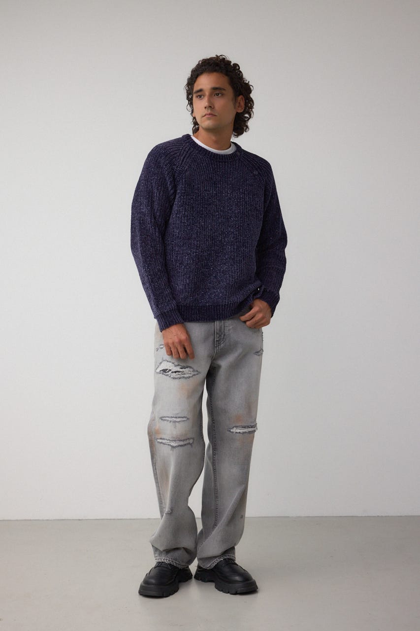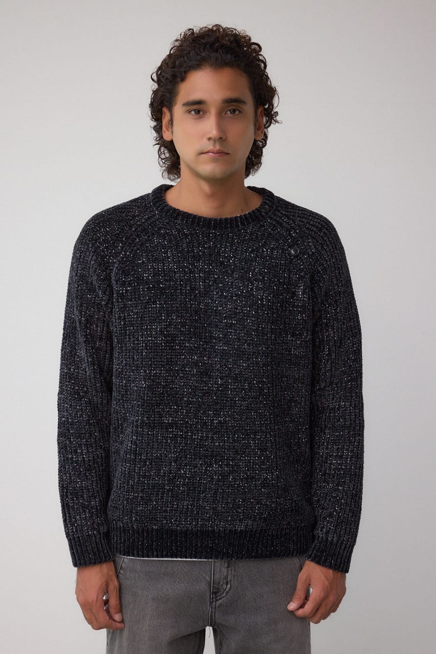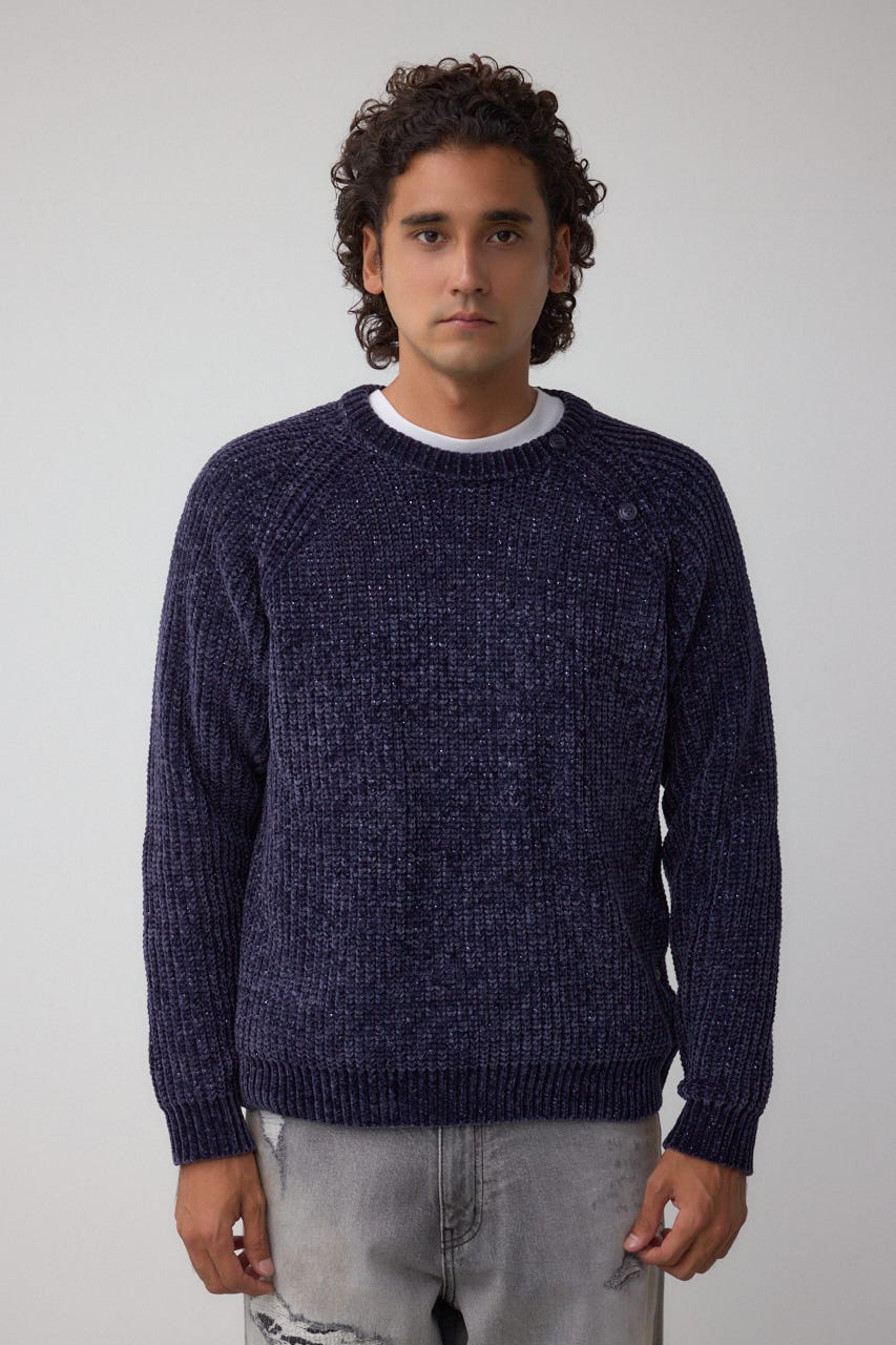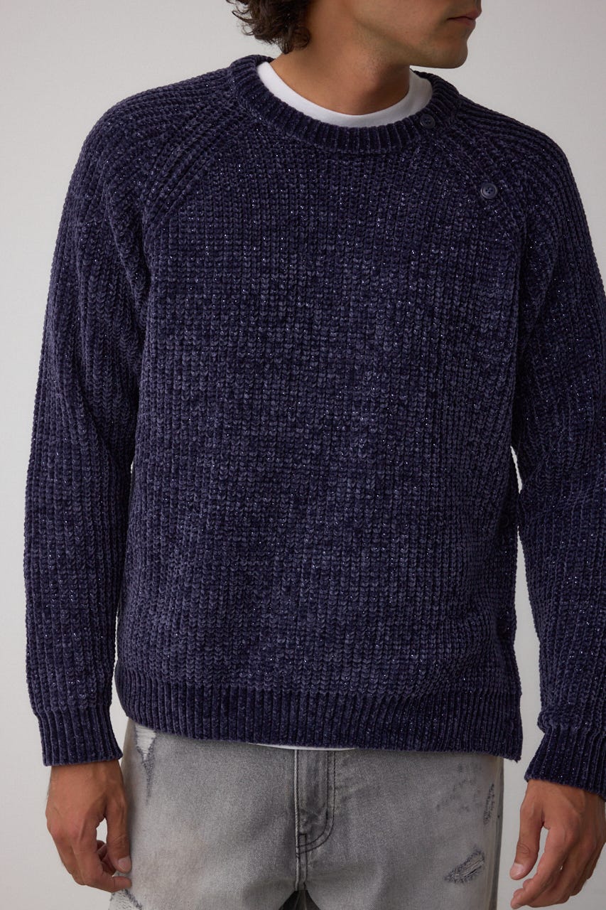 モールヤーンを使用し、軽く、柔らかくモチモチした風合いとラメの光沢感の対比のミックス感が特徴です。