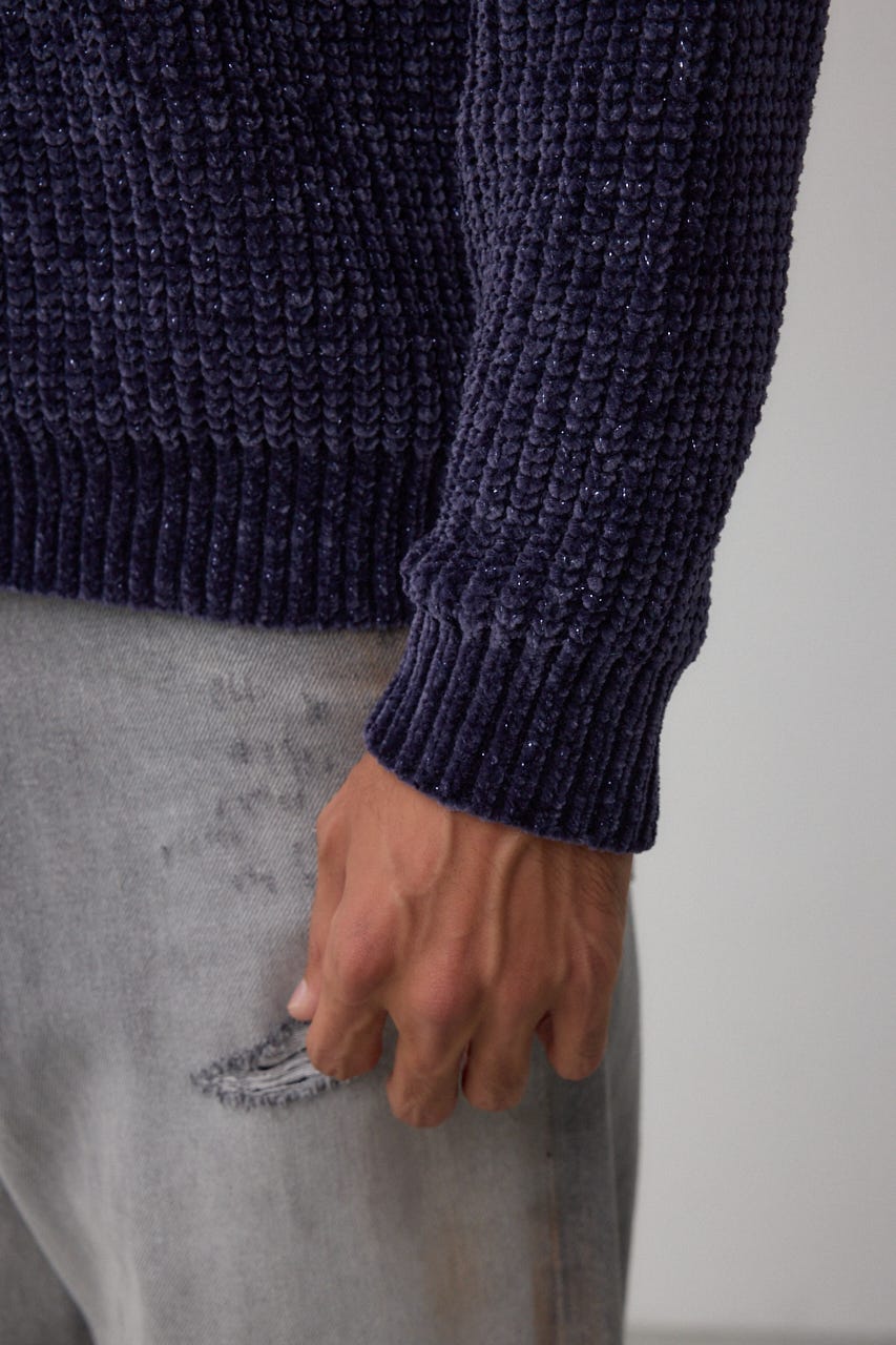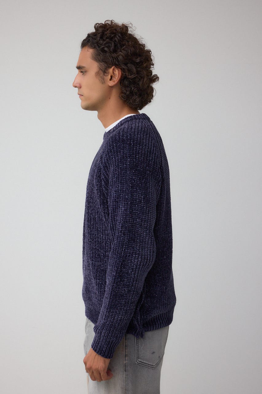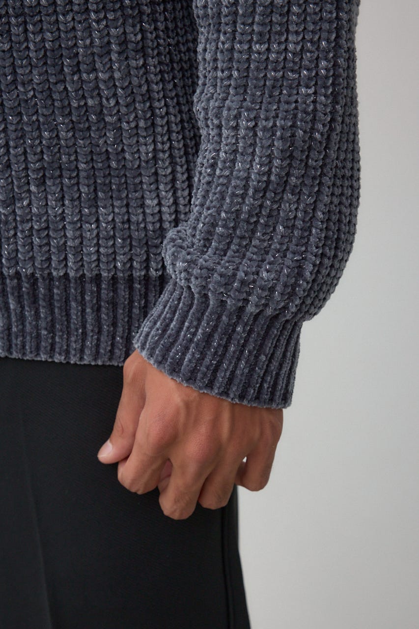 ベロアのような光沢感が特徴のモール糸に、ラメ糸を引き揃えて度詰めに編んでいます。