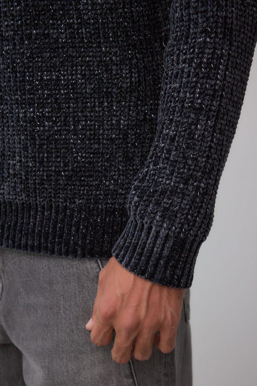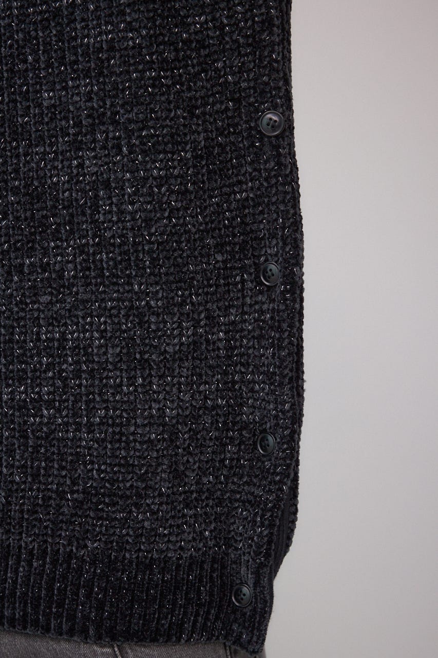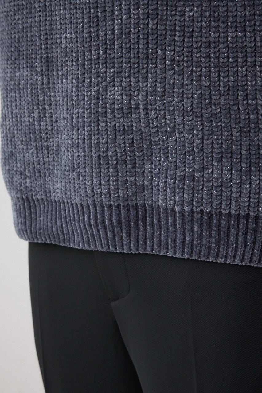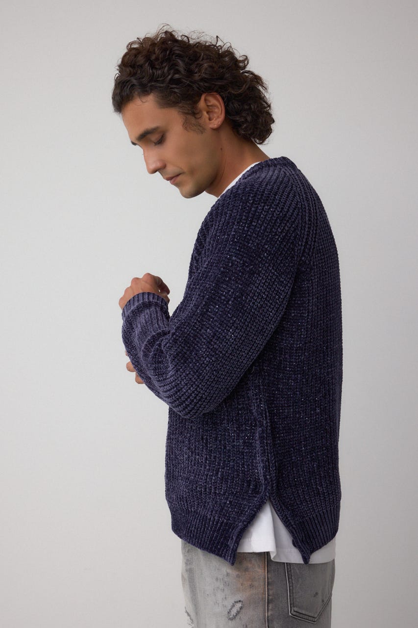 ベロアのような光沢感が特徴のモール糸に、ラメ糸を引き揃えて度詰めに編んでいます。