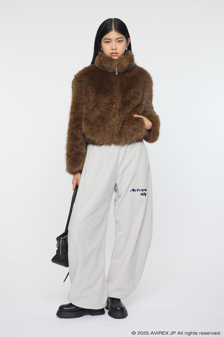 前後のAVIREXロゴの配置が新しいデザインで、ピタッとしすぎない盛れるシルエットのフリースパンツなのもポイント。