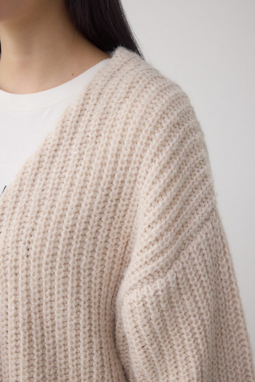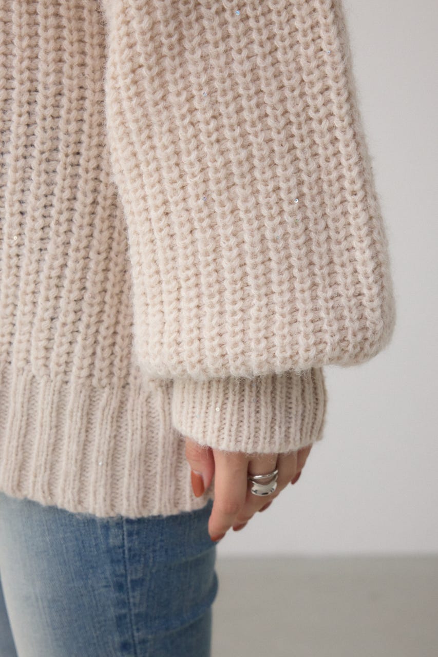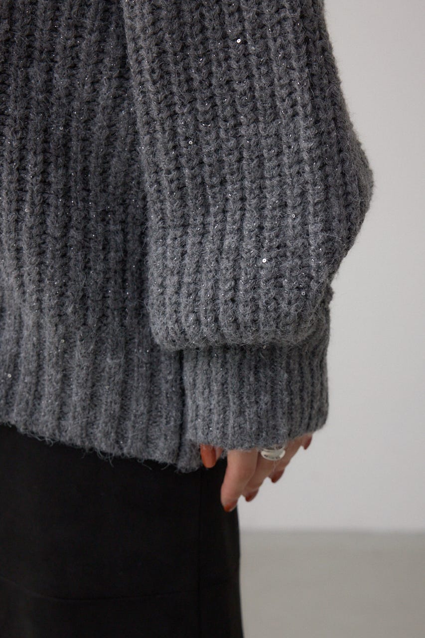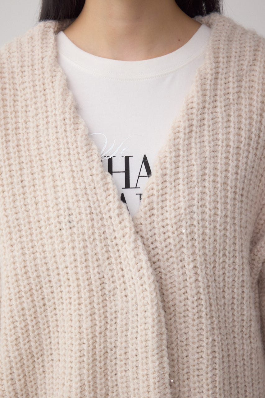 スパンコールを絡めた糸と膨らみと温かみのある糸を引き揃え、編み立てています。