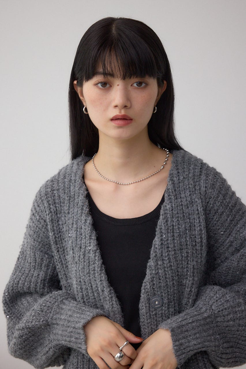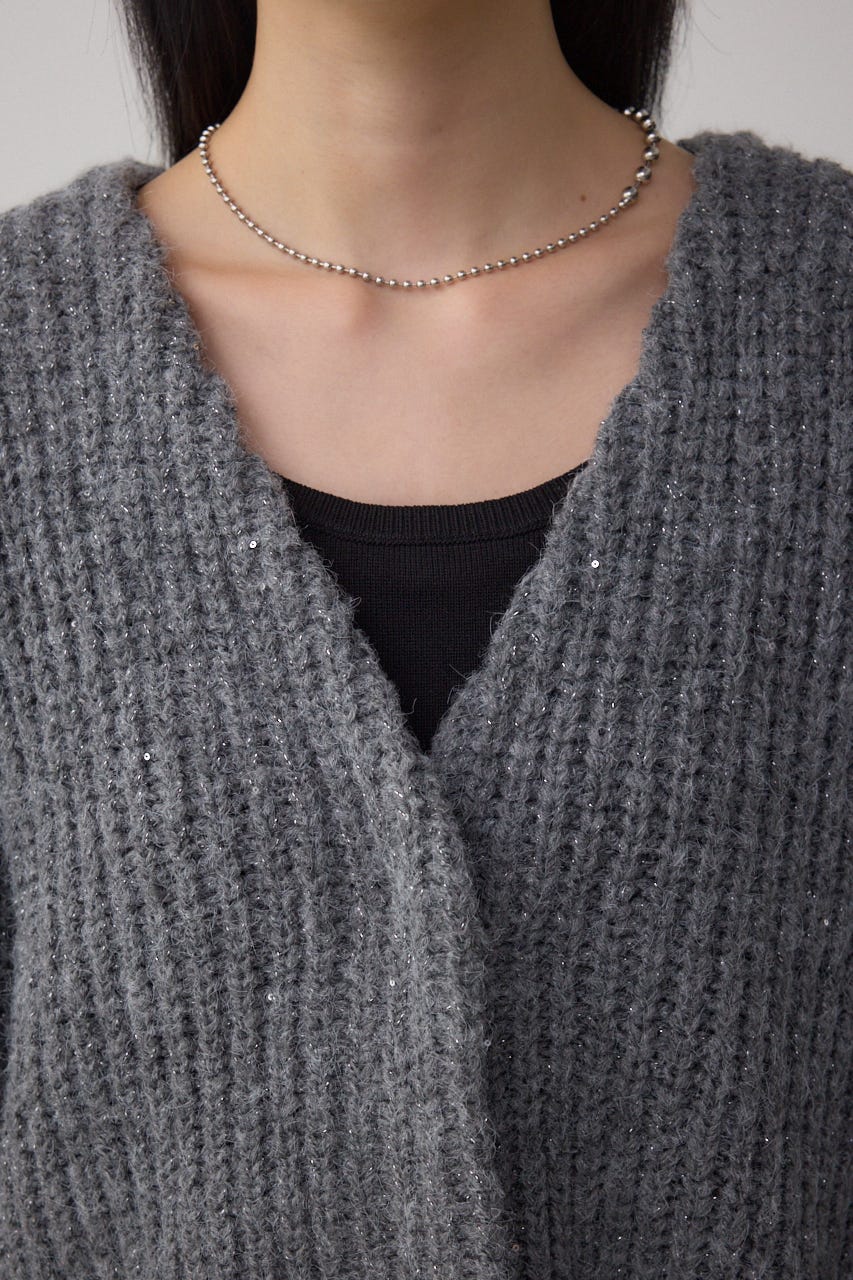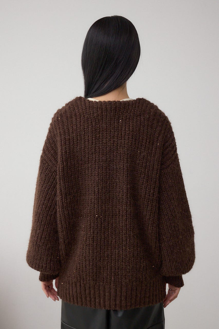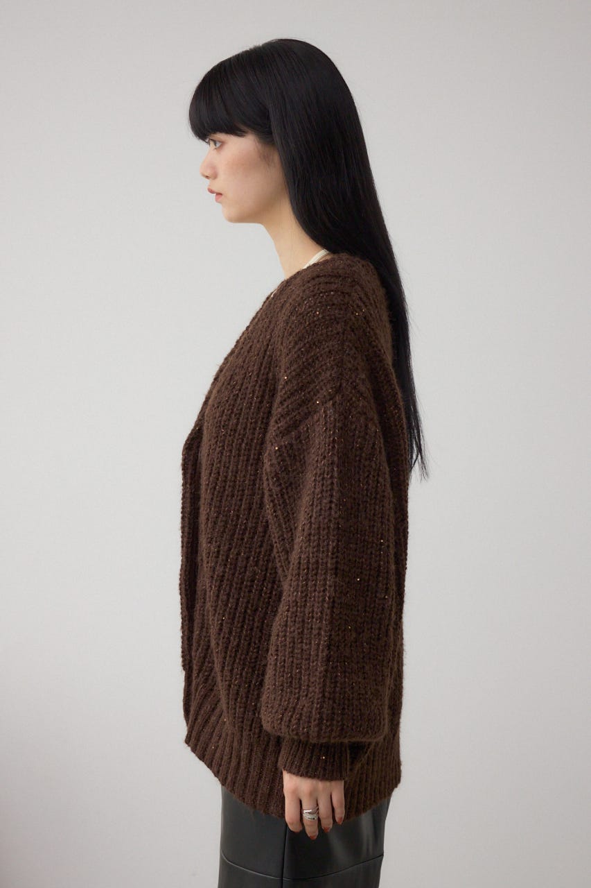スパンコールを絡めた糸と膨らみと温かみのある糸を引き揃え、編み立てています。