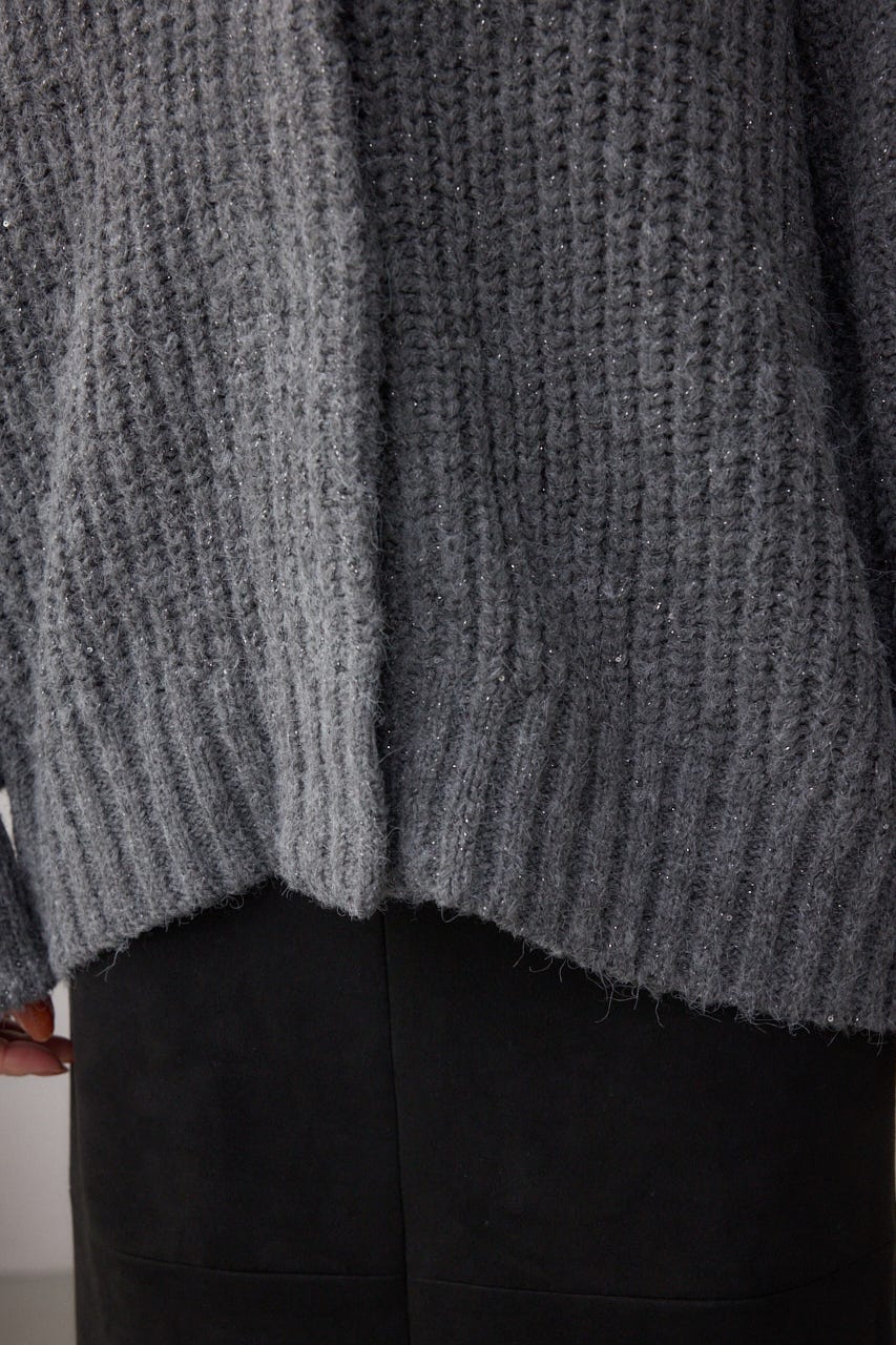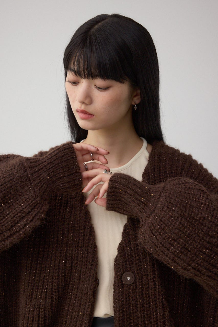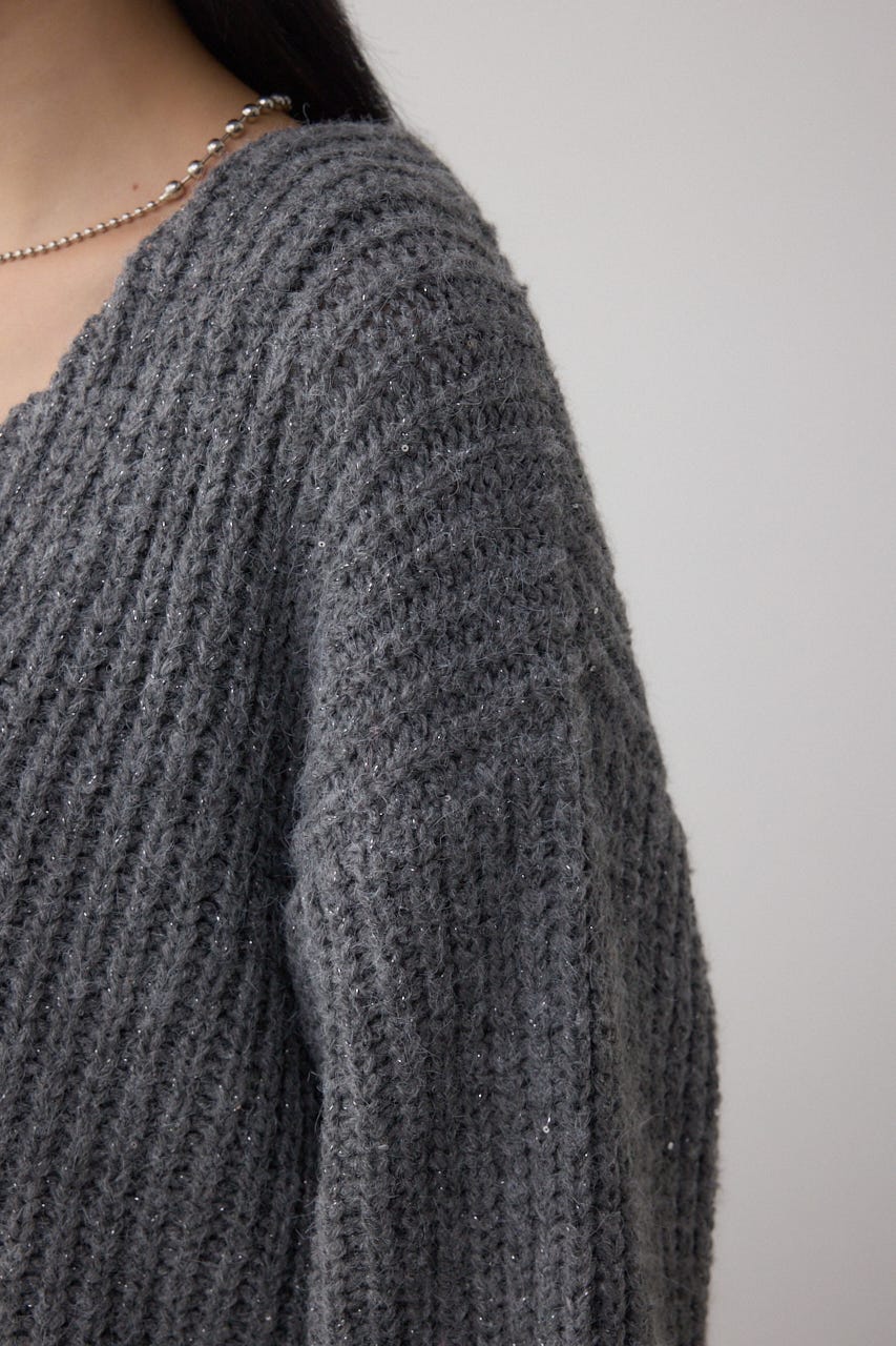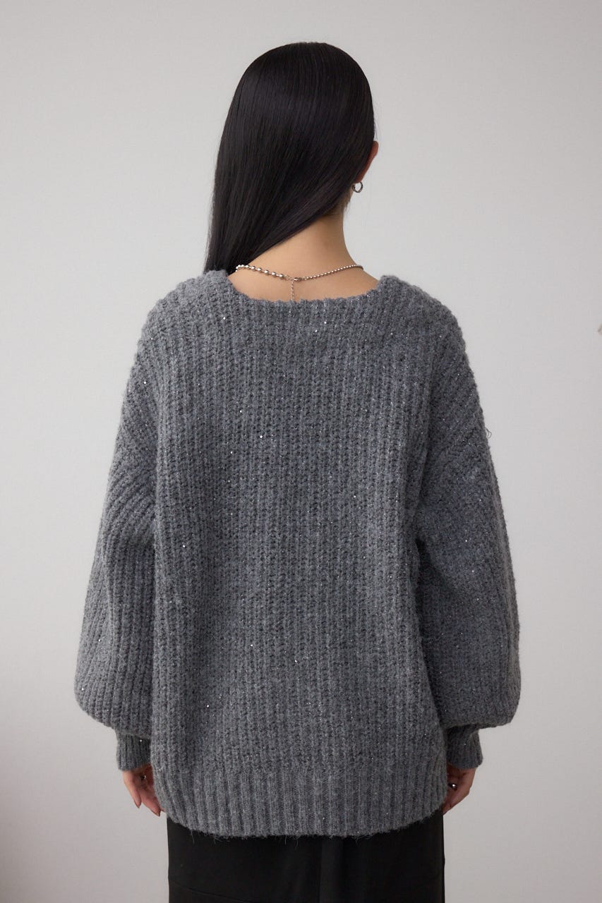 スパンコールを絡めた糸と膨らみと温かみのある糸を引き揃え、編み立てています。