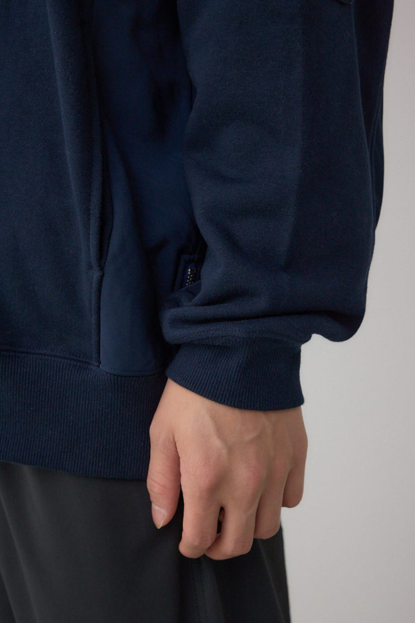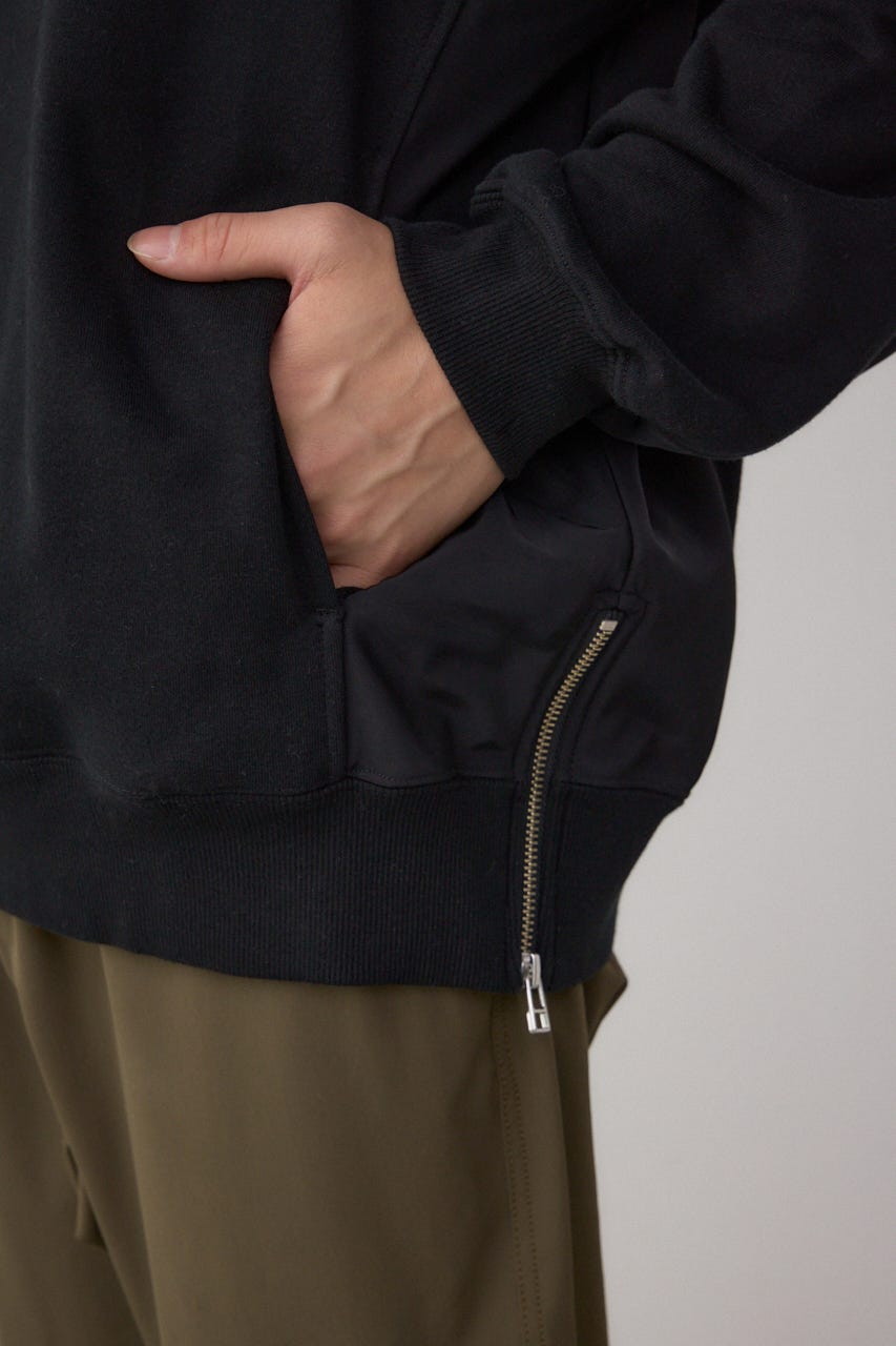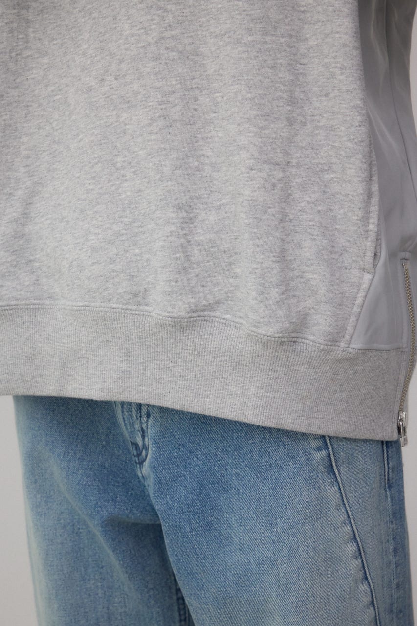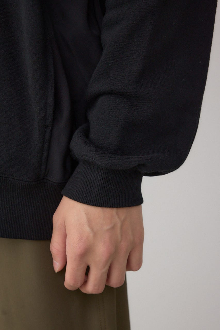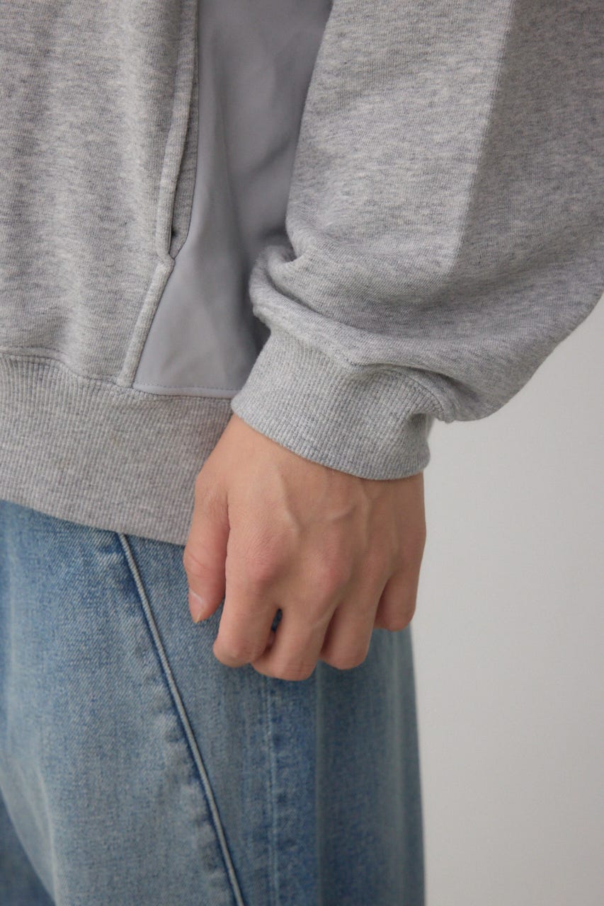 裏毛スウェットとやや光沢のある布帛をドッキングしたプルオーバー。