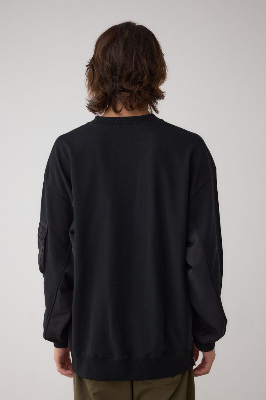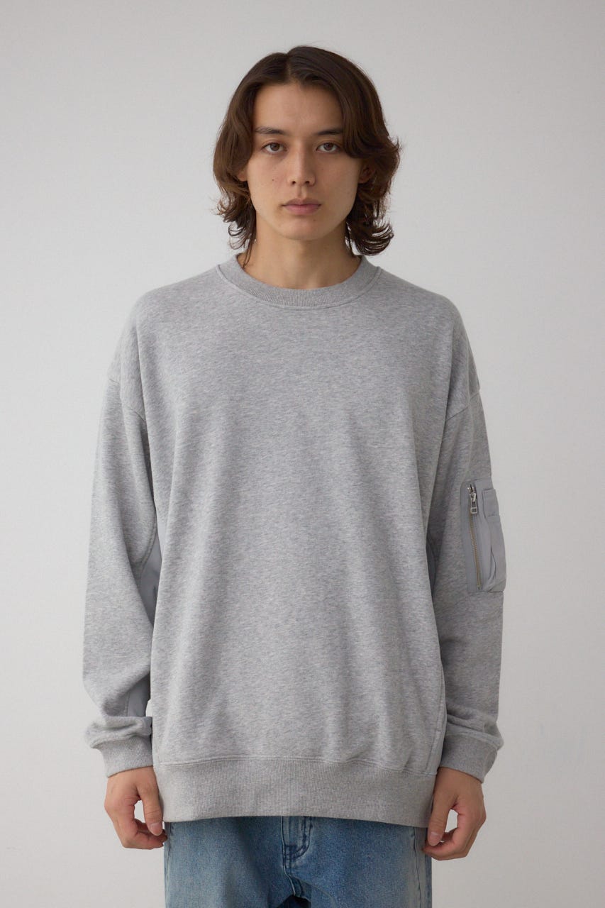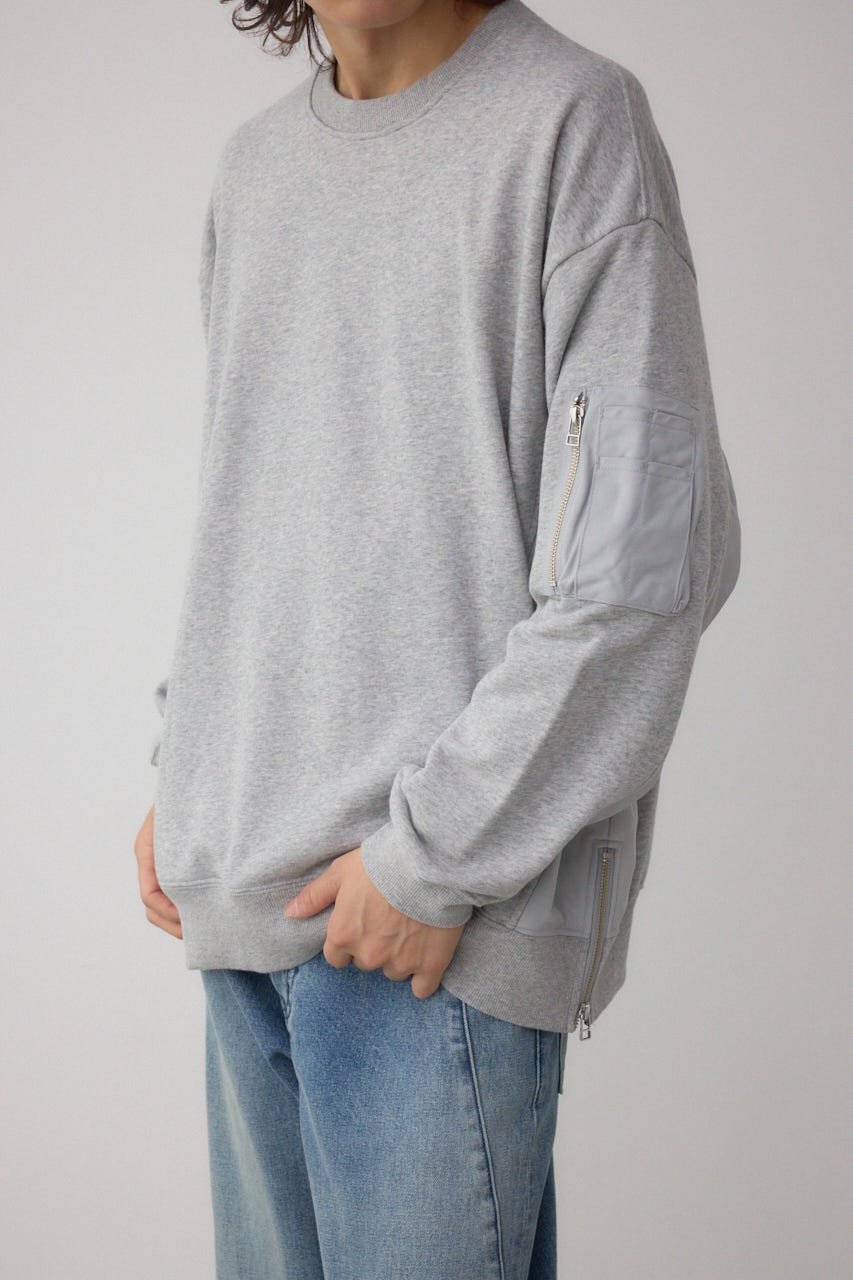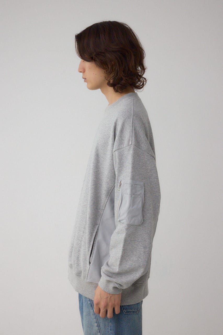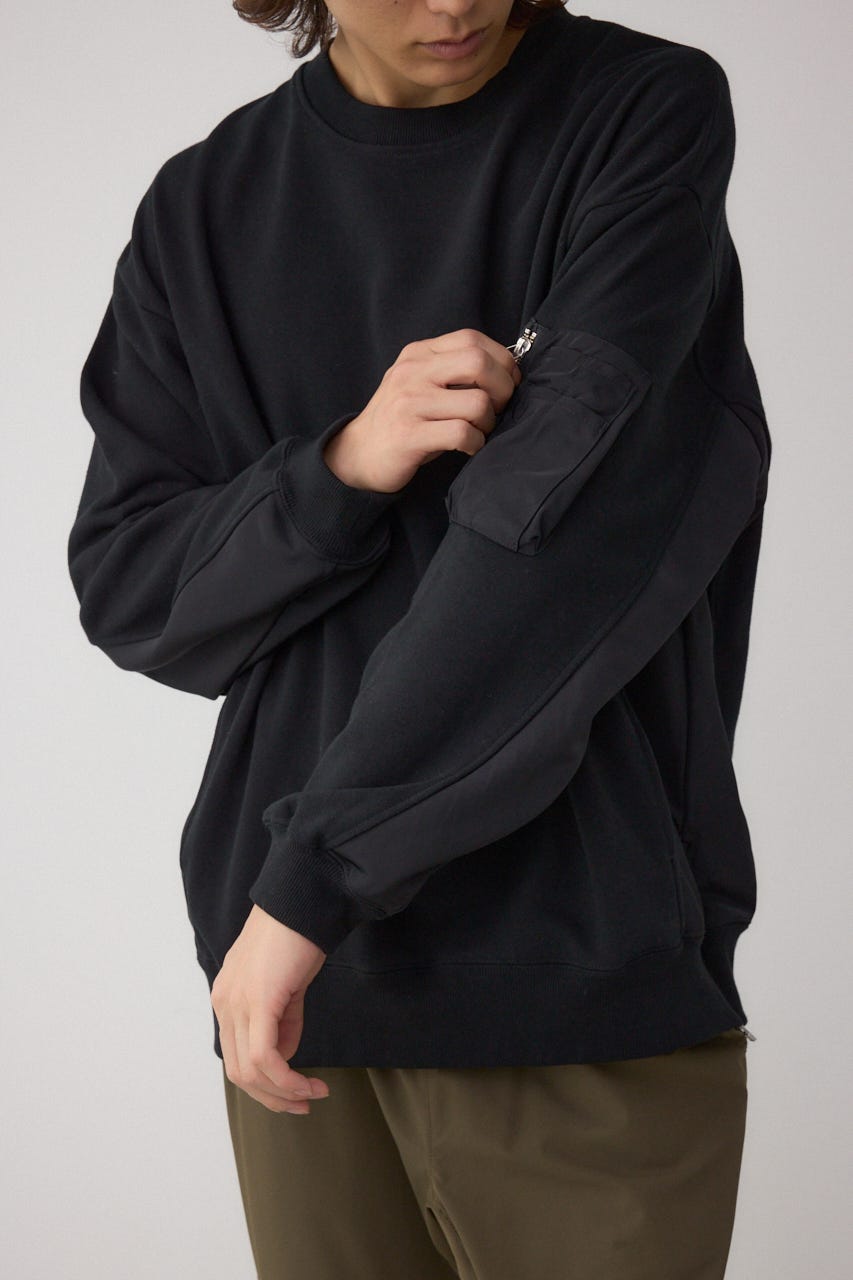 裏毛スウェットとやや光沢のある布帛をドッキングしたプルオーバー。
