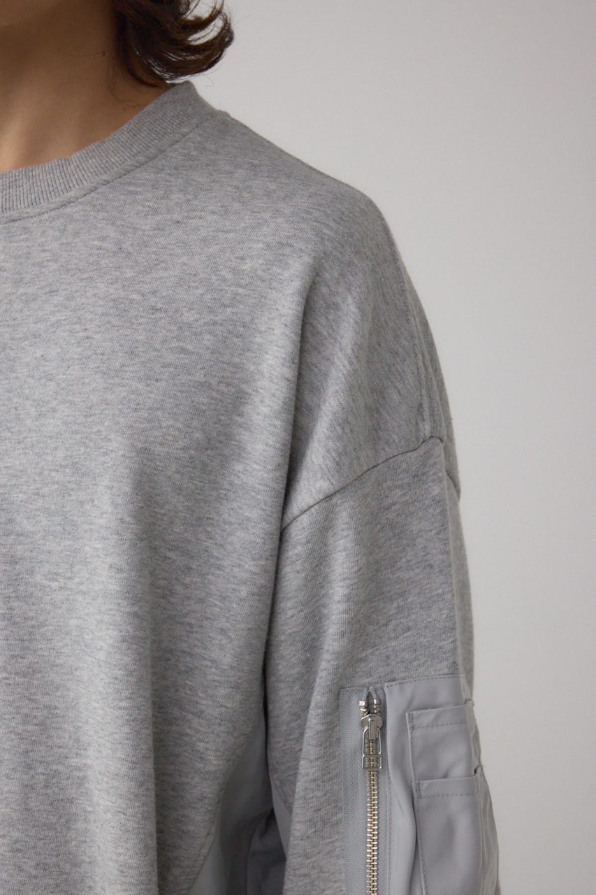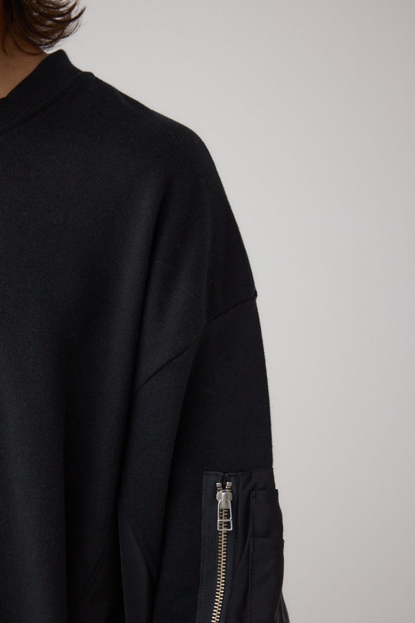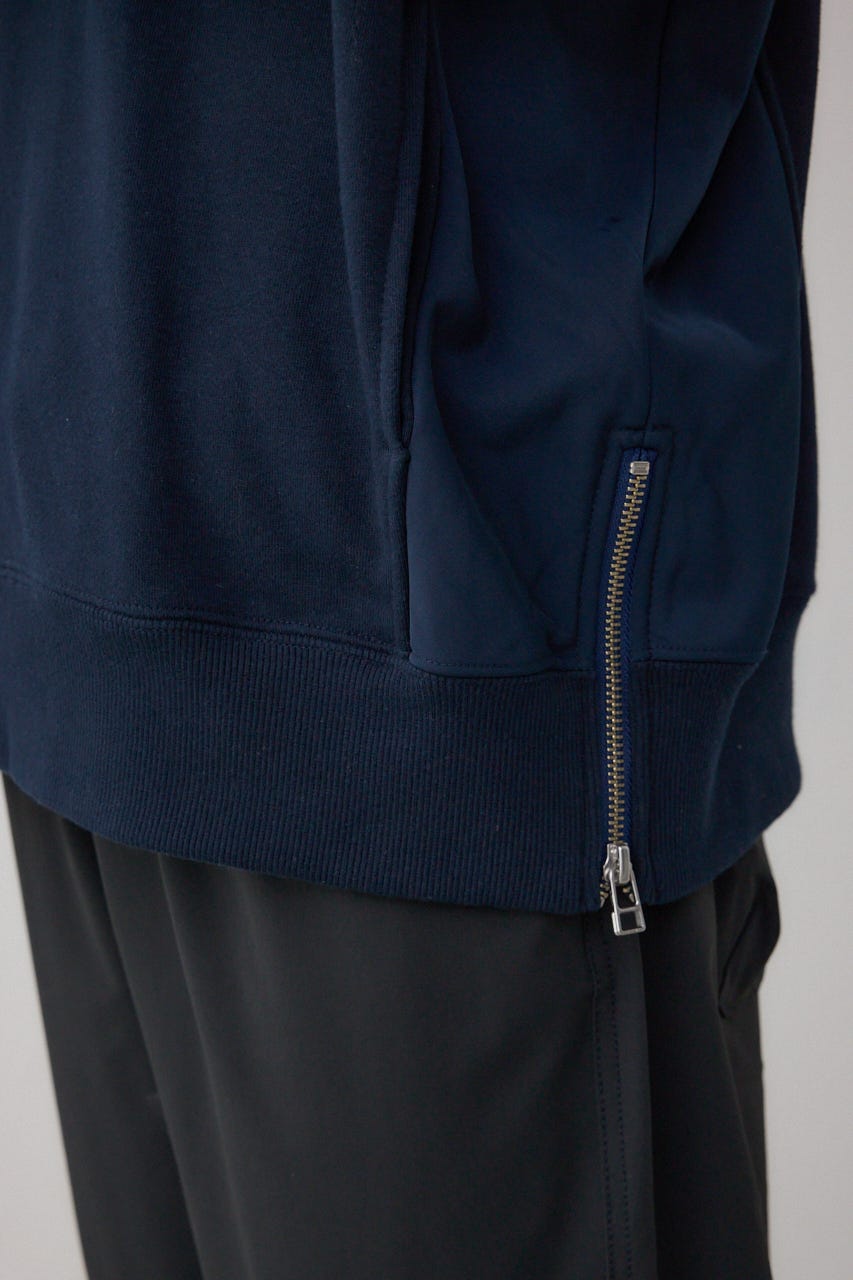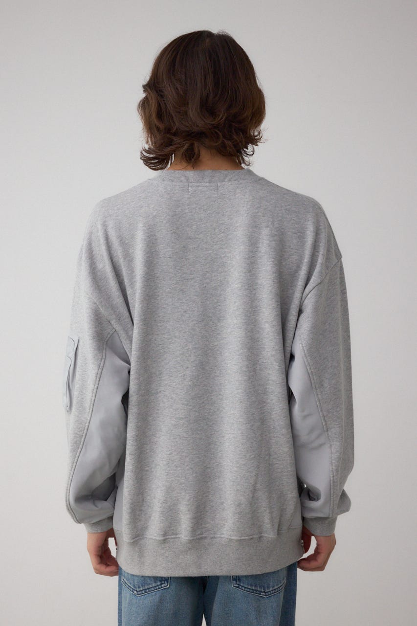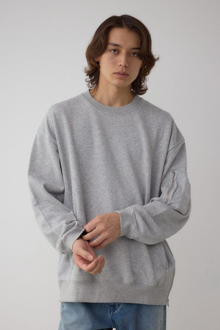 裏毛スウェットとやや光沢のある布帛をドッキングしたプルオーバー。