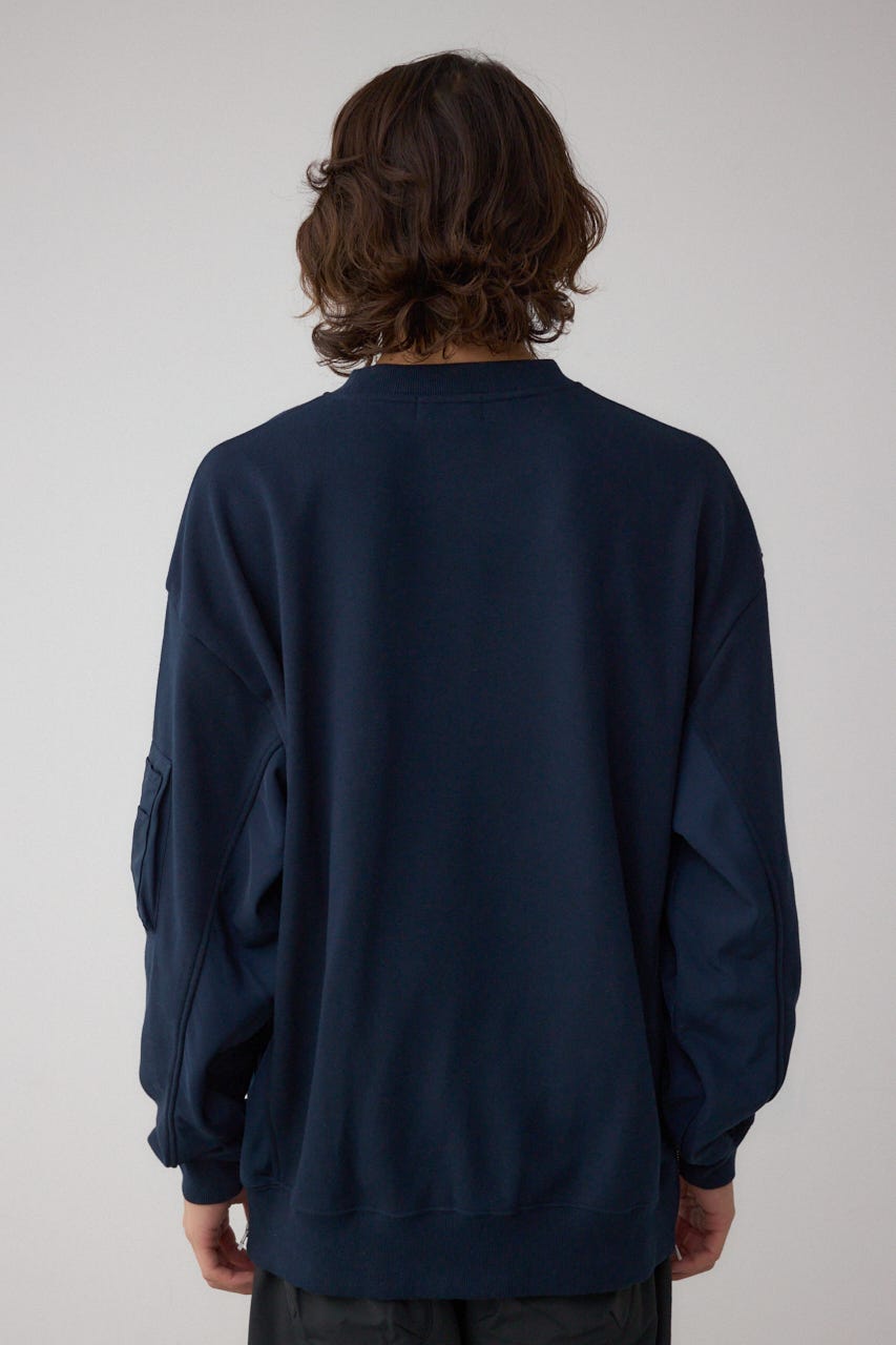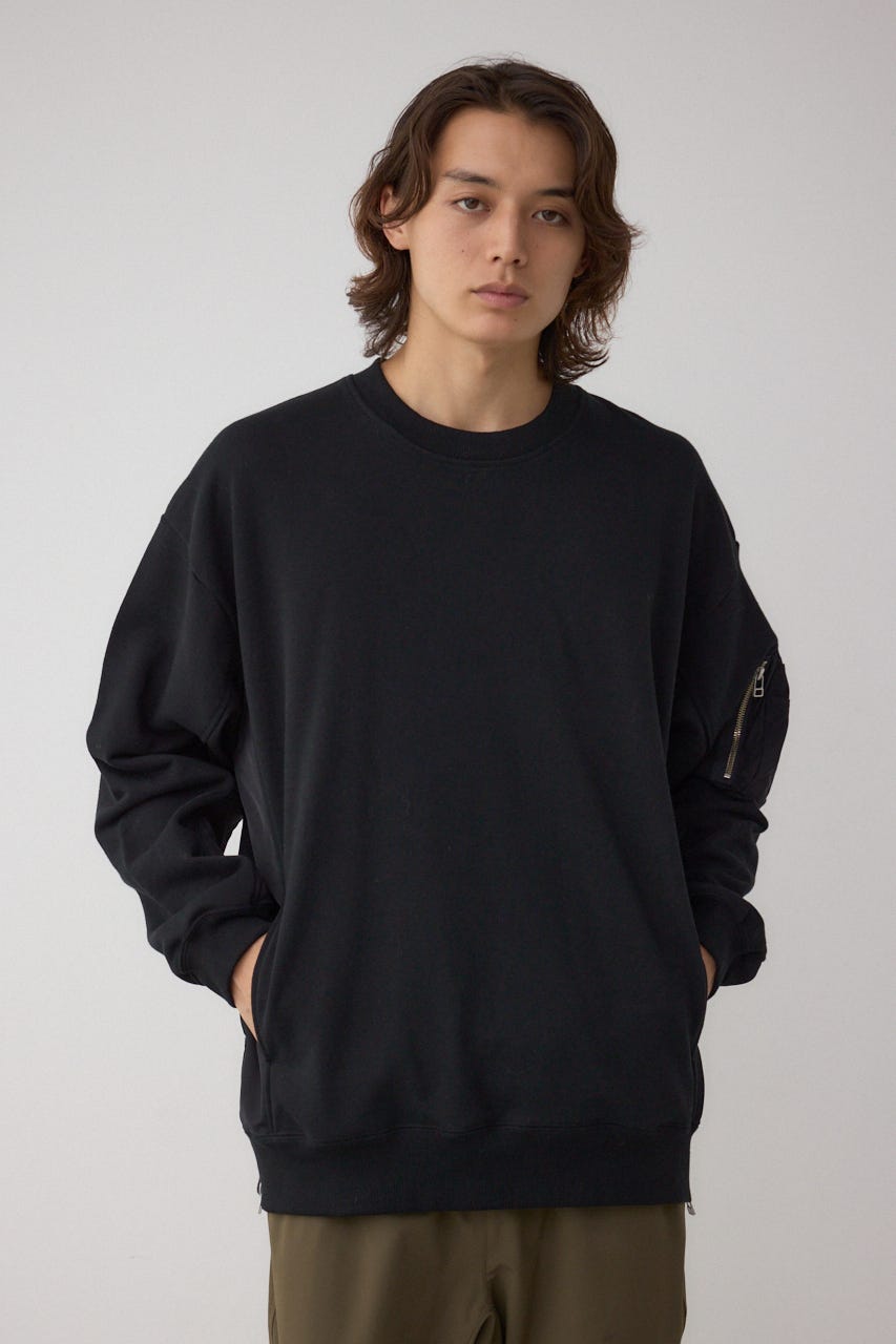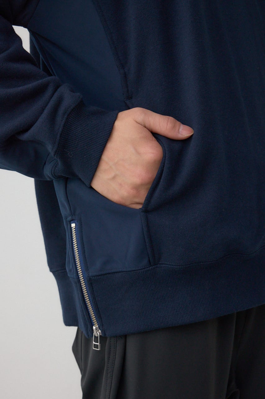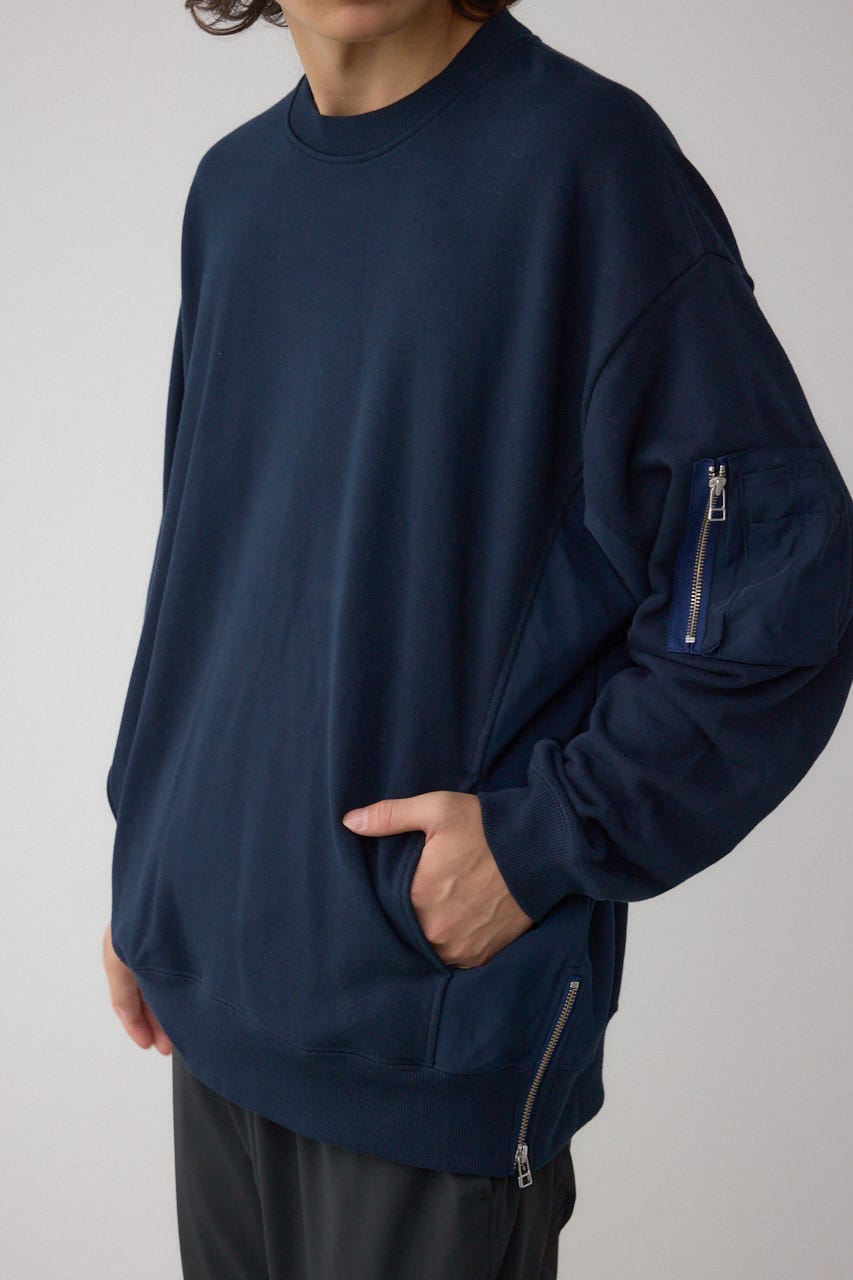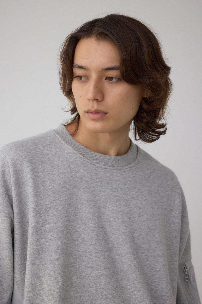 裏毛スウェットとやや光沢のある布帛をドッキングしたプルオーバー。
