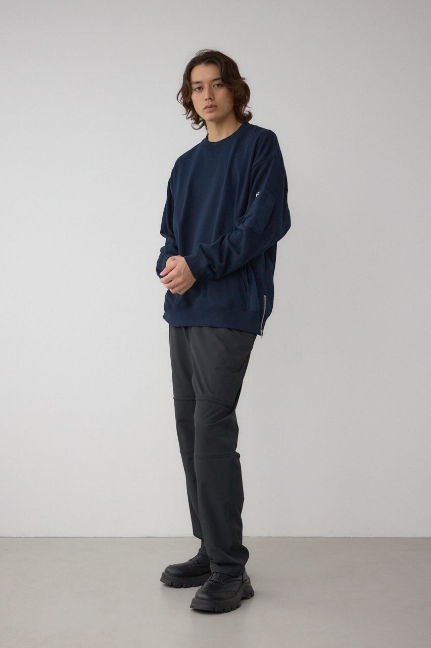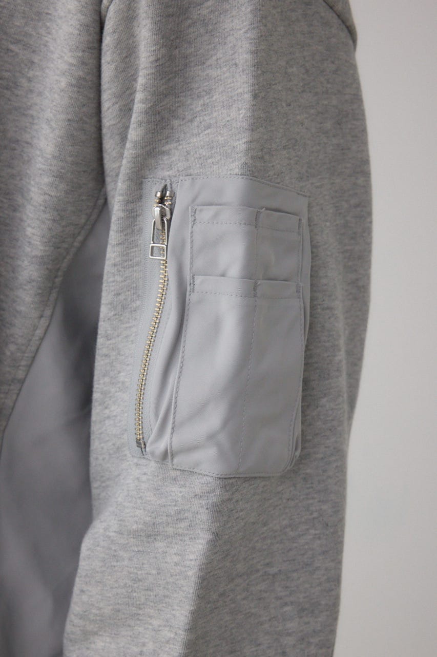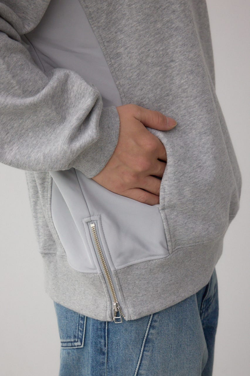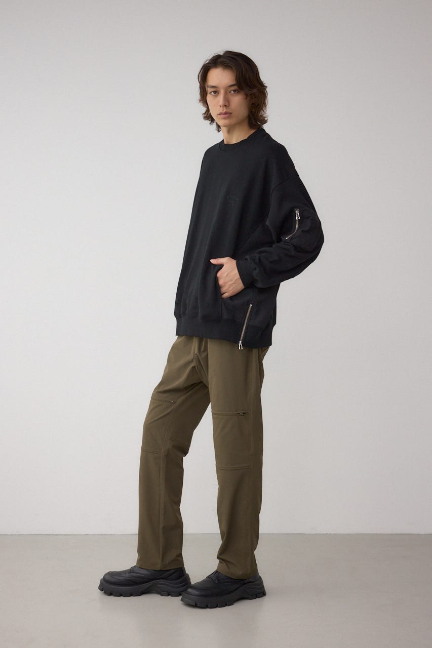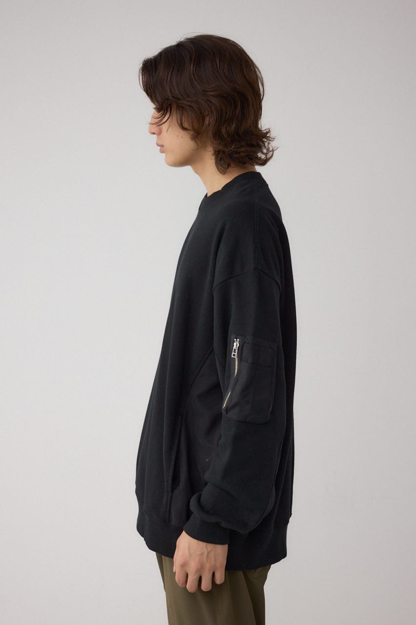 裏毛スウェットとやや光沢のある布帛をドッキングしたプルオーバー。