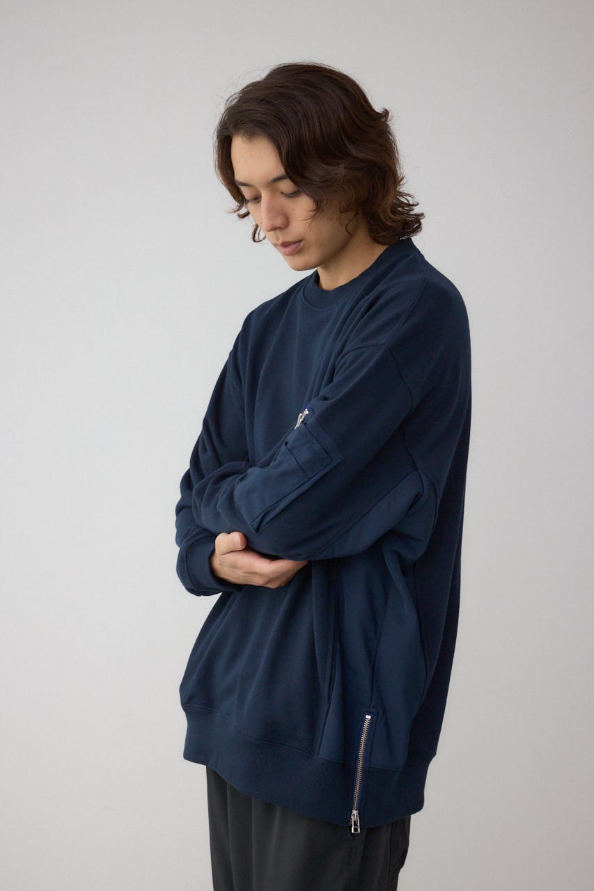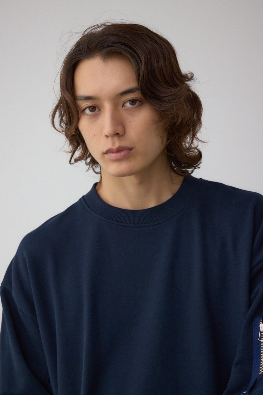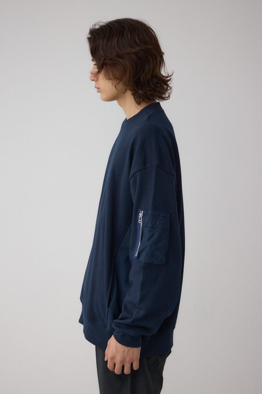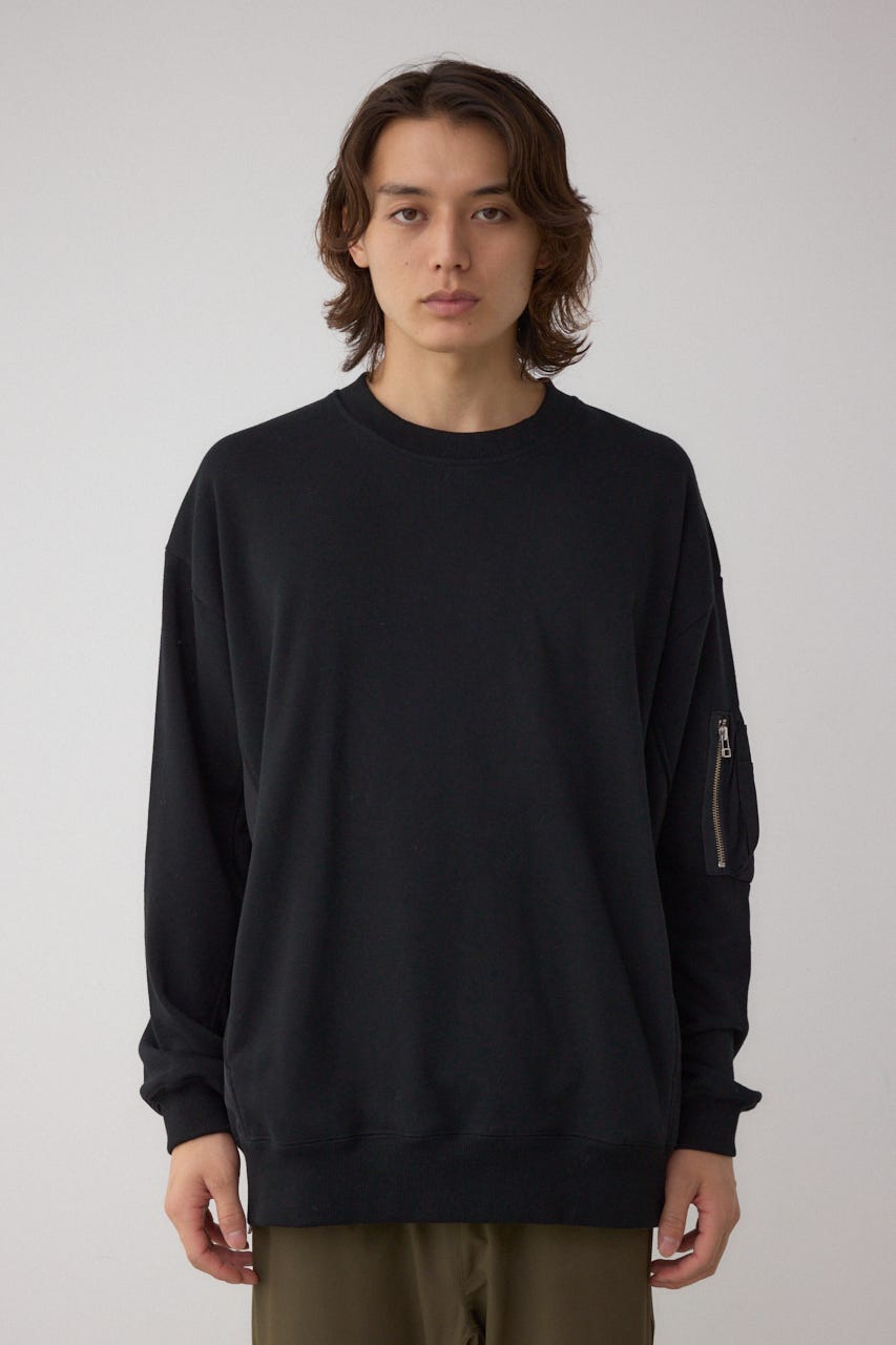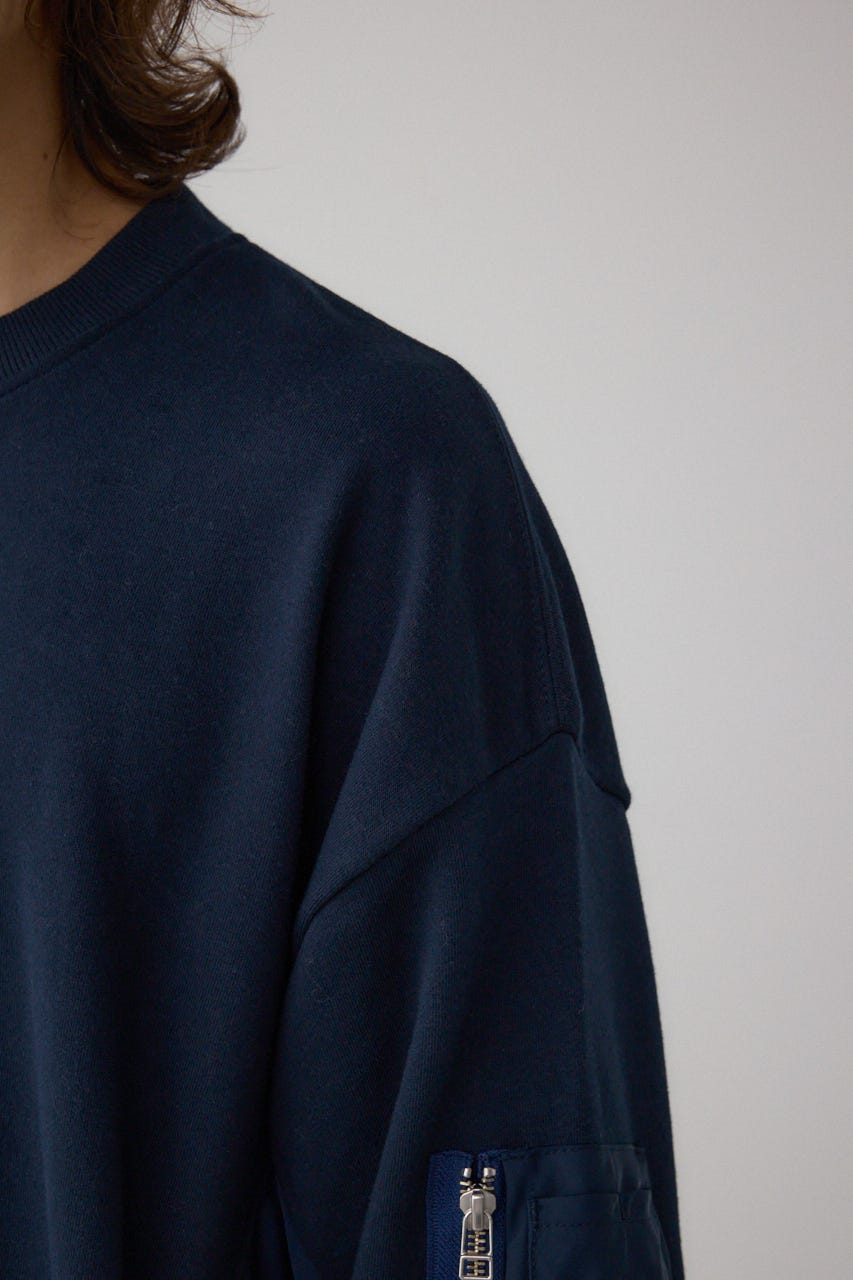 裏毛スウェットとやや光沢のある布帛をドッキングしたプルオーバー。