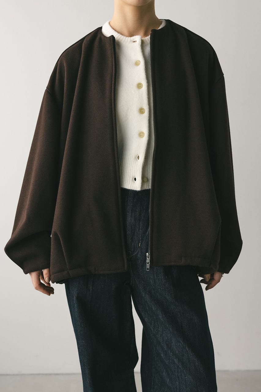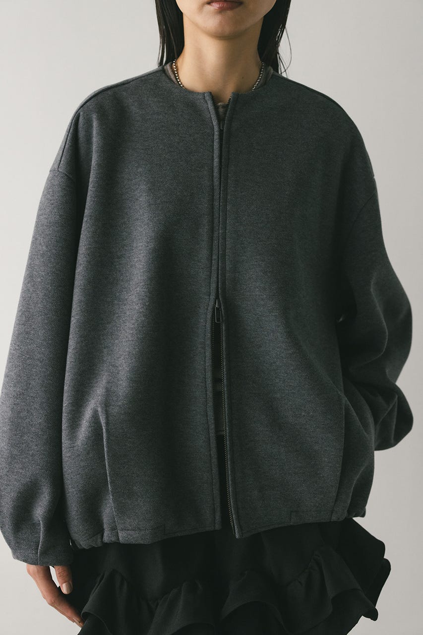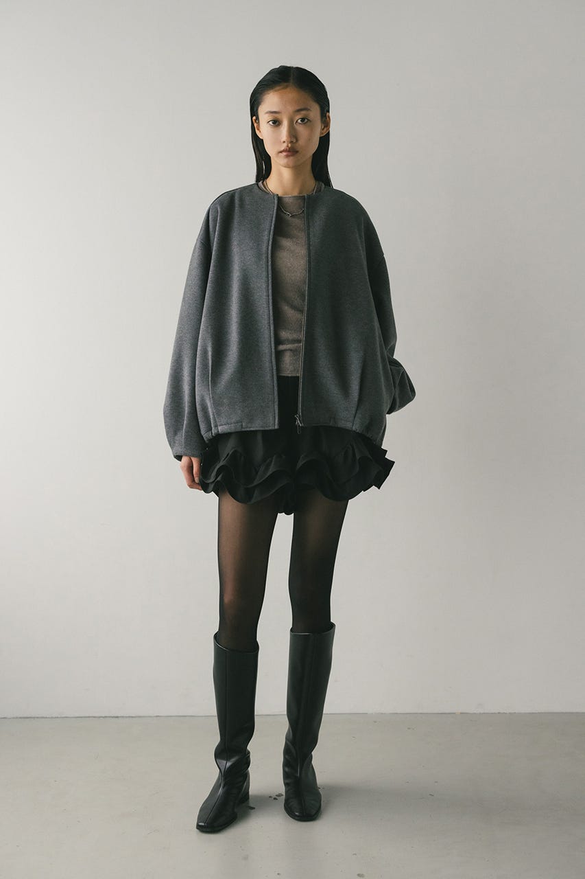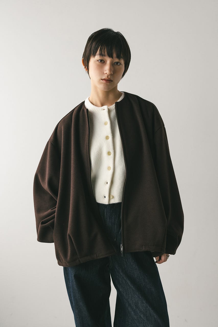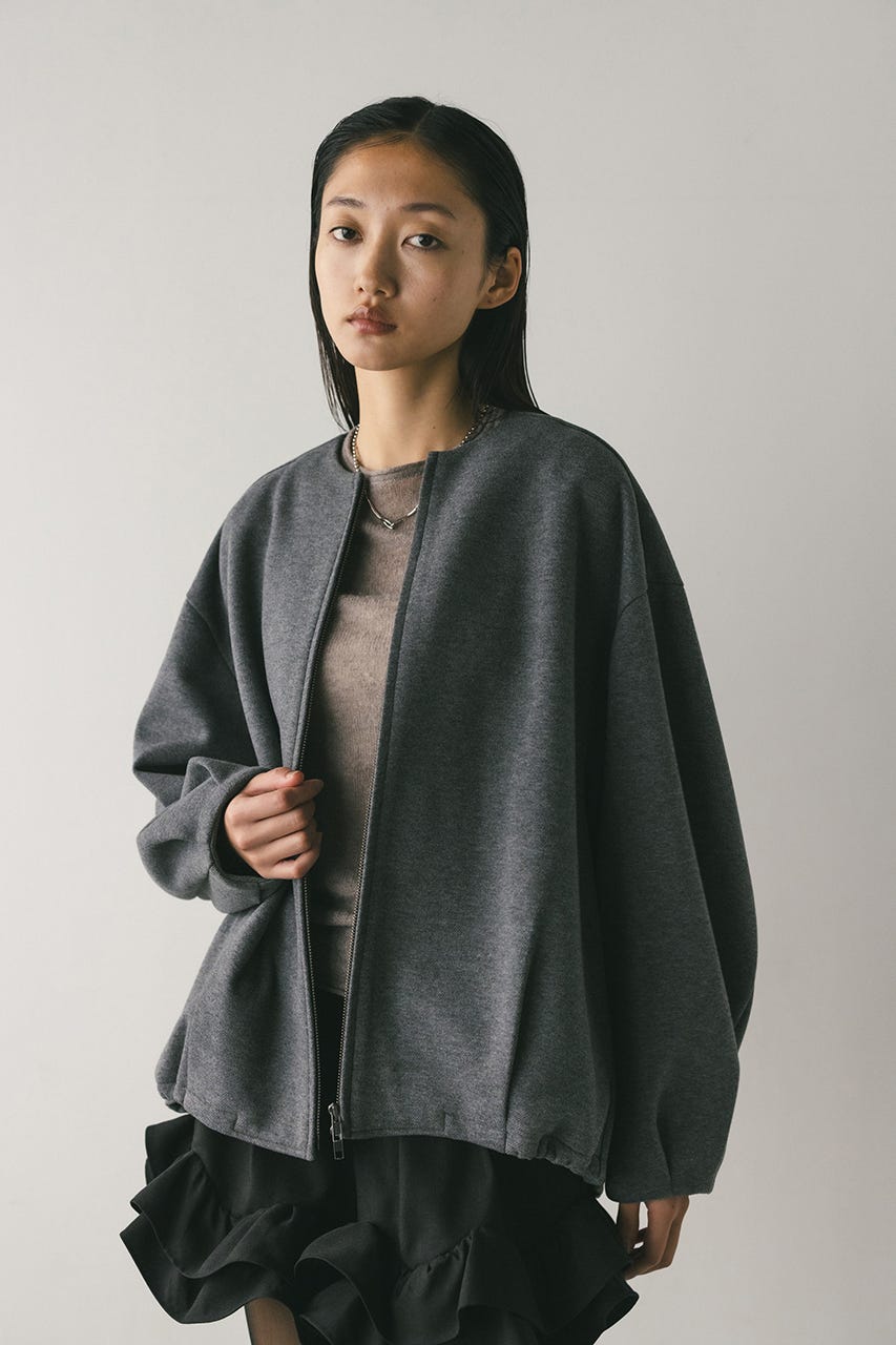 モードで上品な印象のクルーネックと、裾と袖口に入ったタックデザインが作るフォルムがスタミキらしいノーカラーブルゾン。