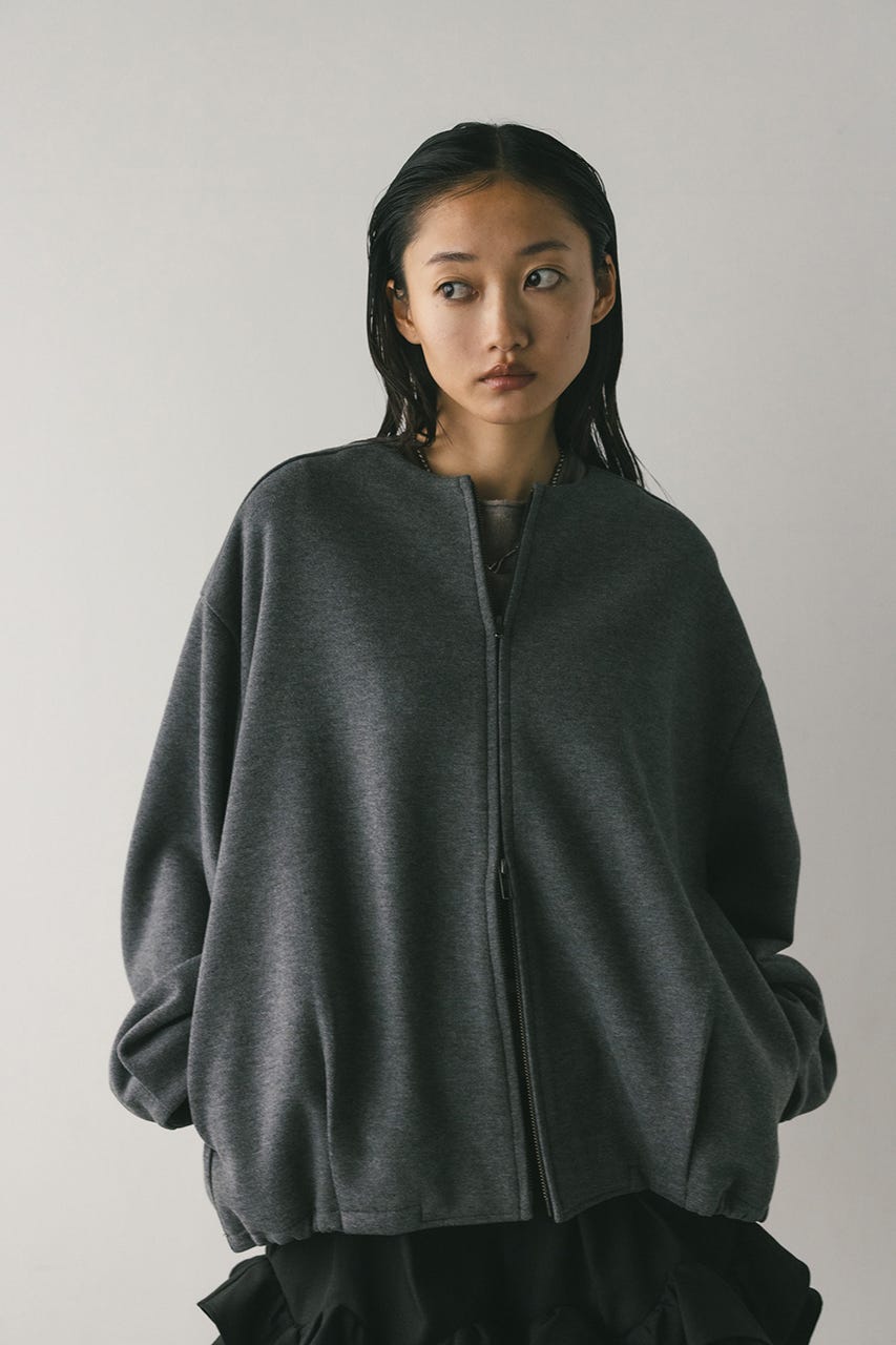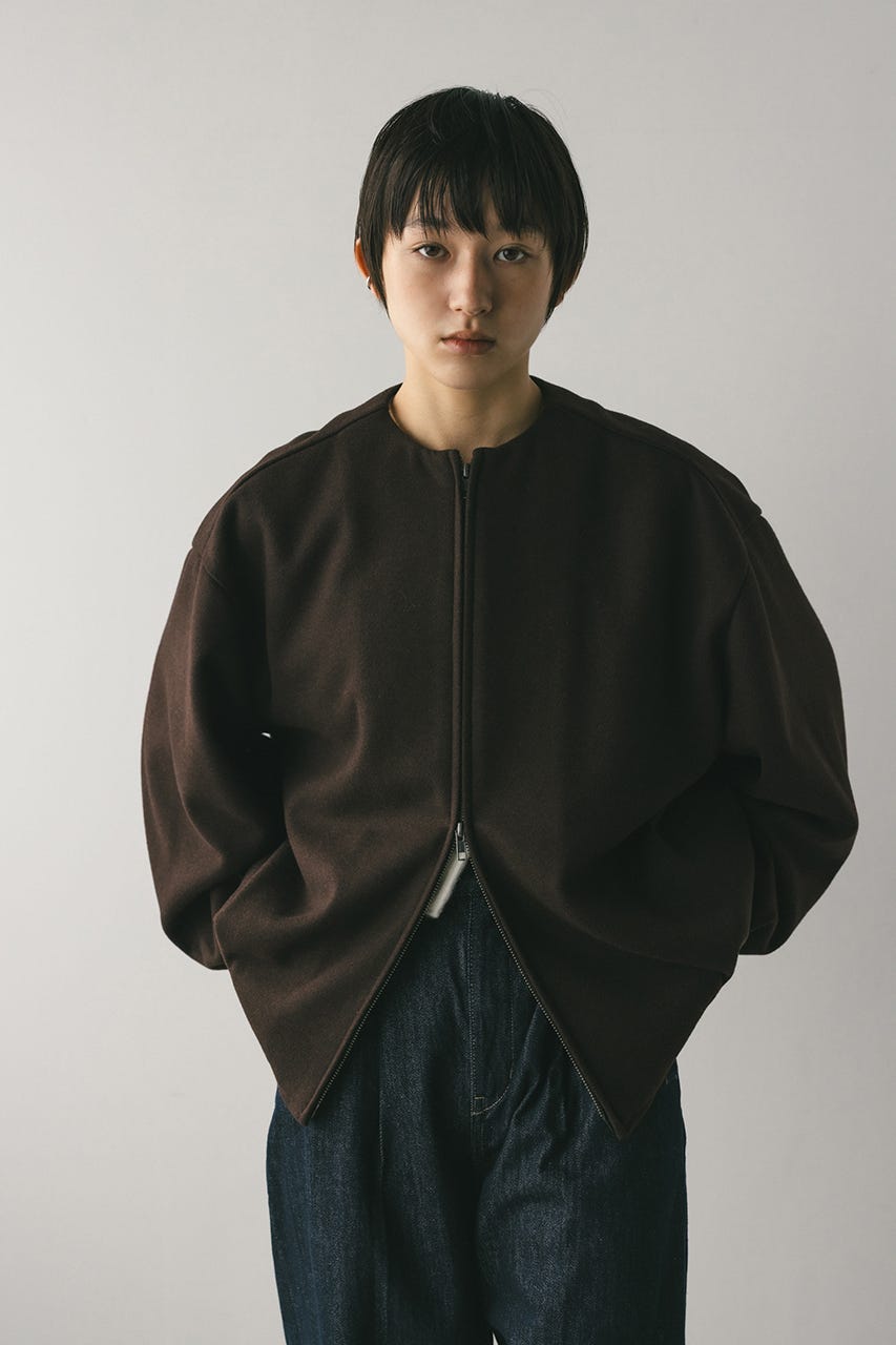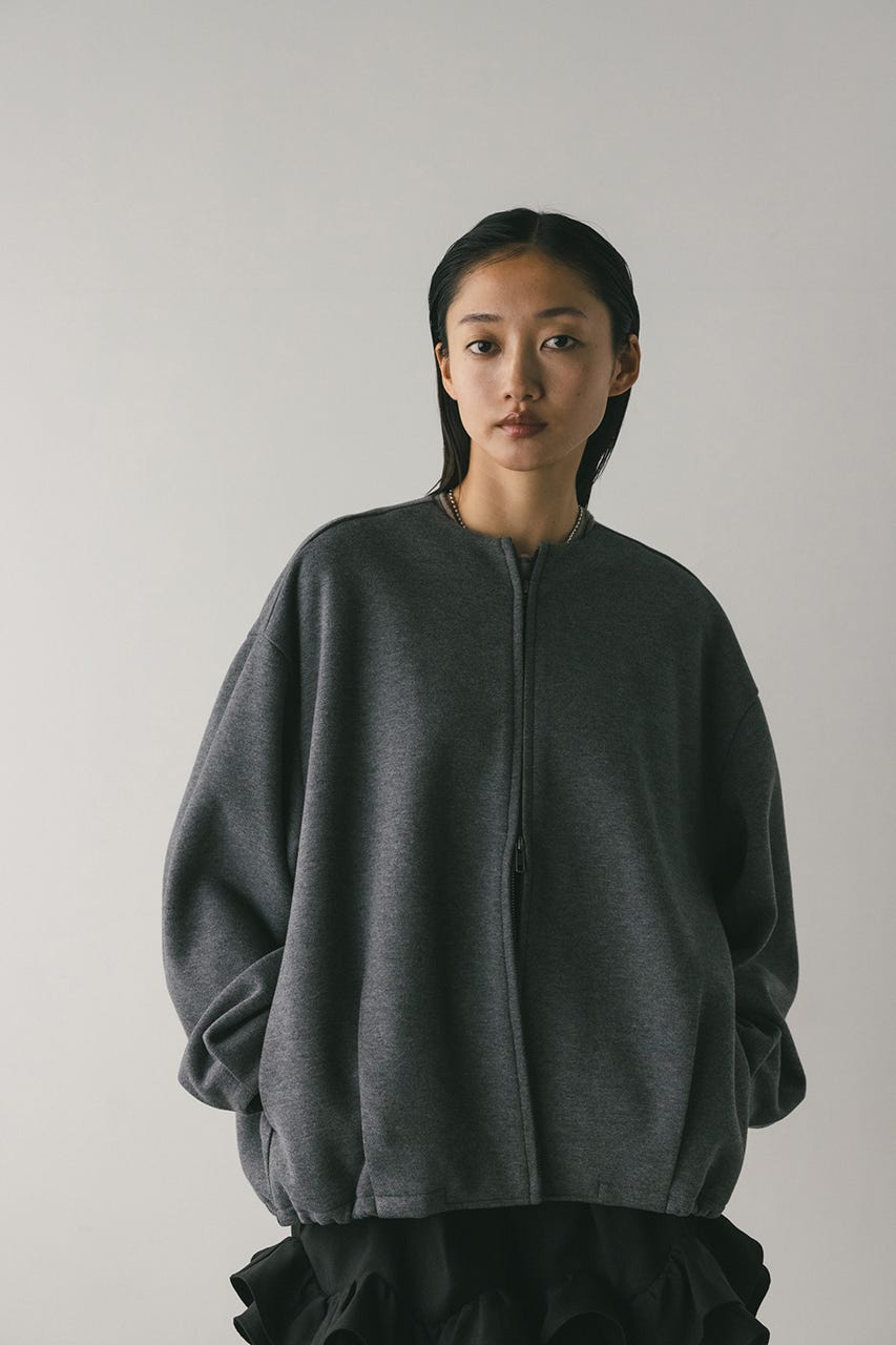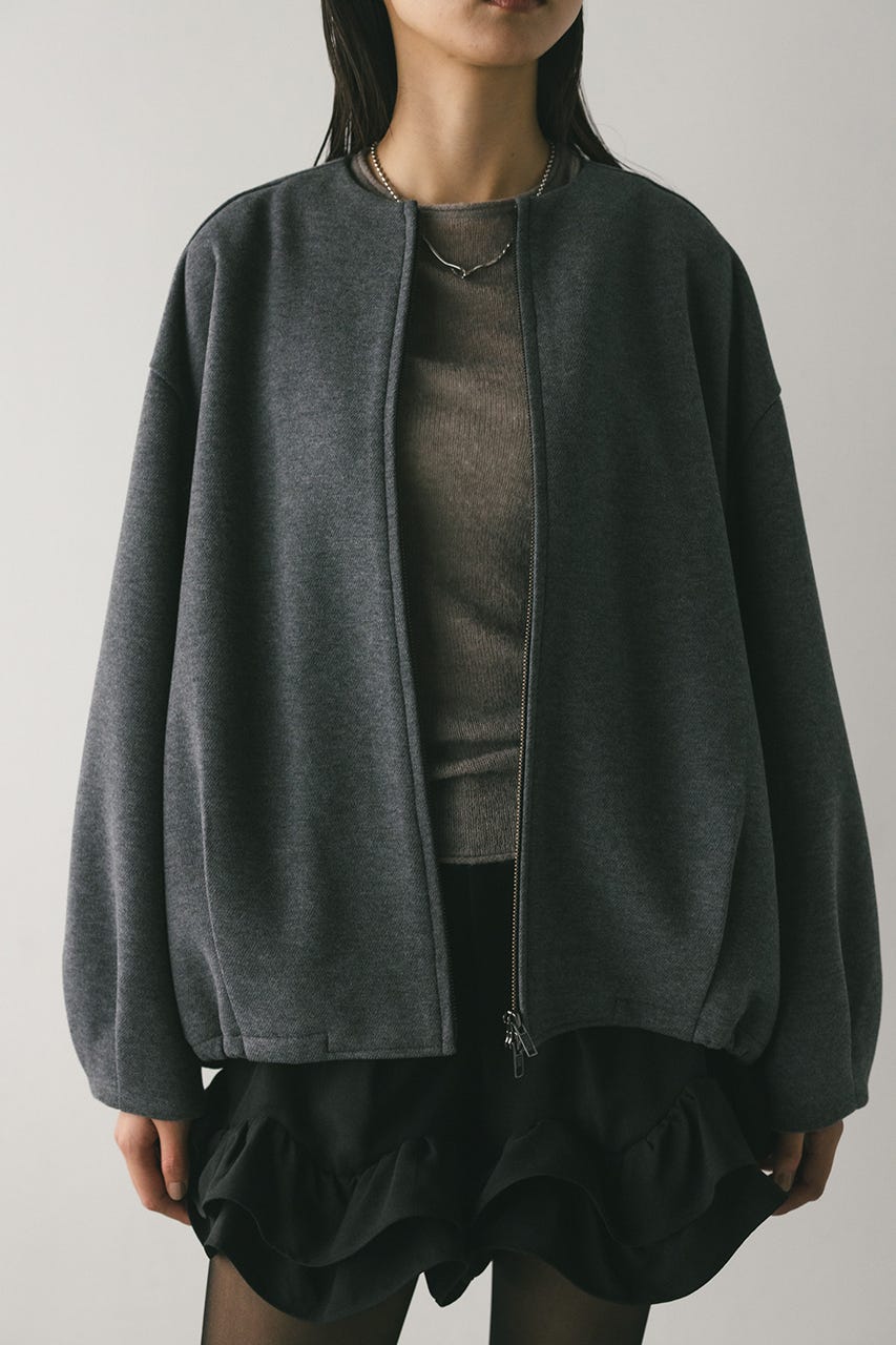 モードで上品な印象のクルーネックと、裾と袖口に入ったタックデザインが作るフォルムがスタミキらしいノーカラーブルゾン。
