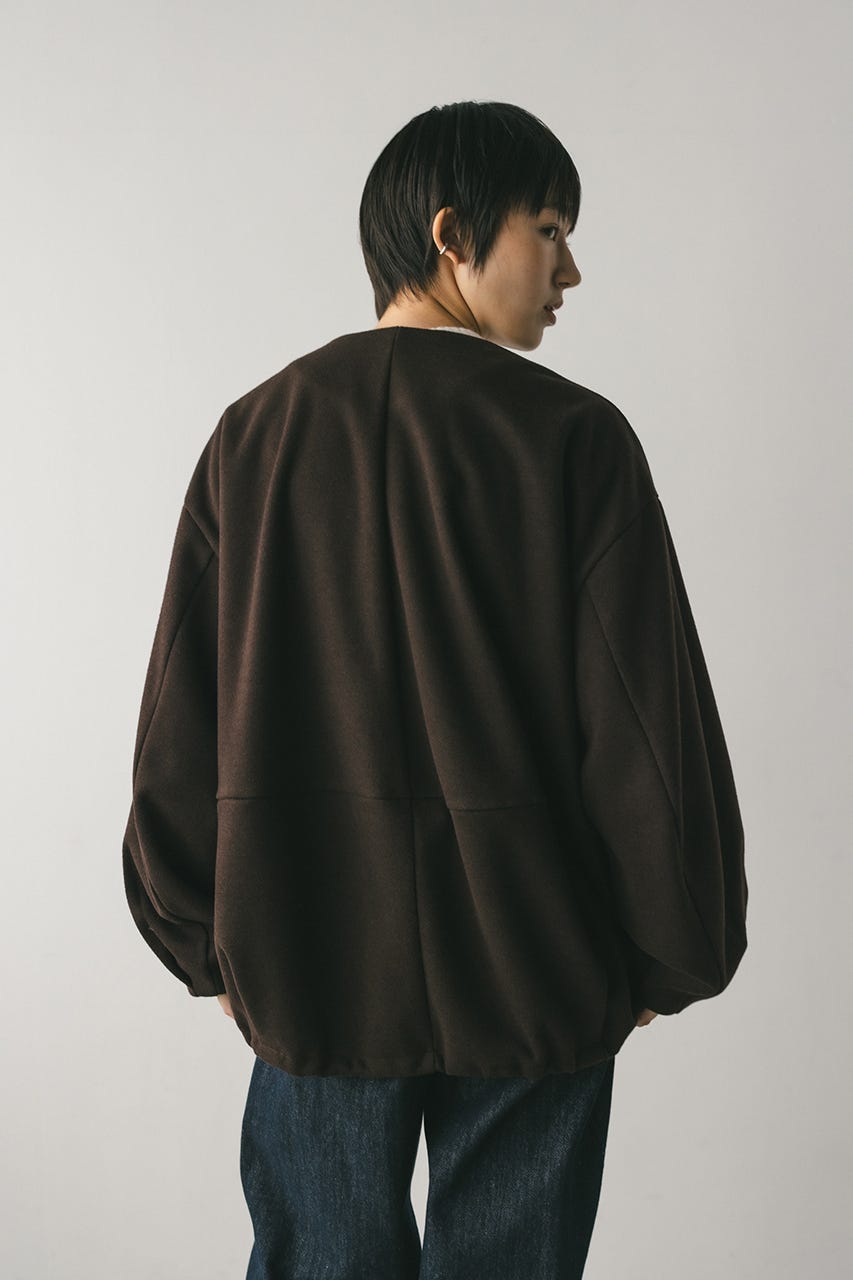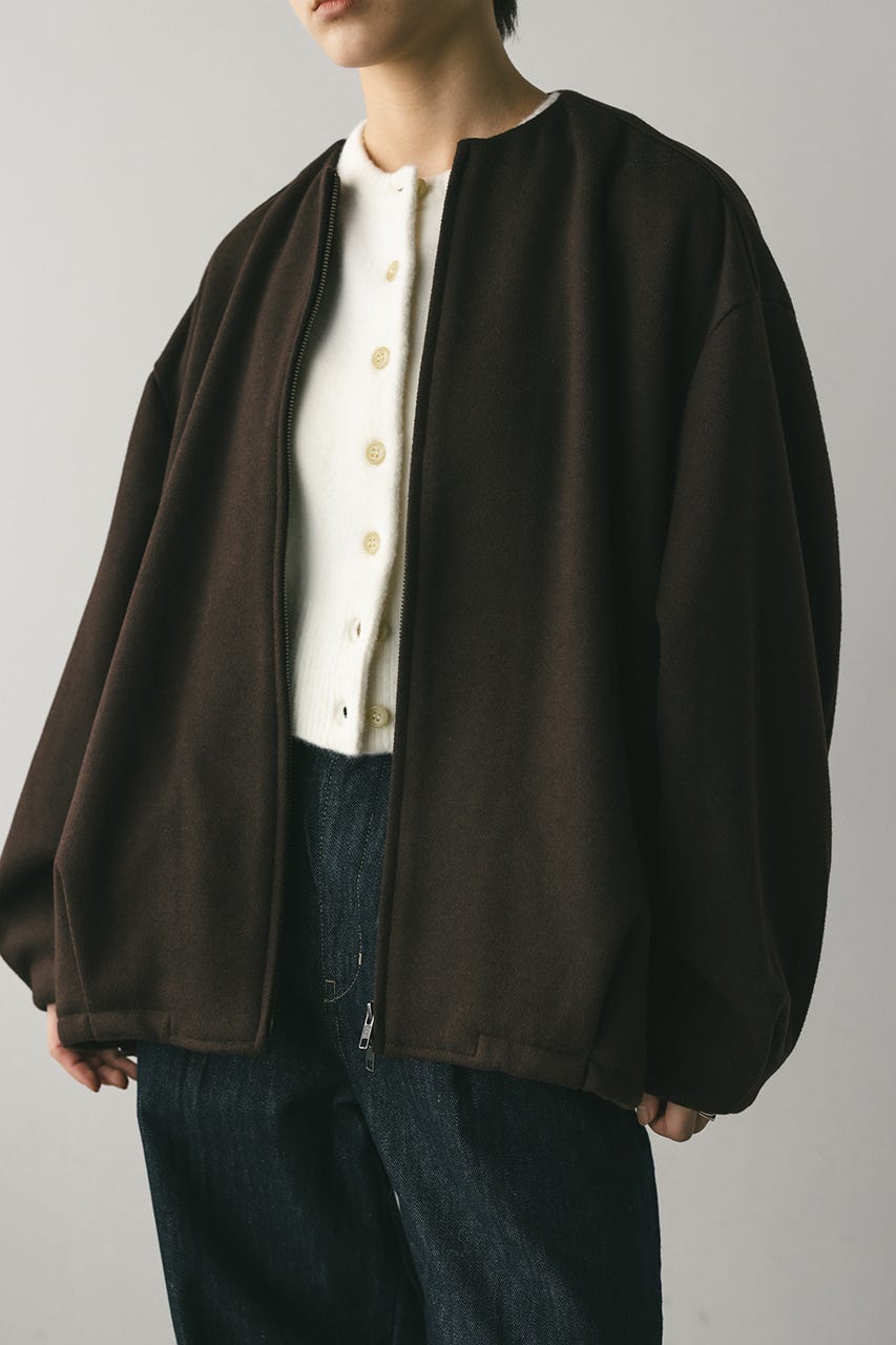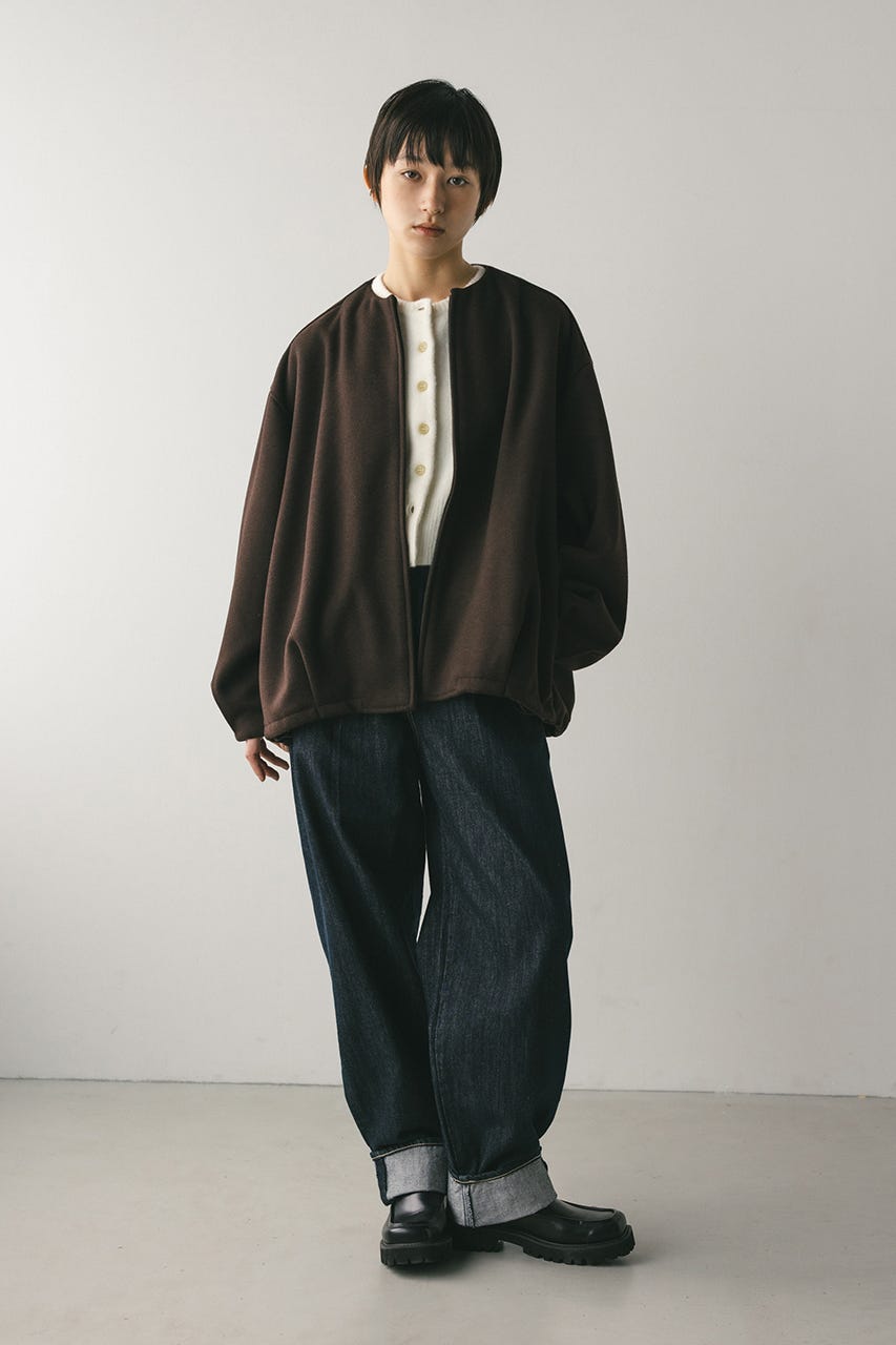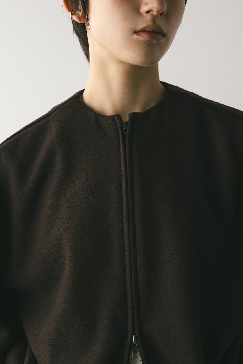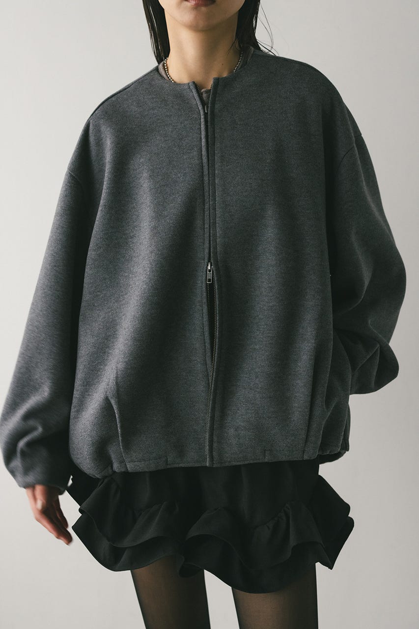 モードで上品な印象のクルーネックと、裾と袖口に入ったタックデザインが作るフォルムがスタミキらしいノーカラーブルゾン。