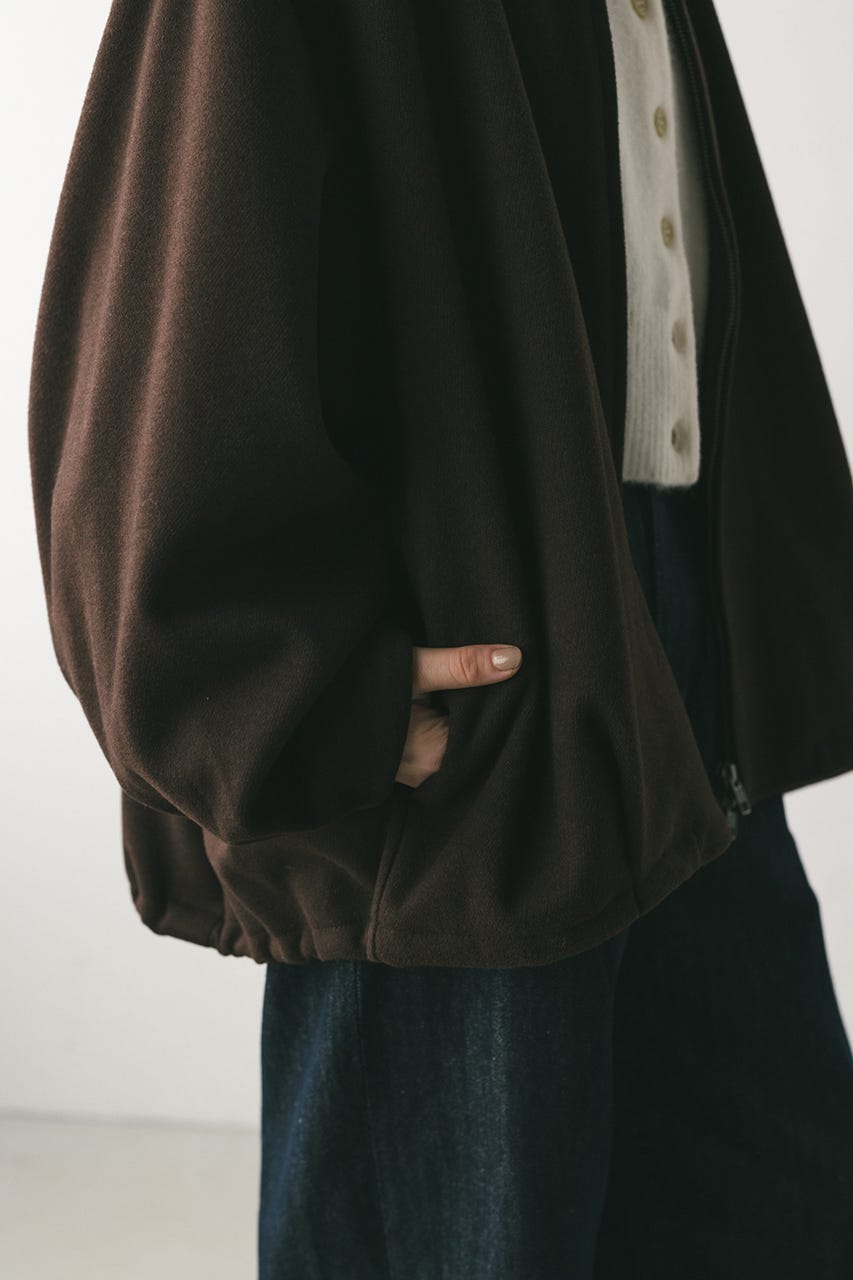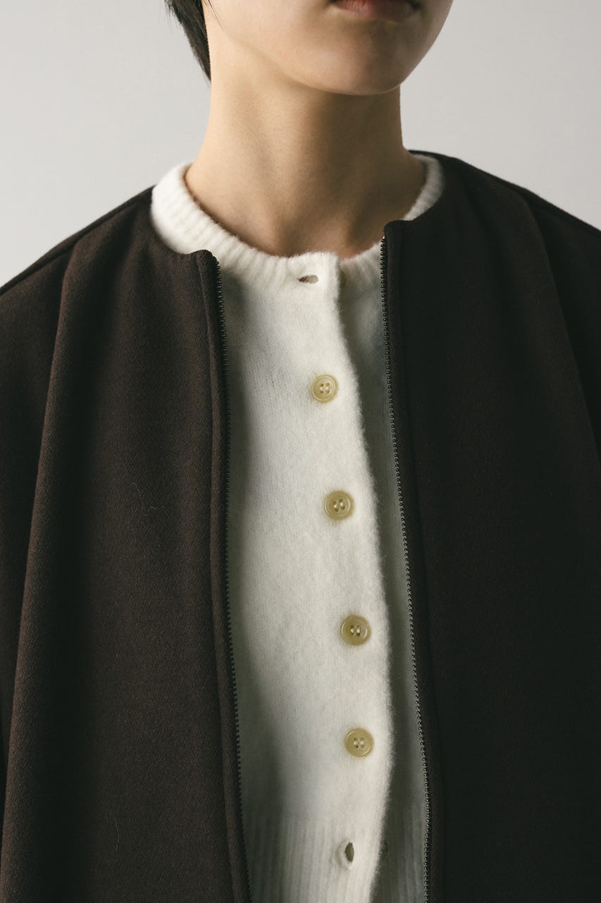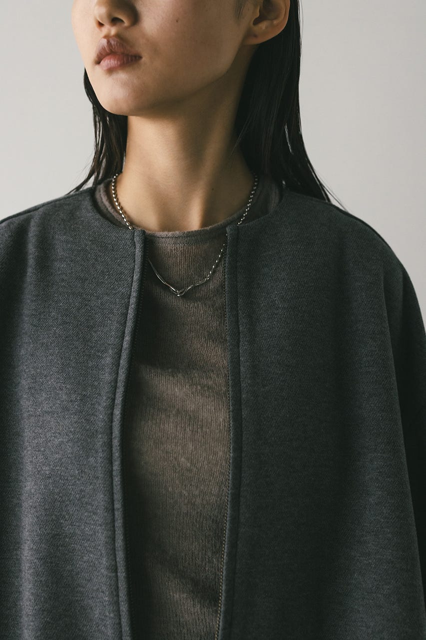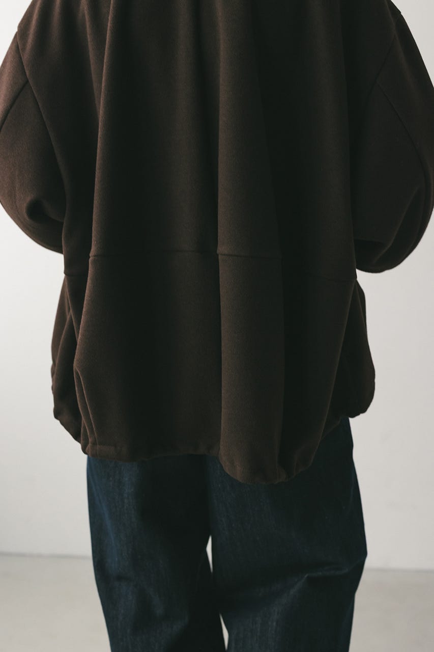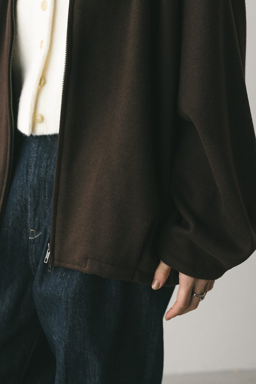 モードで上品な印象のクルーネックと、裾と袖口に入ったタックデザインが作るフォルムがスタミキらしいノーカラーブルゾン。