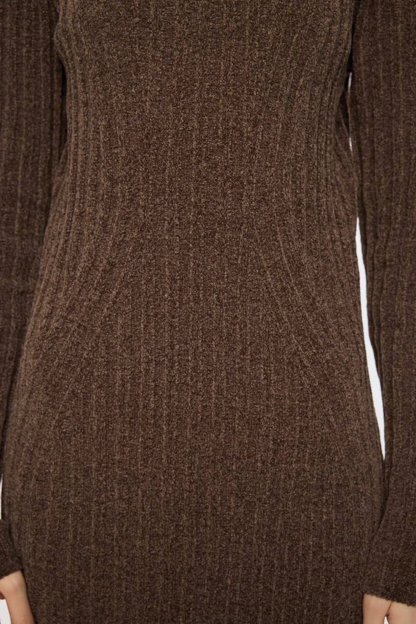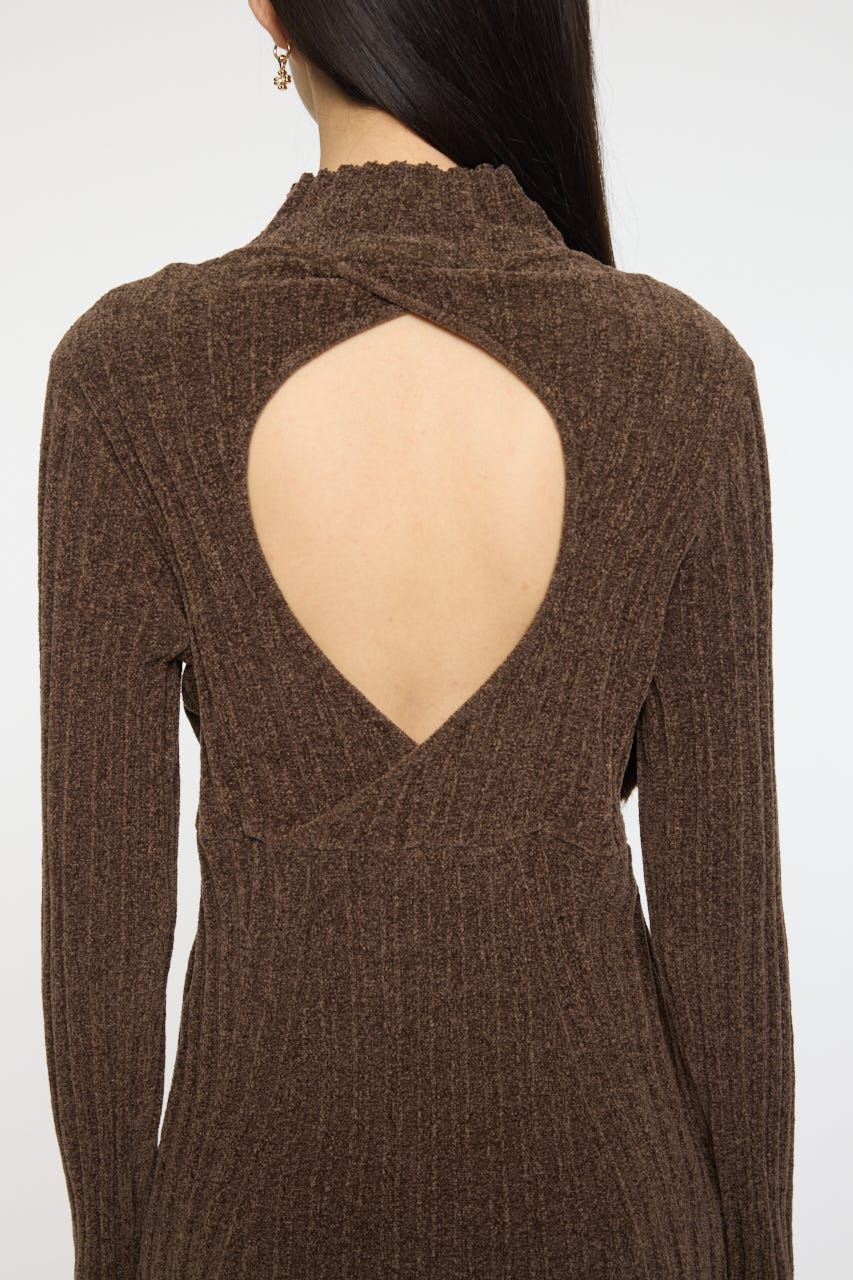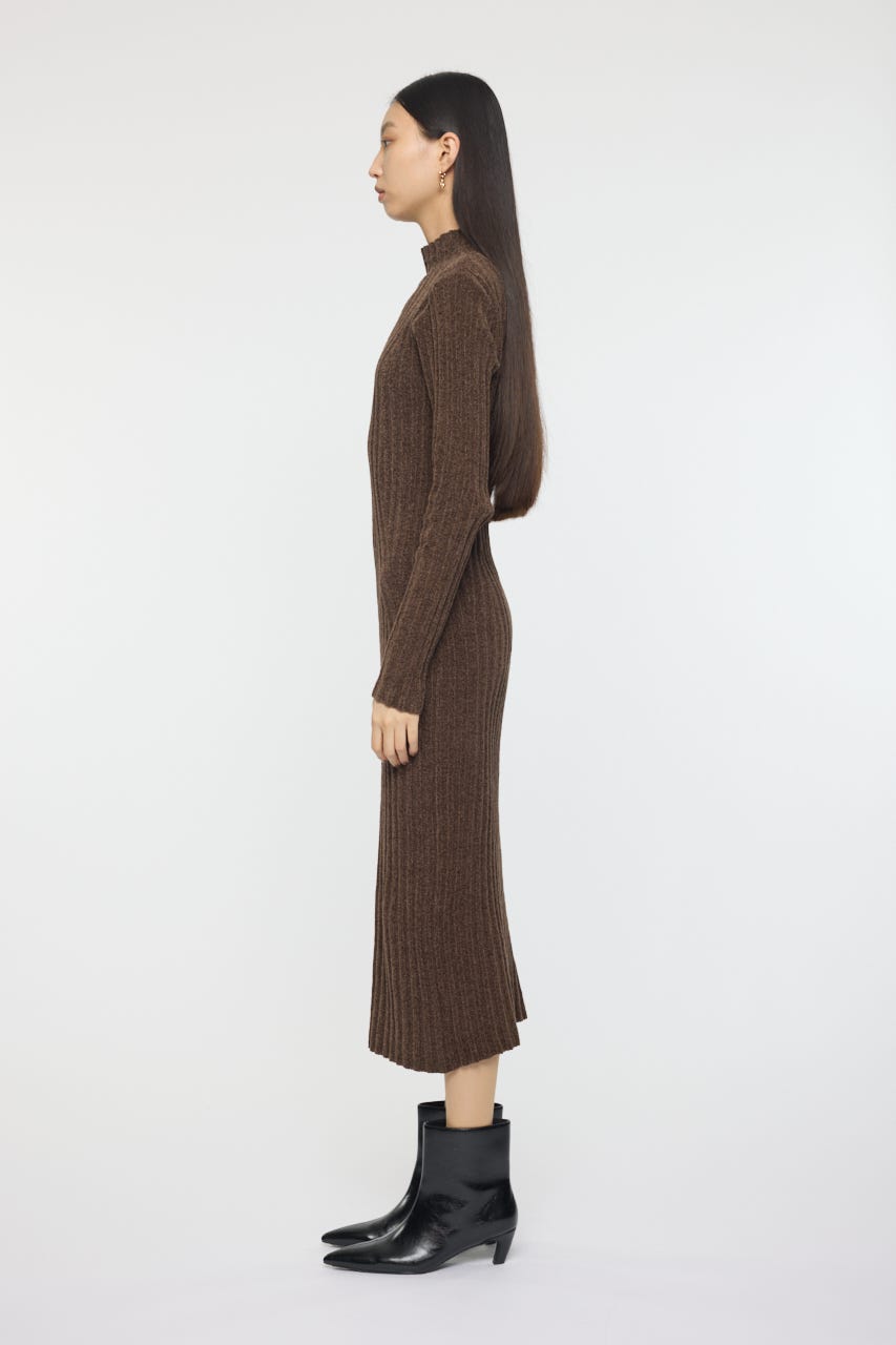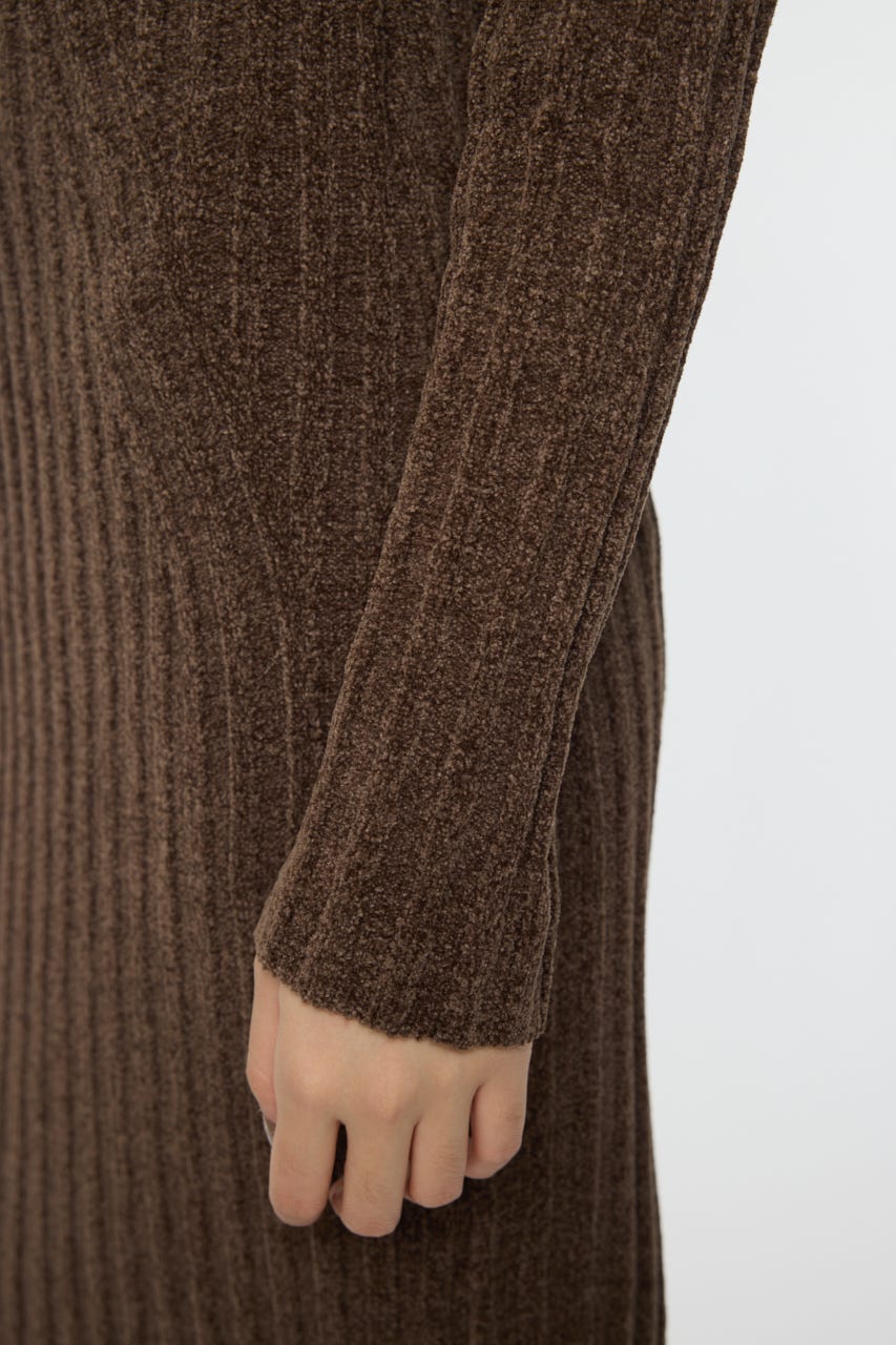 ベロアタッチの糸で編み立てたリブニットワンピース。
