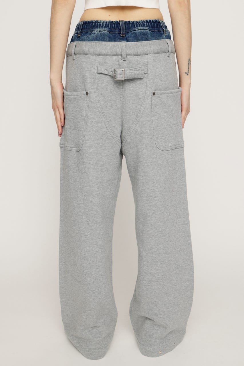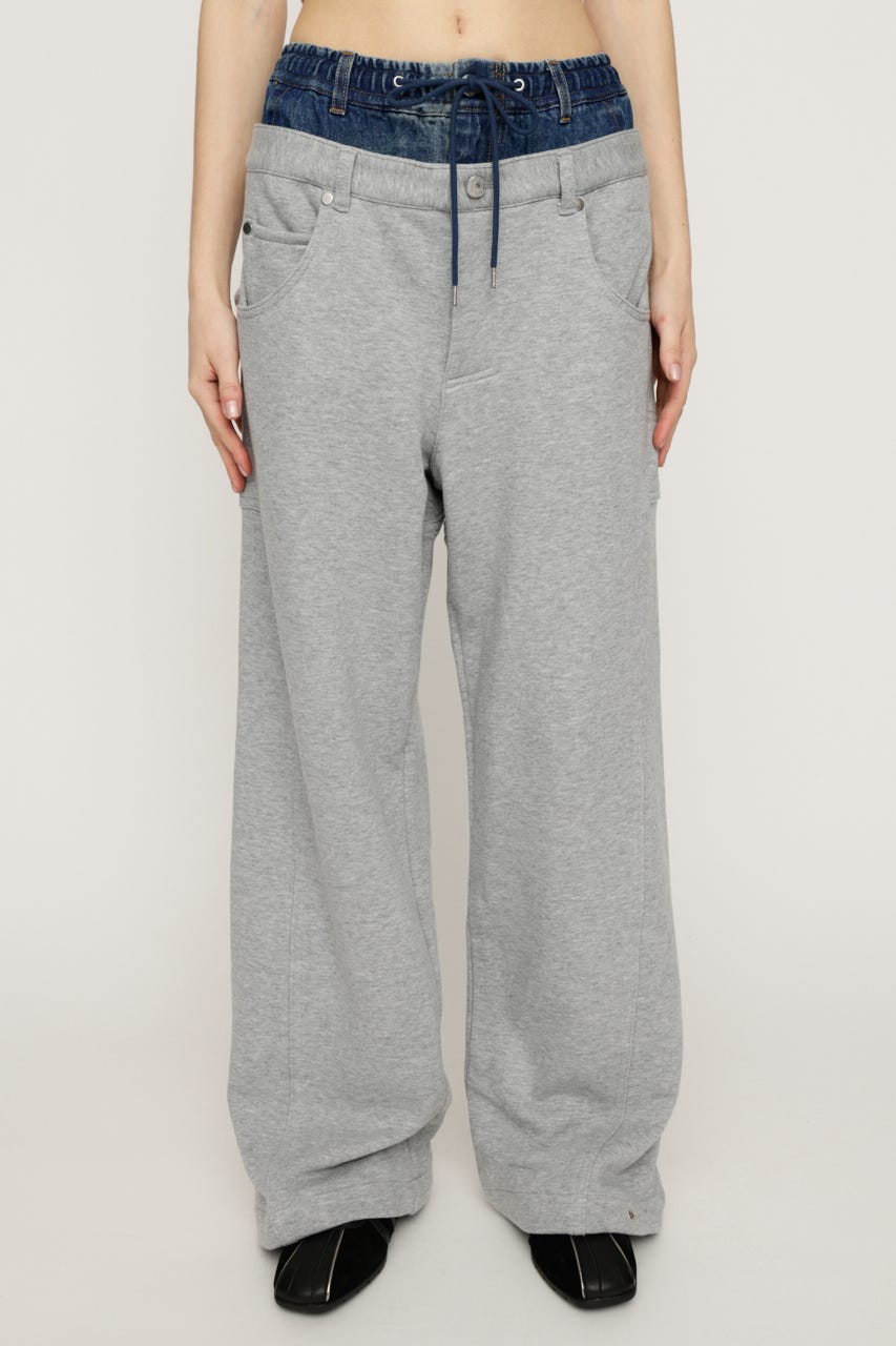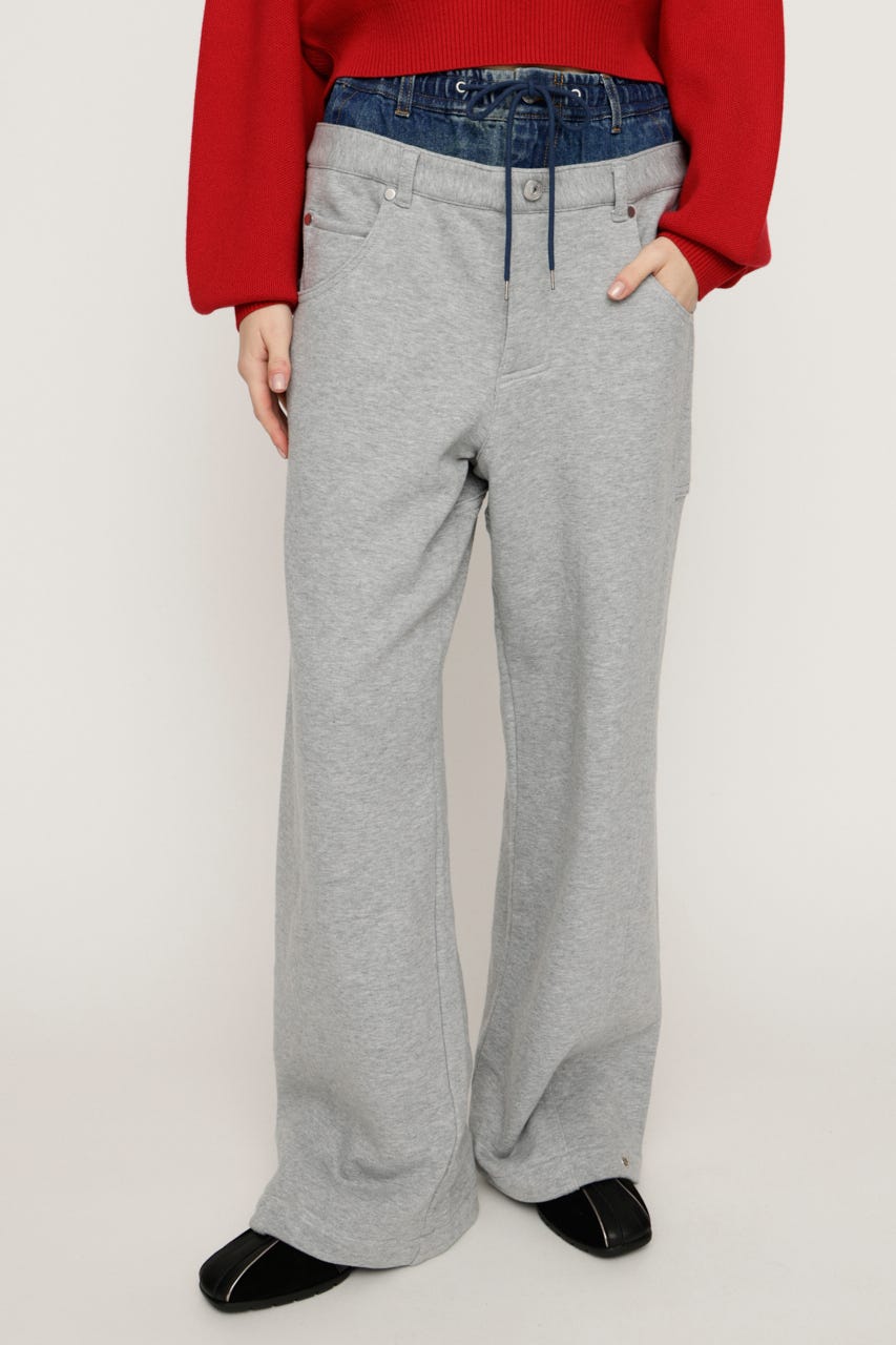 スウェットパンツにデニムをレイヤードしたようなウエストデザインが目を惹くワイドパンツ。