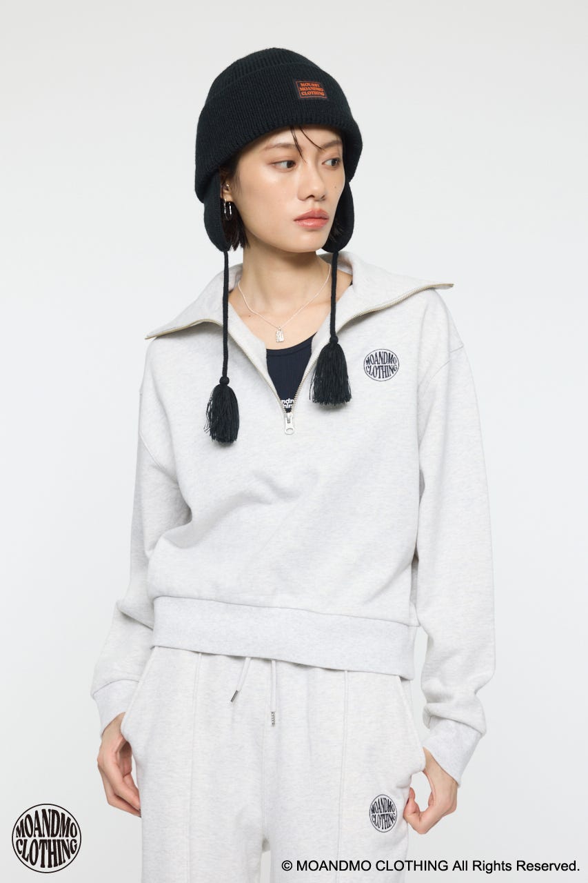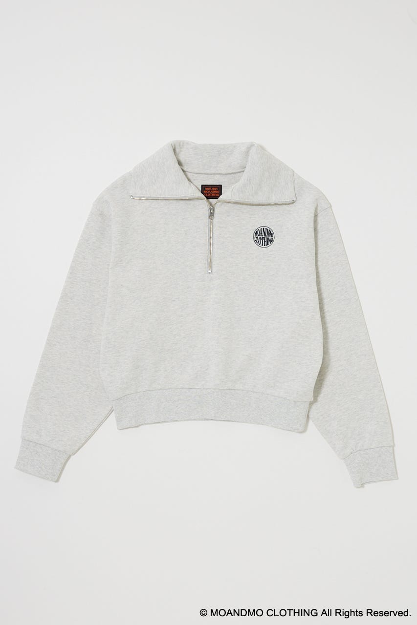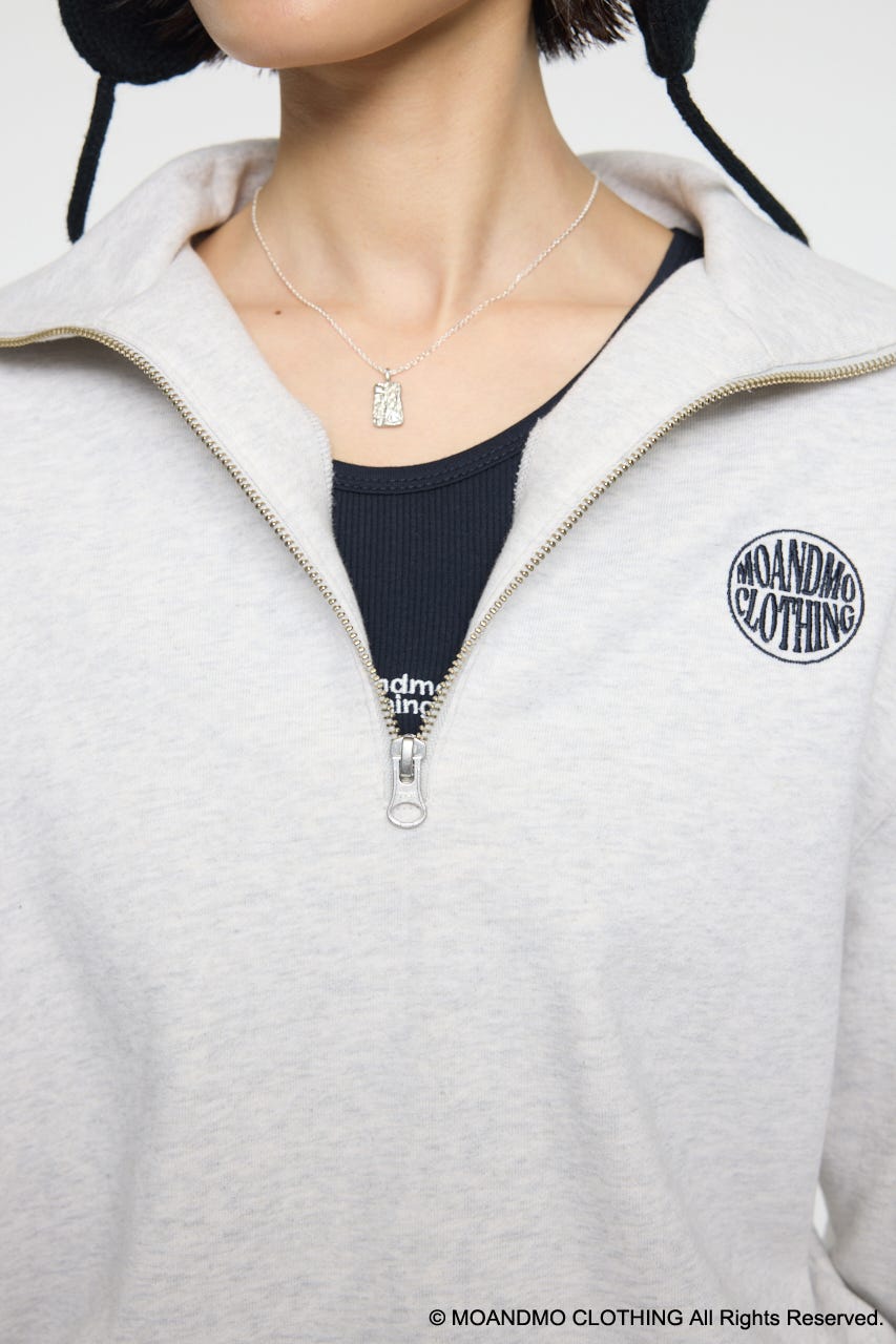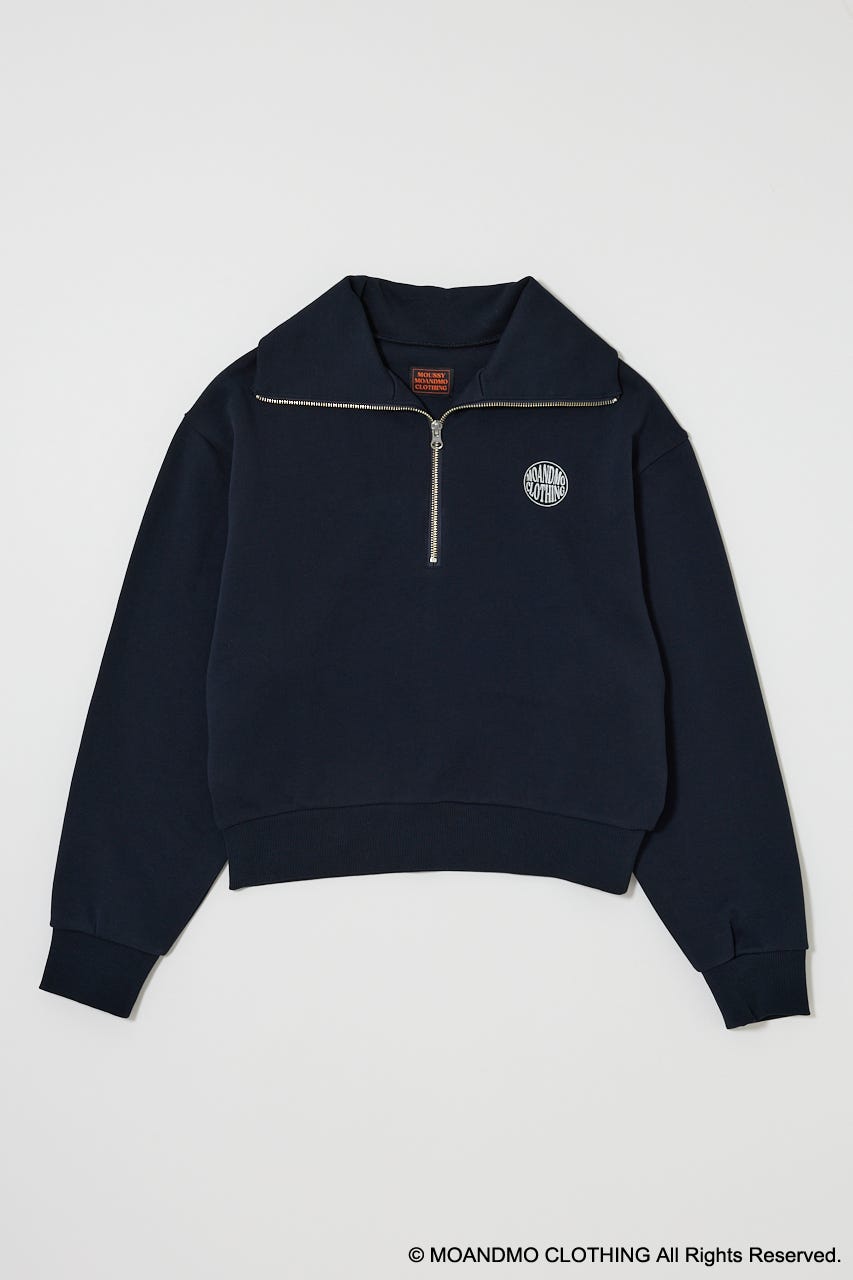 ビッグカラーのデザインが特徴のハーフジップスウェットトップス。フロントの〈MOANDMO©〉のロゴ刺繍がポイントです。