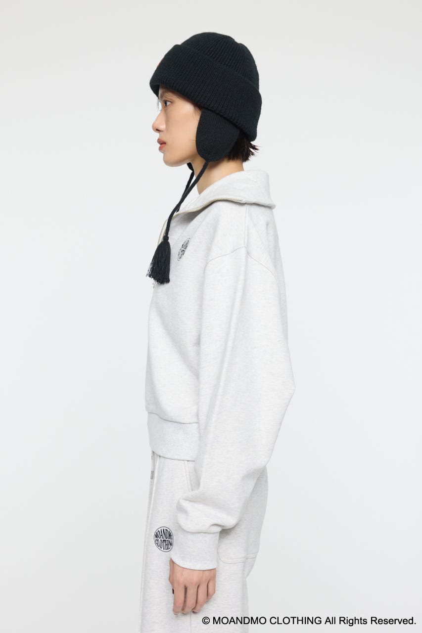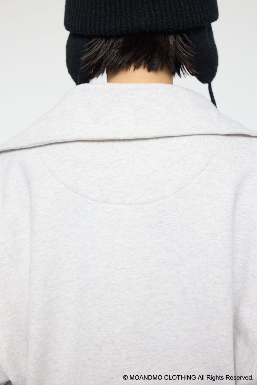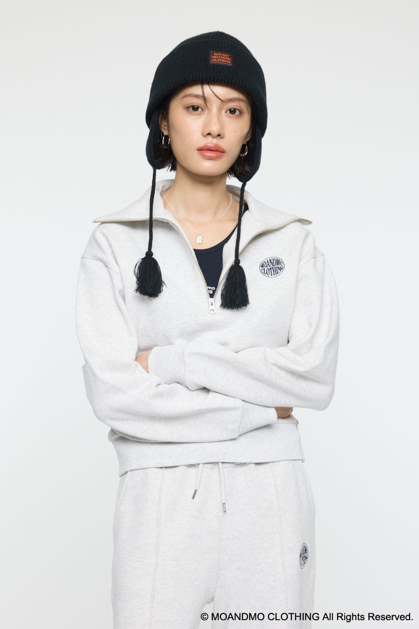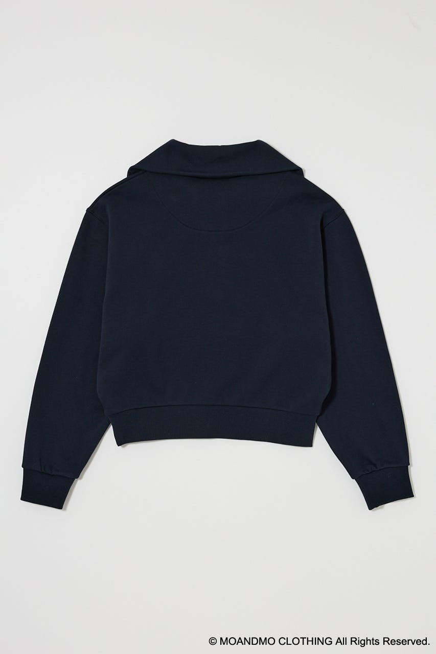ビッグカラーのデザインが特徴のハーフジップスウェットトップス。フロントの〈MOANDMO©〉のロゴ刺繍がポイントです。