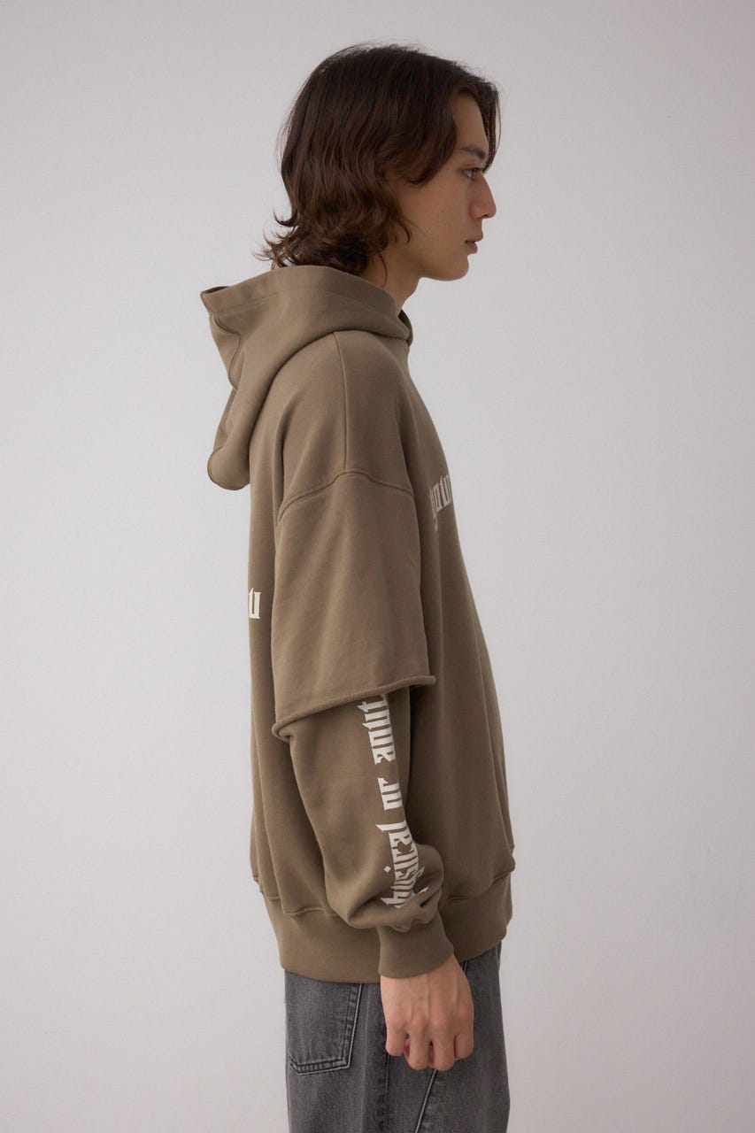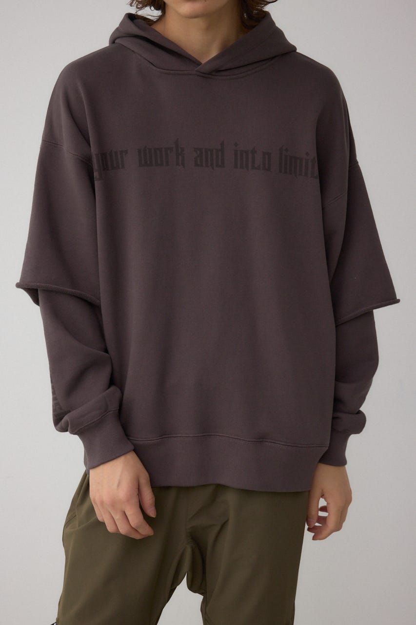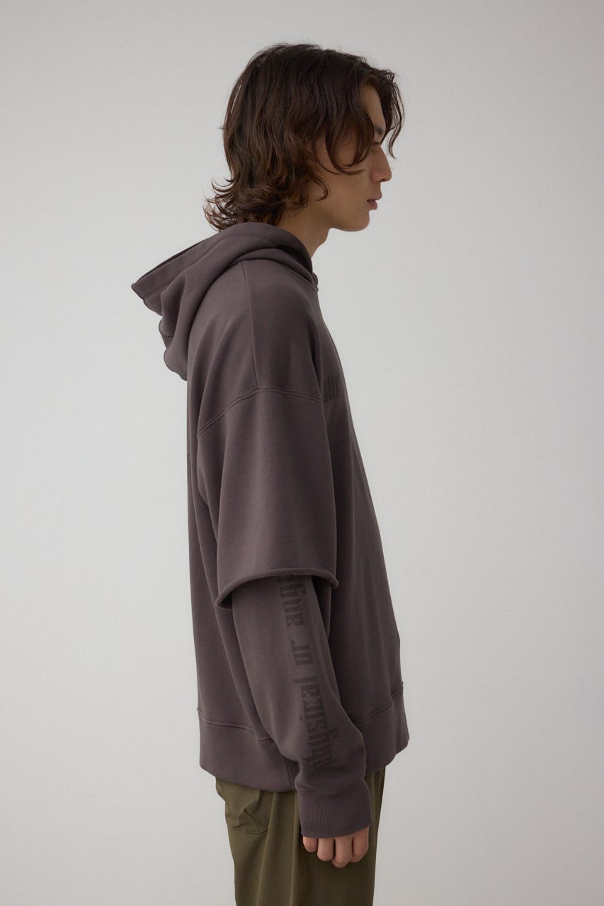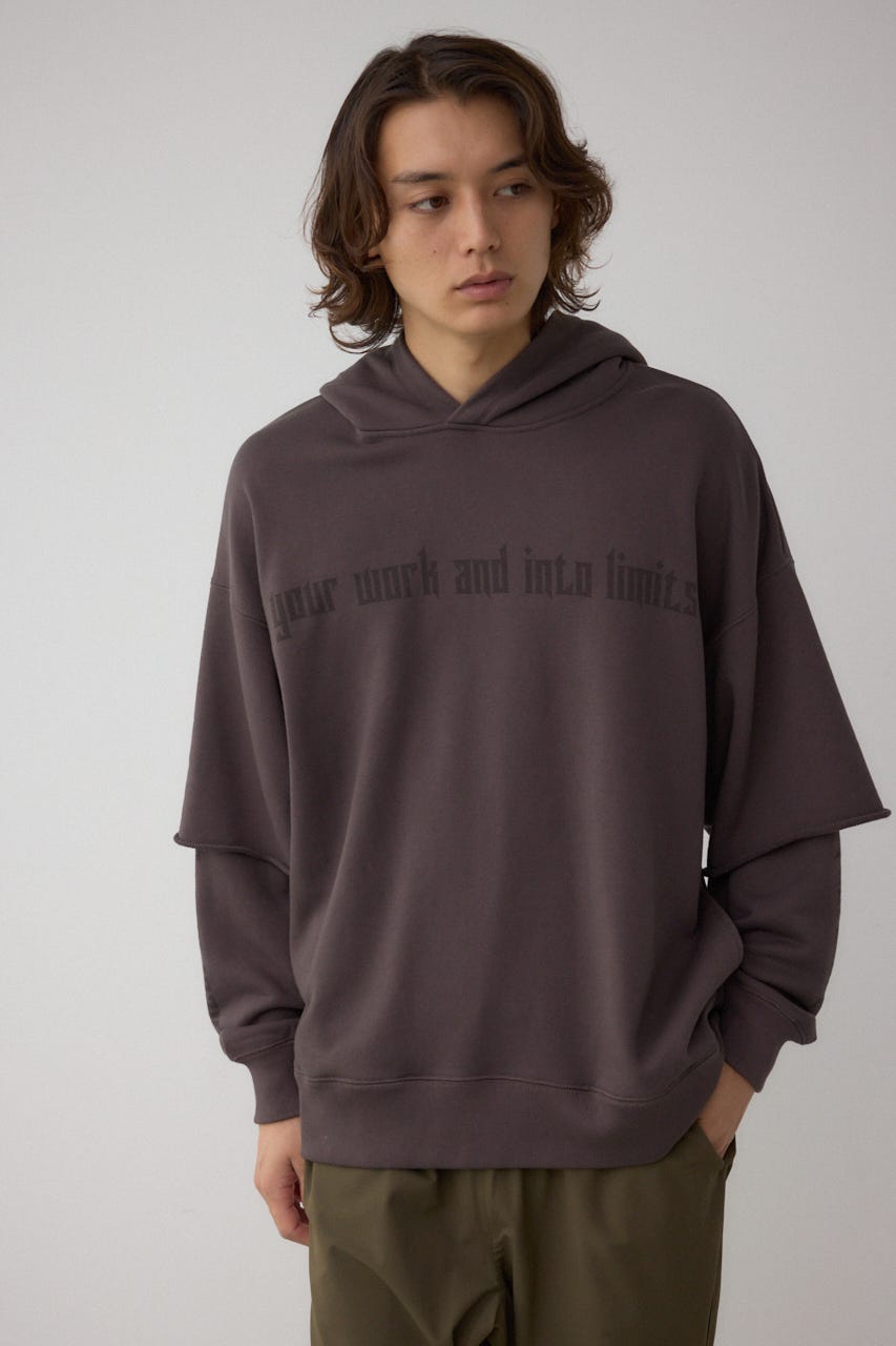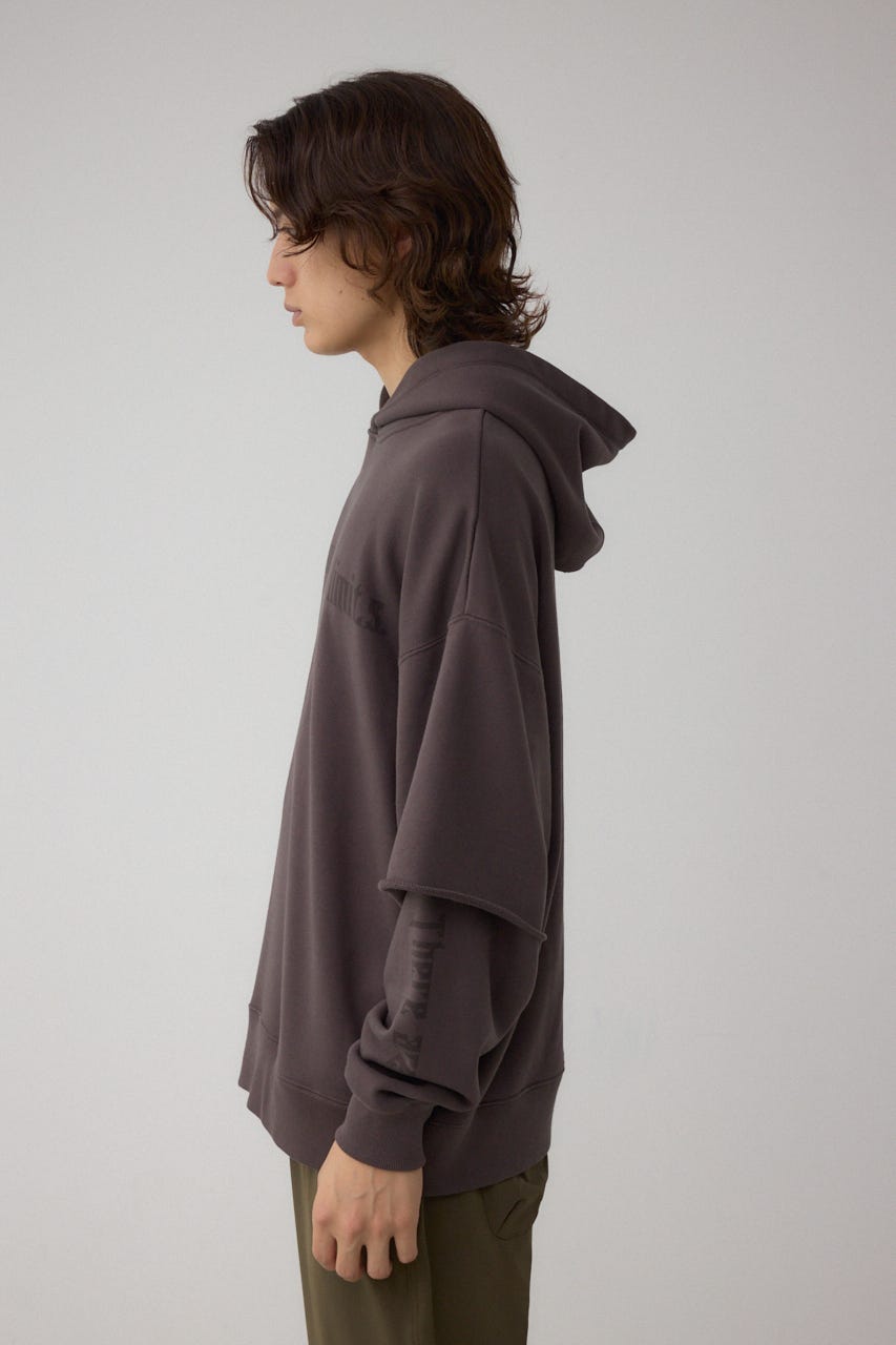 フェイクレイヤード仕様で1枚で重ね着風の表情が出せるスウェットフーディー。