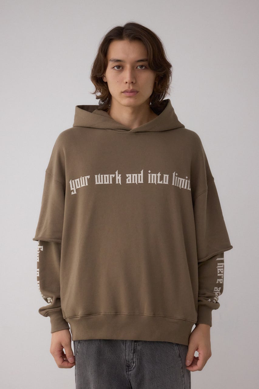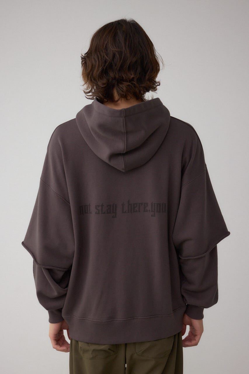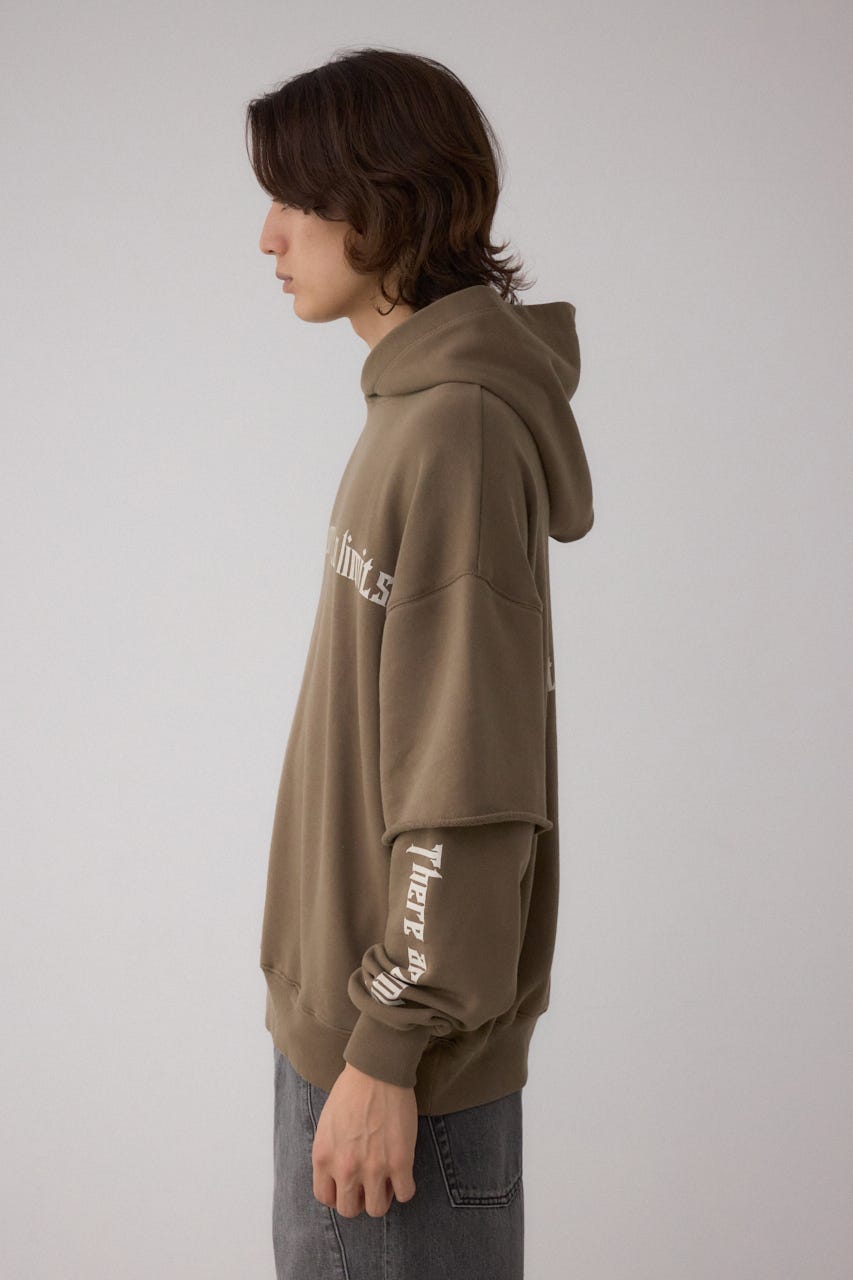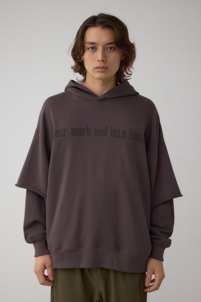 フェイクレイヤード仕様で1枚で重ね着風の表情が出せるスウェットフーディー。