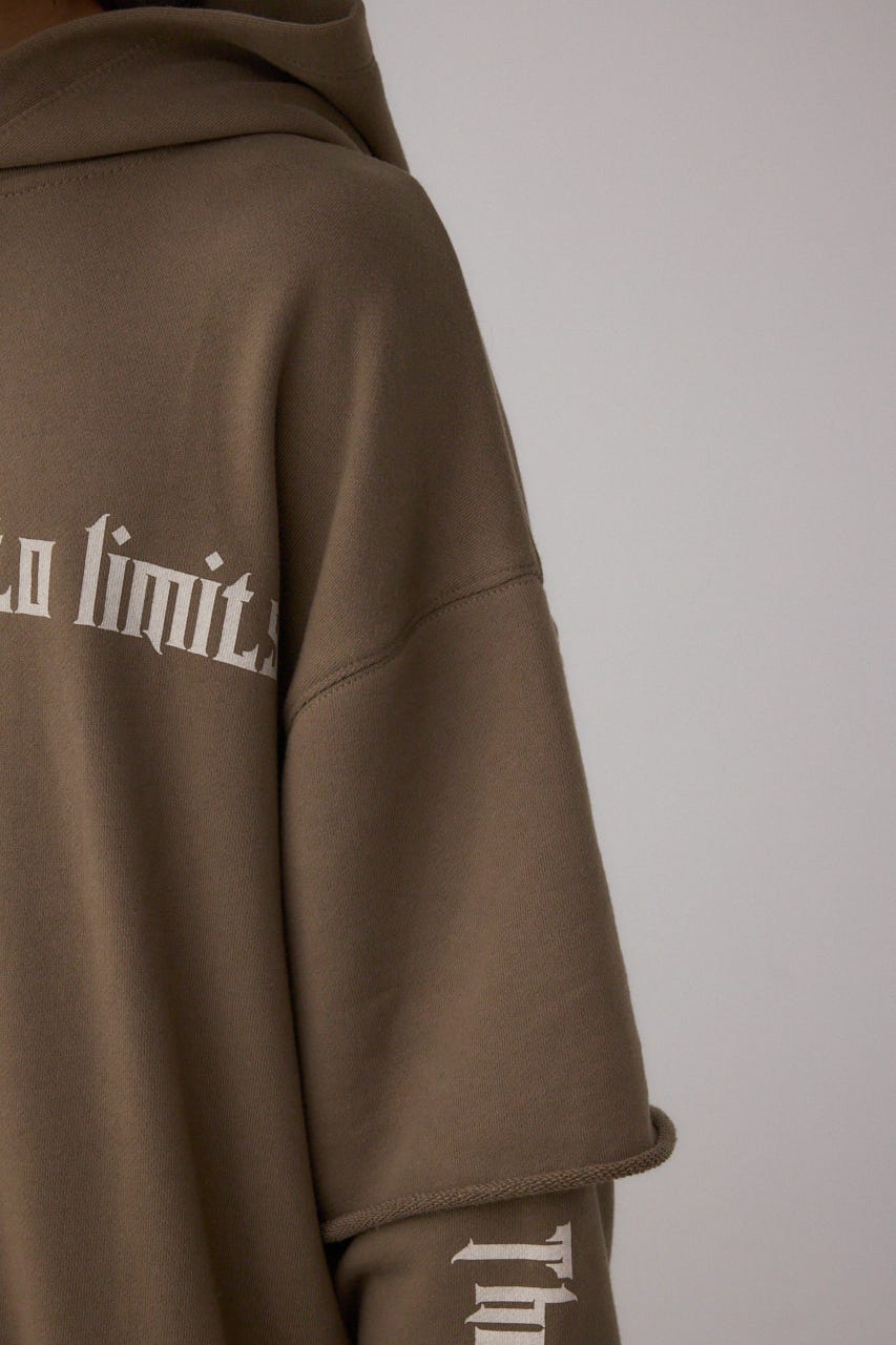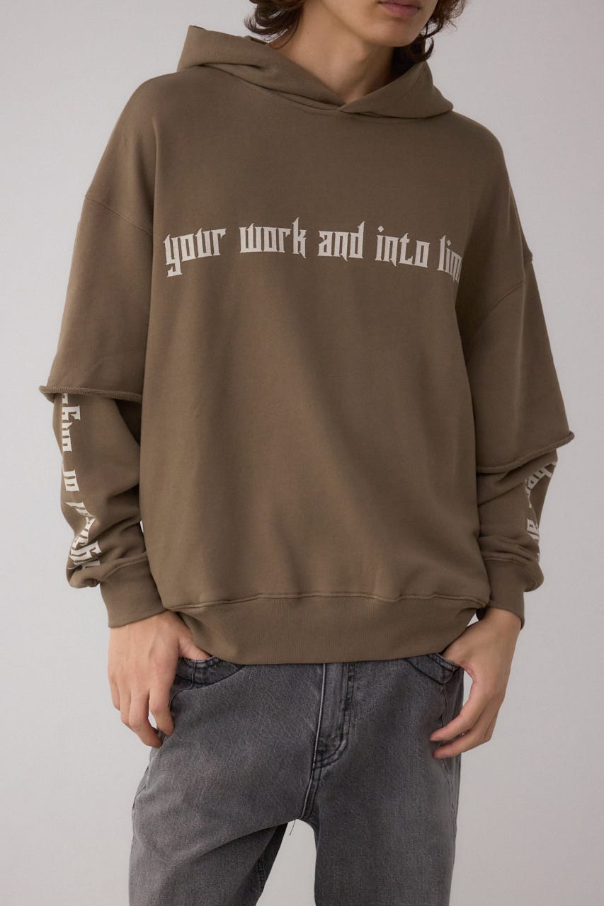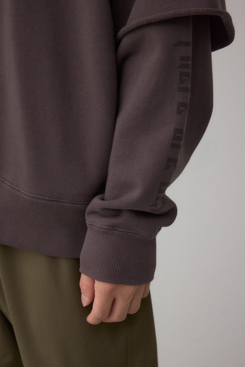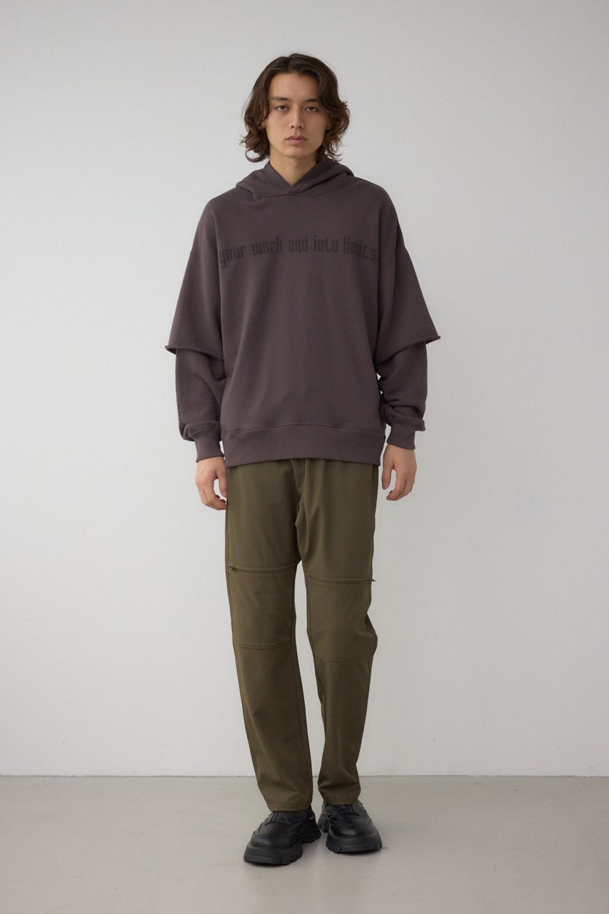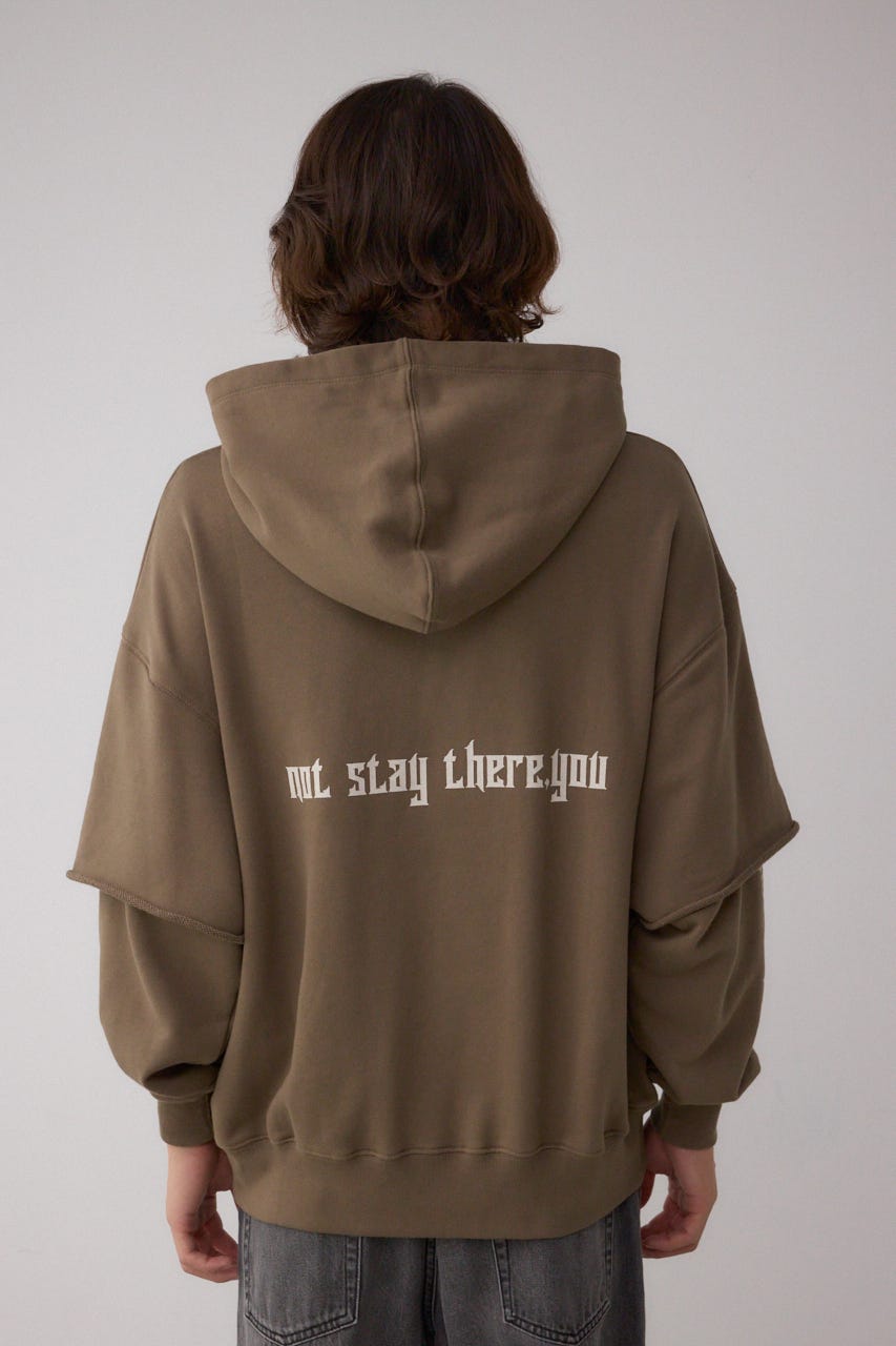 フェイクレイヤード仕様で1枚で重ね着風の表情が出せるスウェットフーディー。