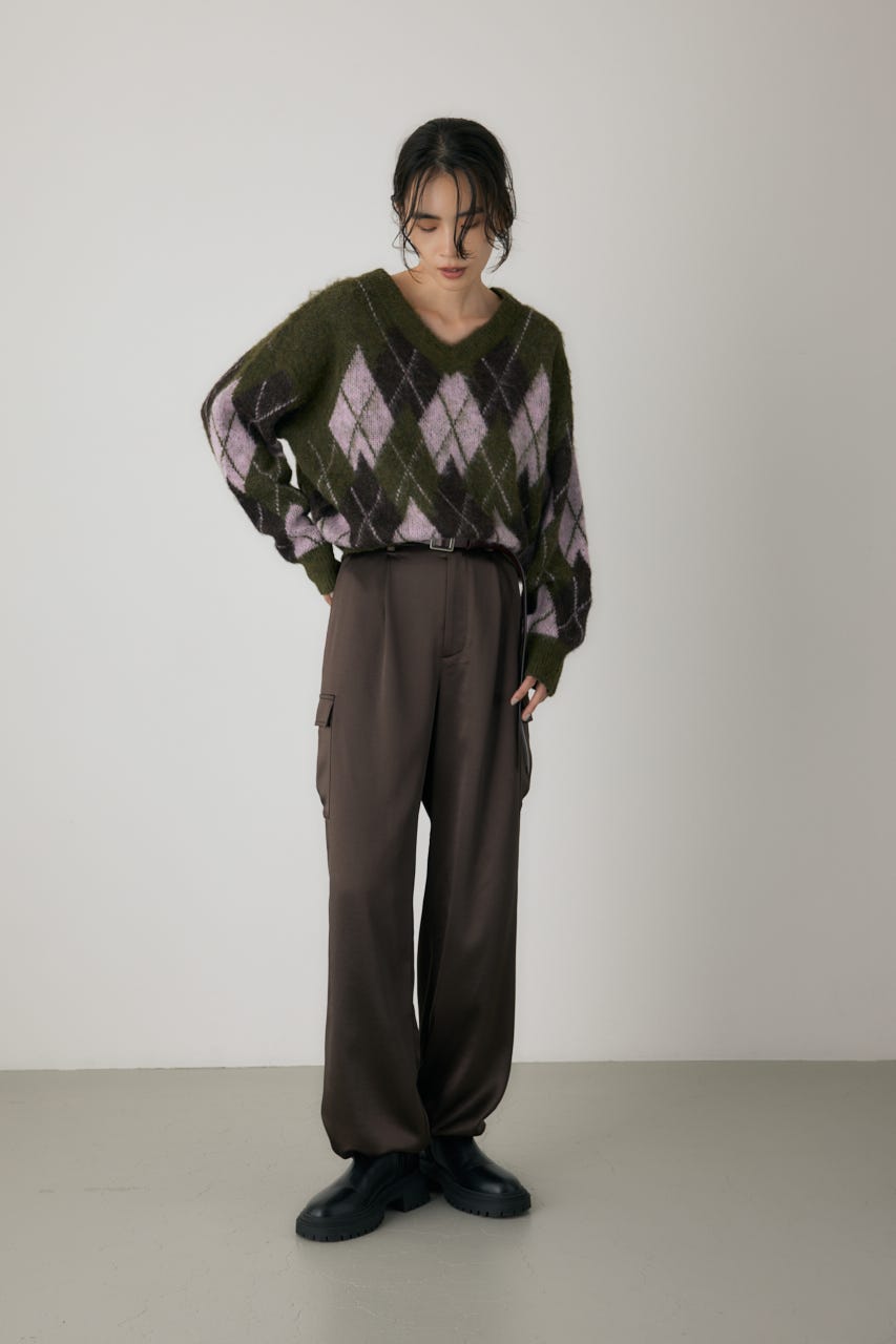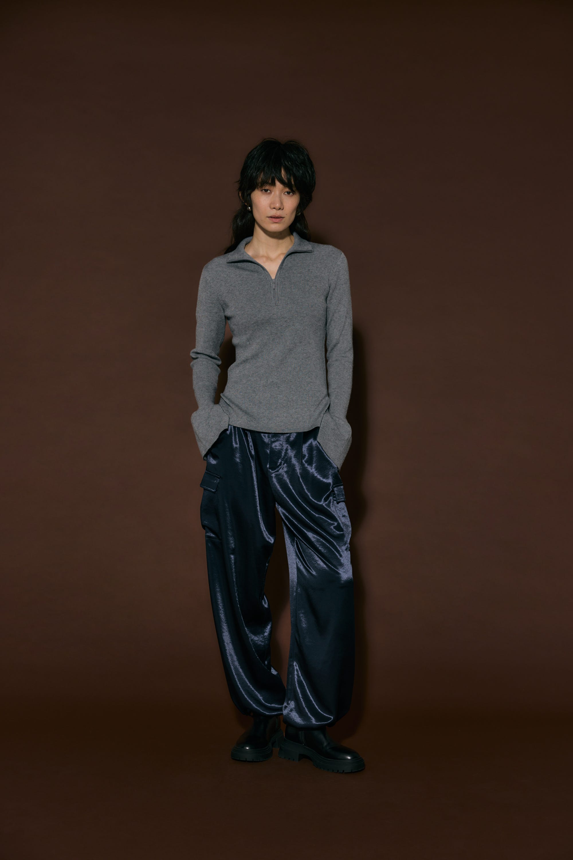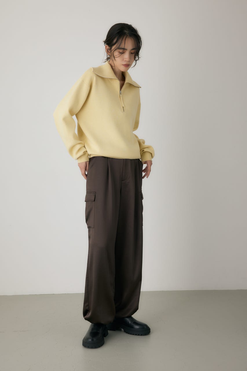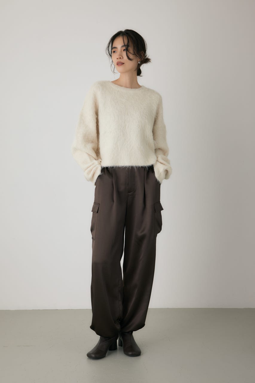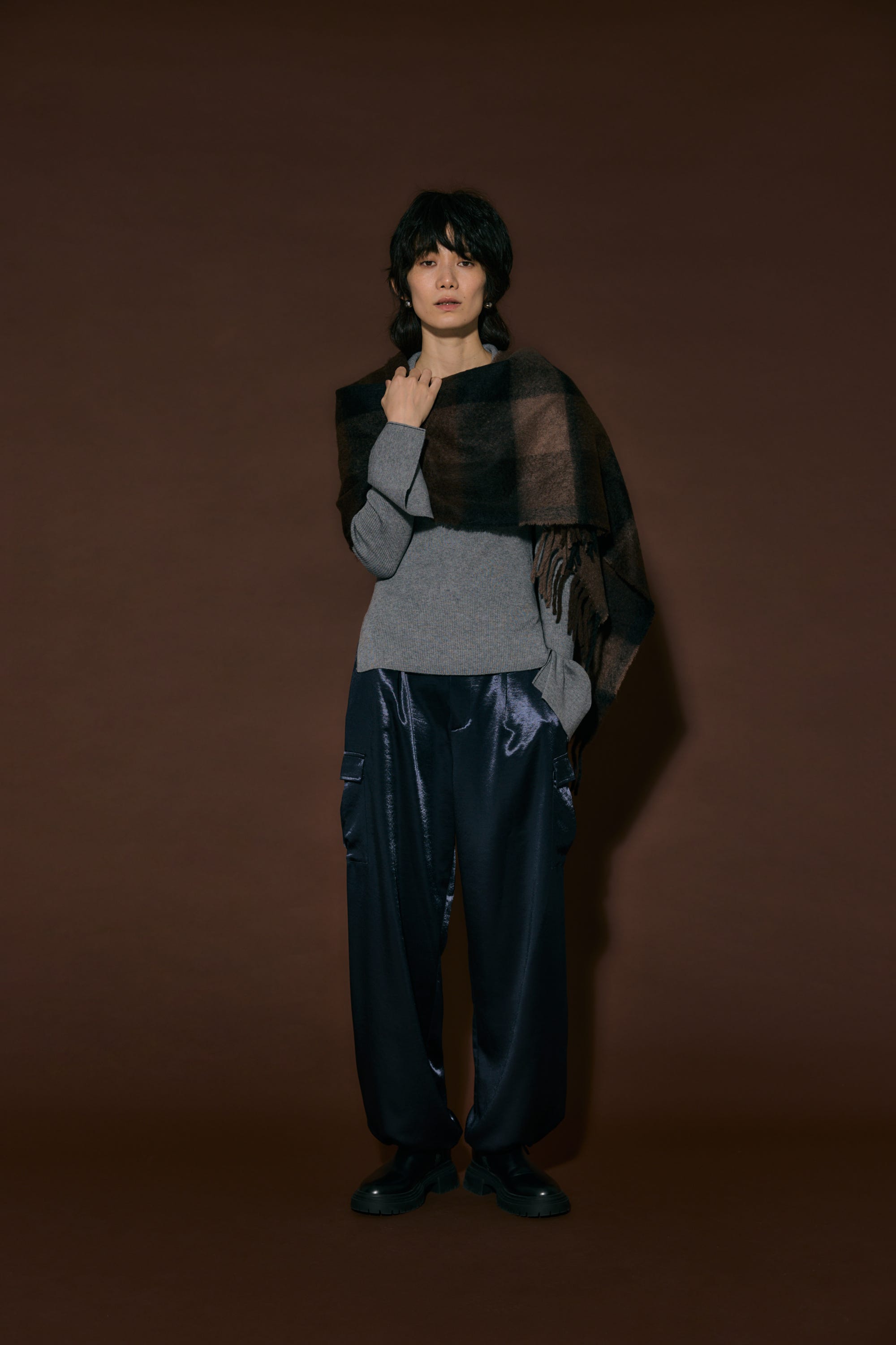 サテン地とのコントラストを楽しめるニットとのコーディネートがおすすめ。