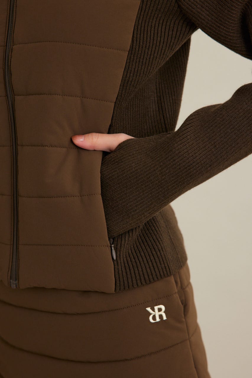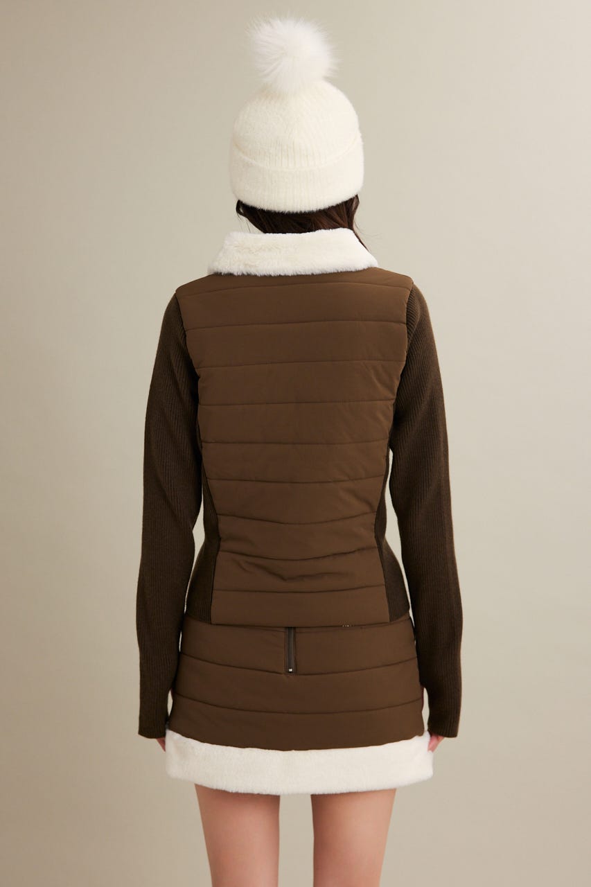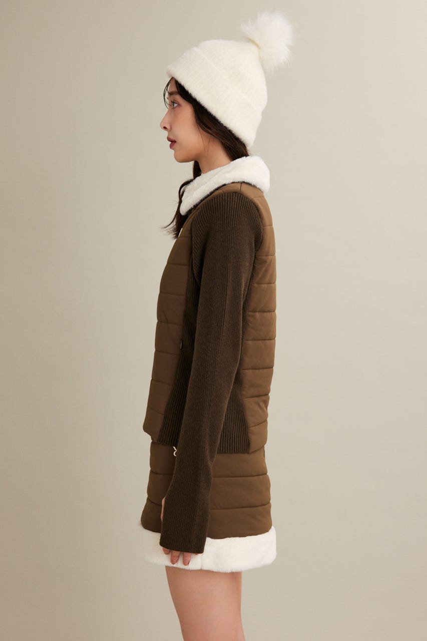 【キルティング部分】(表地)ナイロン:91ポリウレタン:9(中わた)ポリエステル:100(裏地)ポリエステル:100【ニット部分】アクリル:59ポリエステル:23ナイロン:18【フェイクファー部分】ポリエステル:100