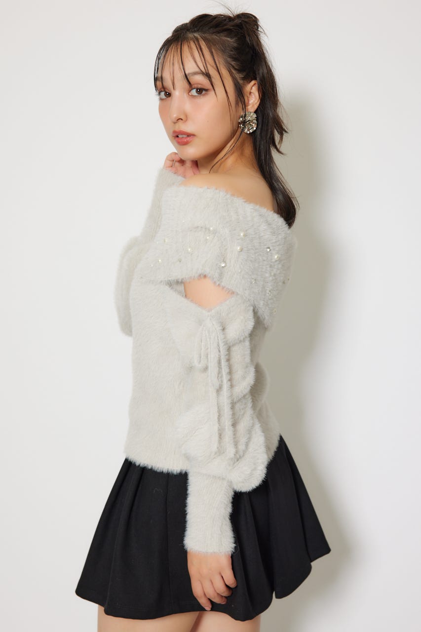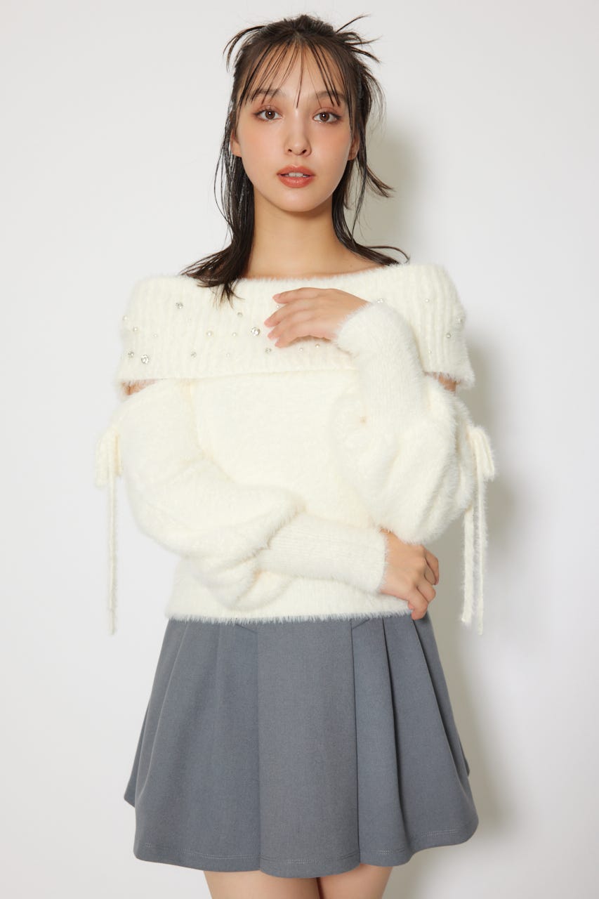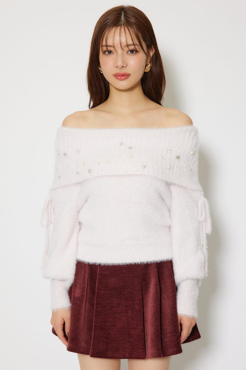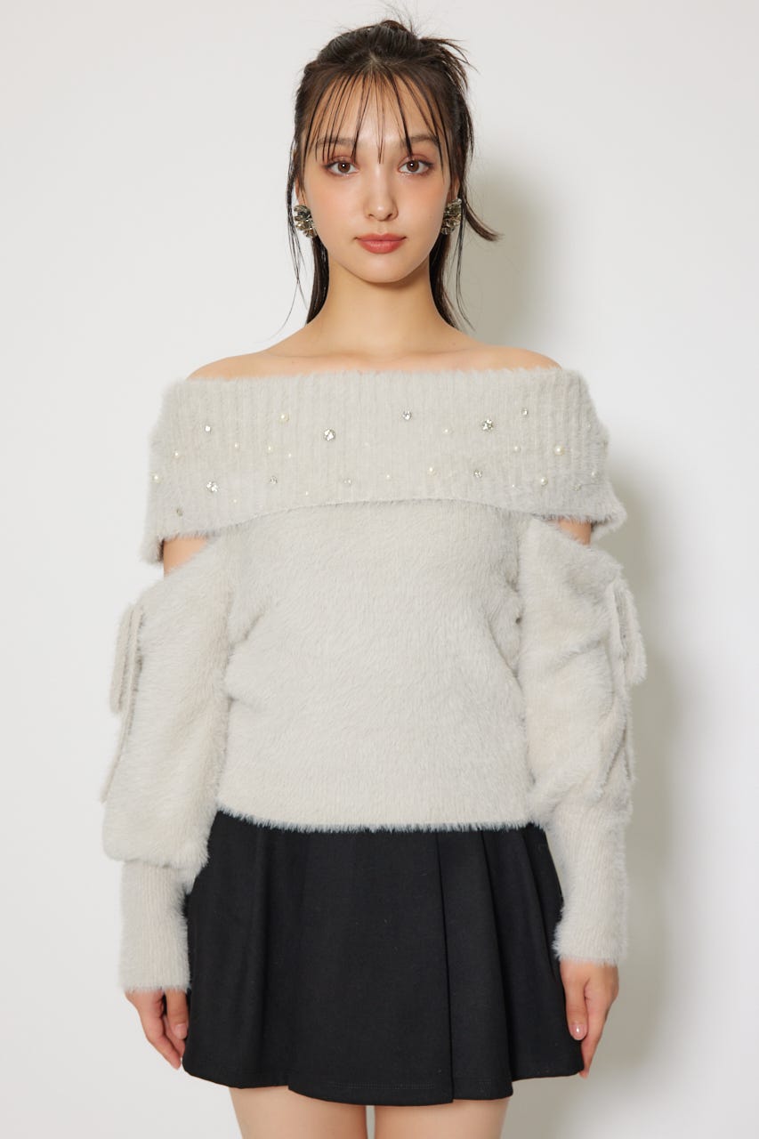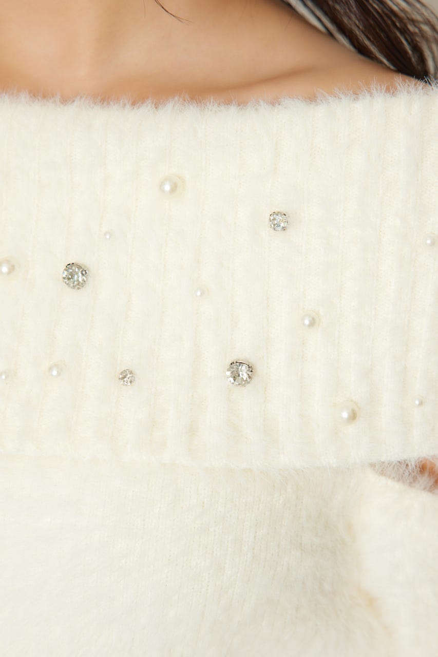 ※お届け時期:2025年12月上旬以降 【華やかなボリューミーで温かみのあるシャギーニットにパールとビジューを贅沢にちりばめました】