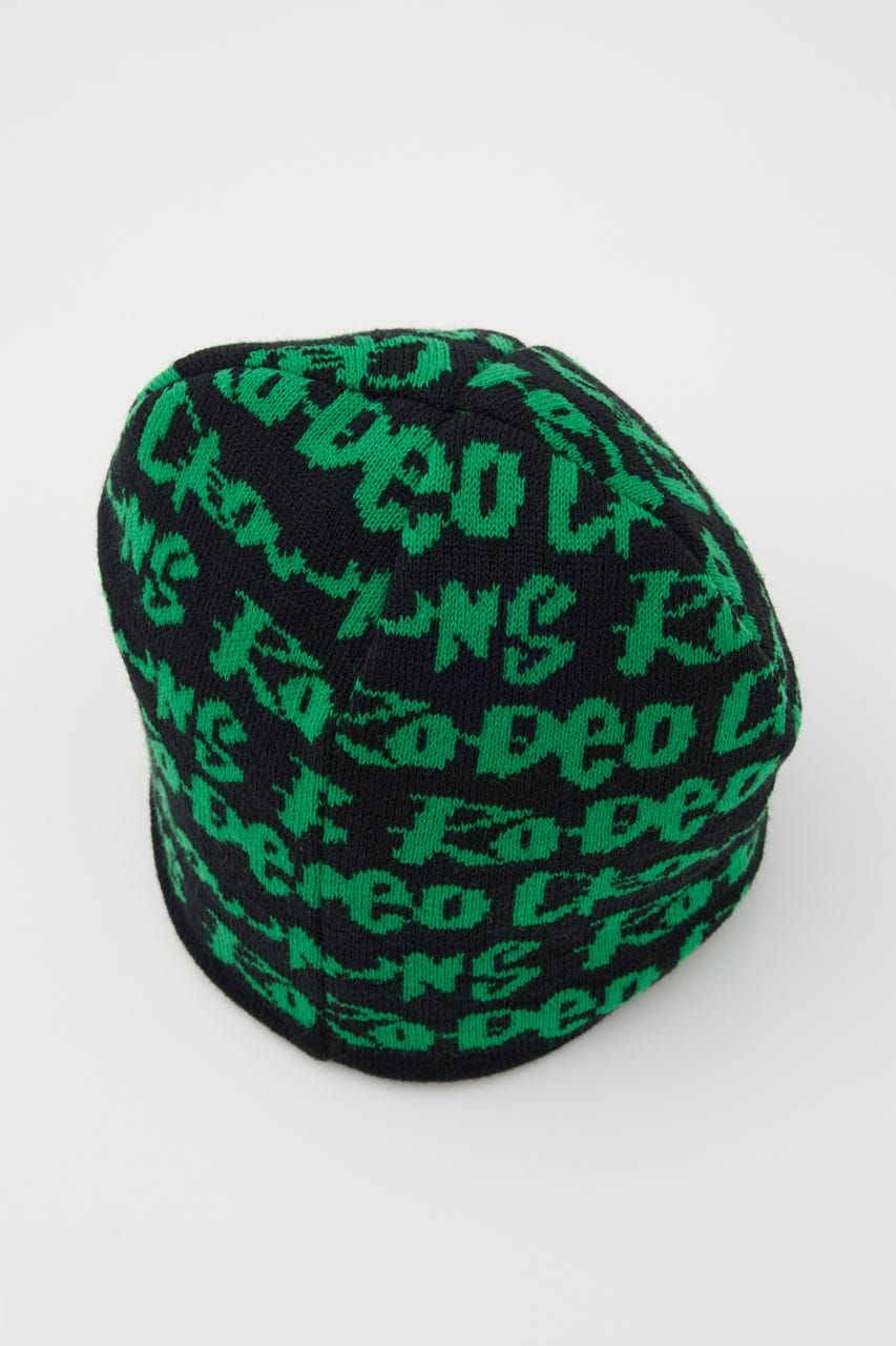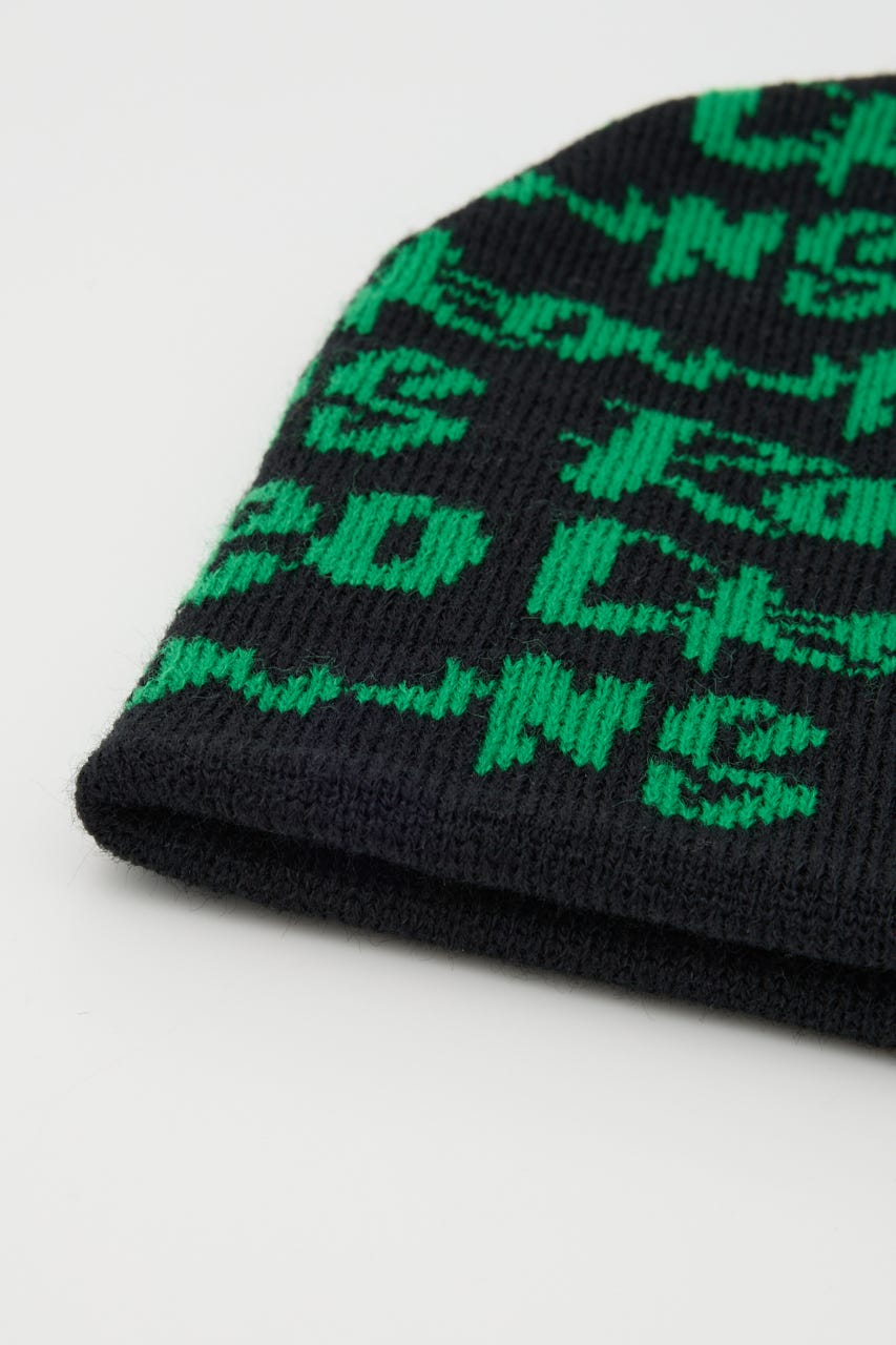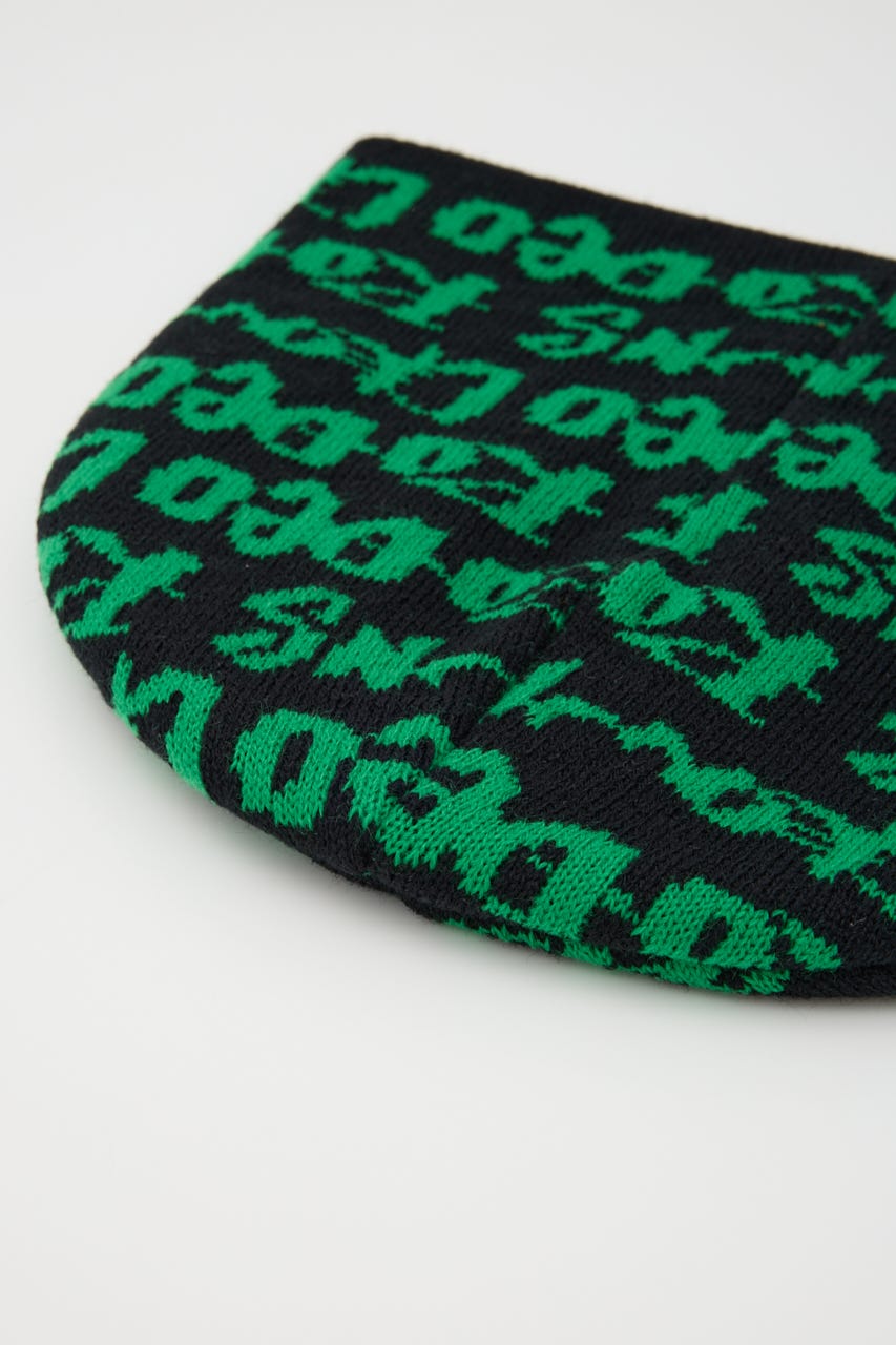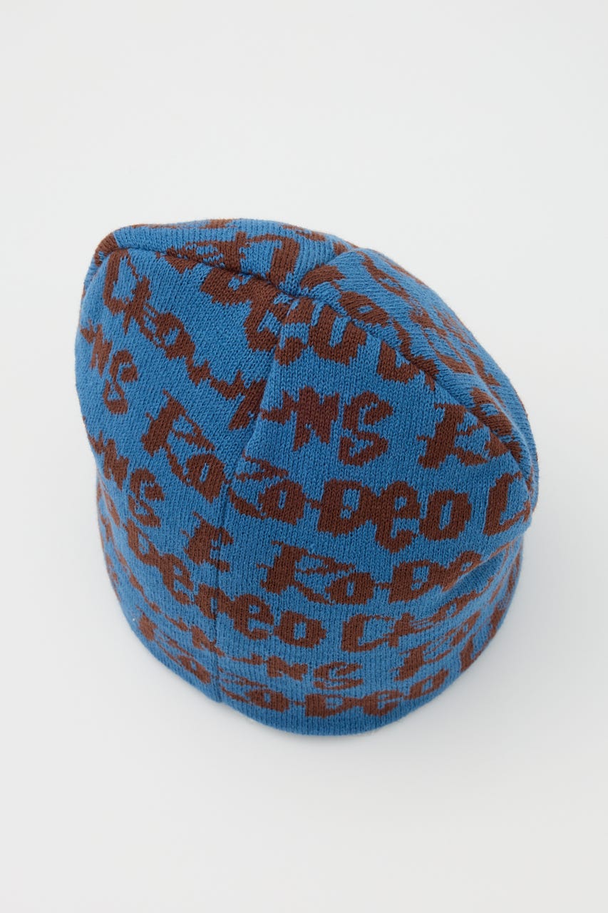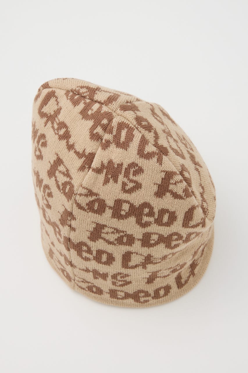 ペイントのような総柄ロゴデザインをジャガードしたニットビーニー。