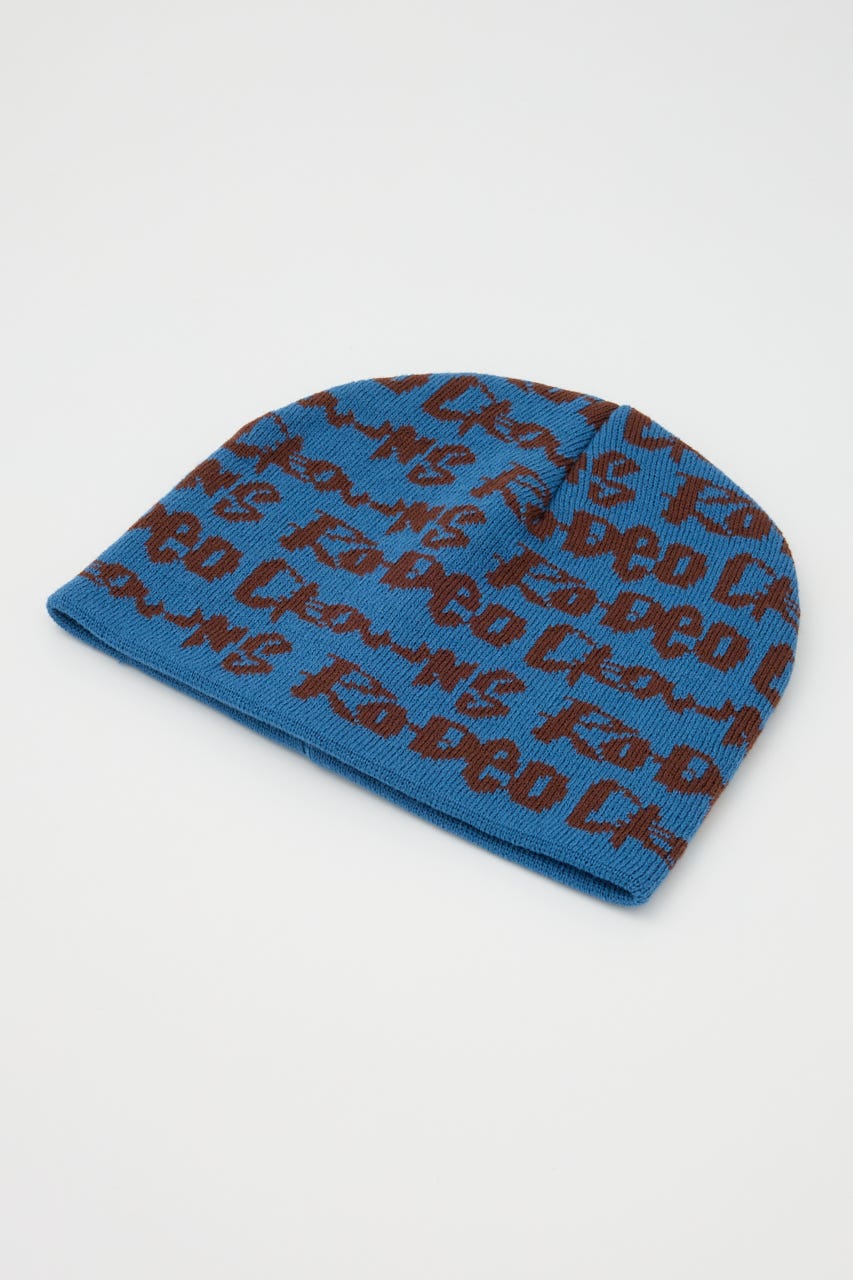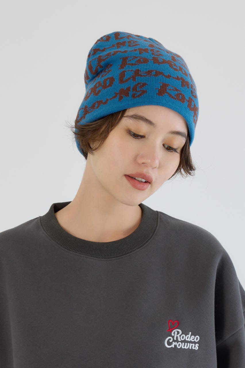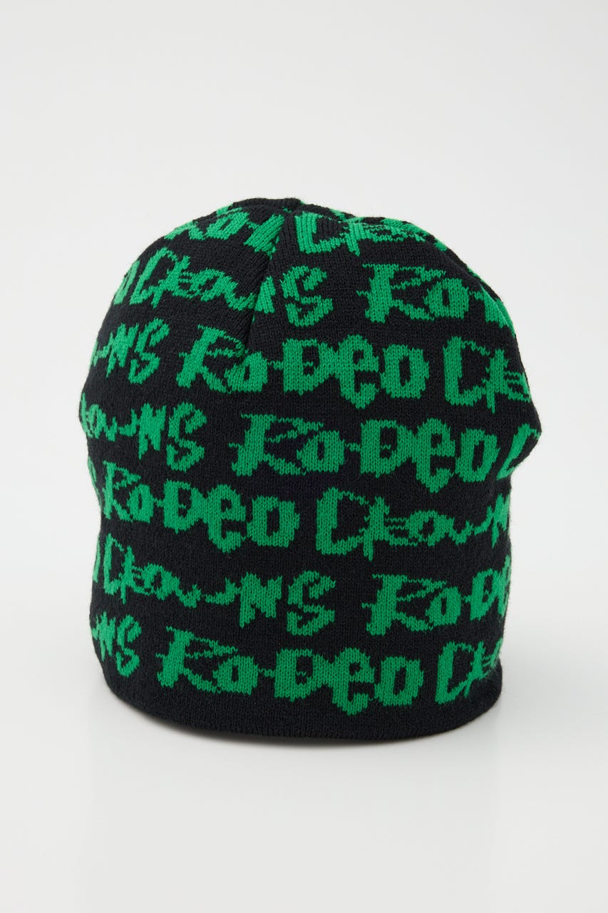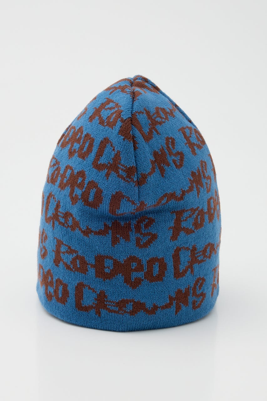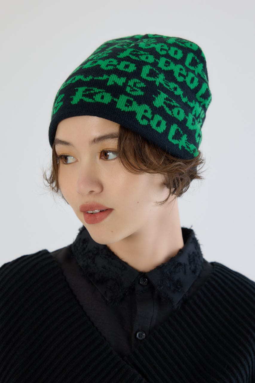 ペイントのような総柄ロゴデザインをジャガードしたニットビーニー。