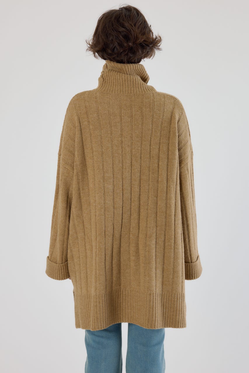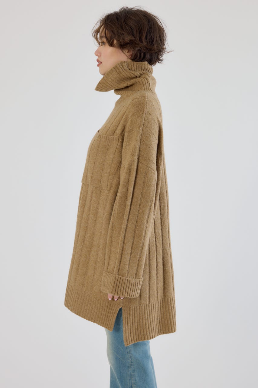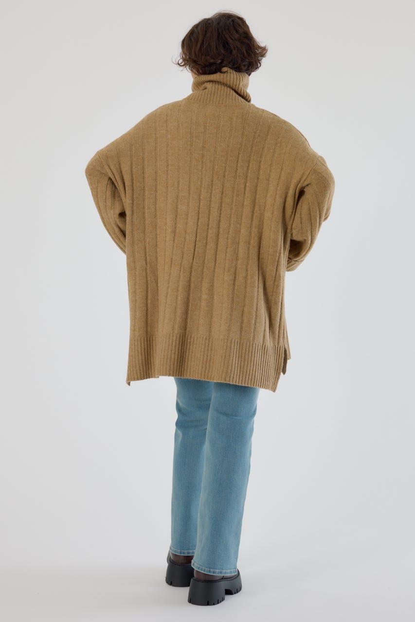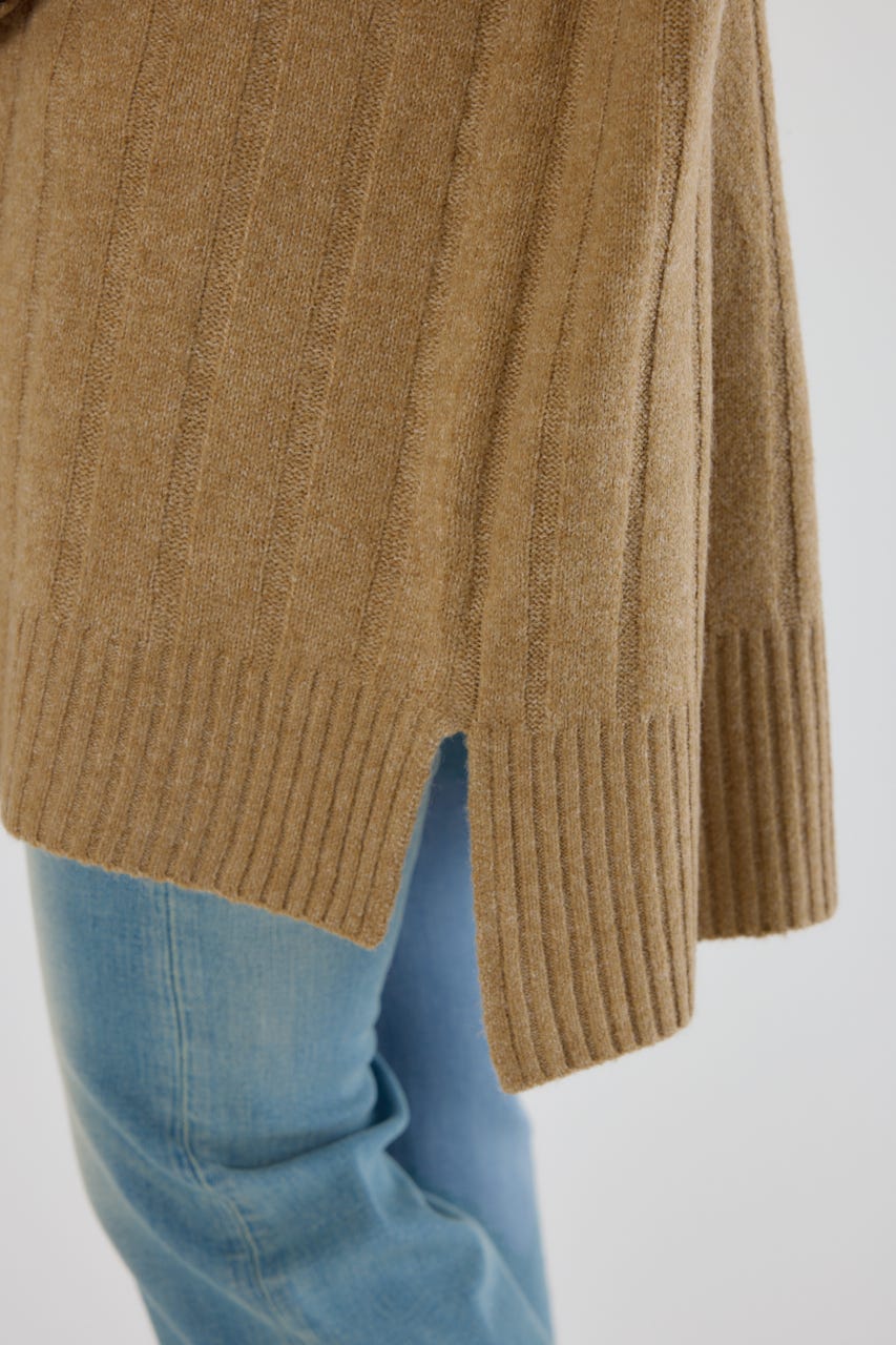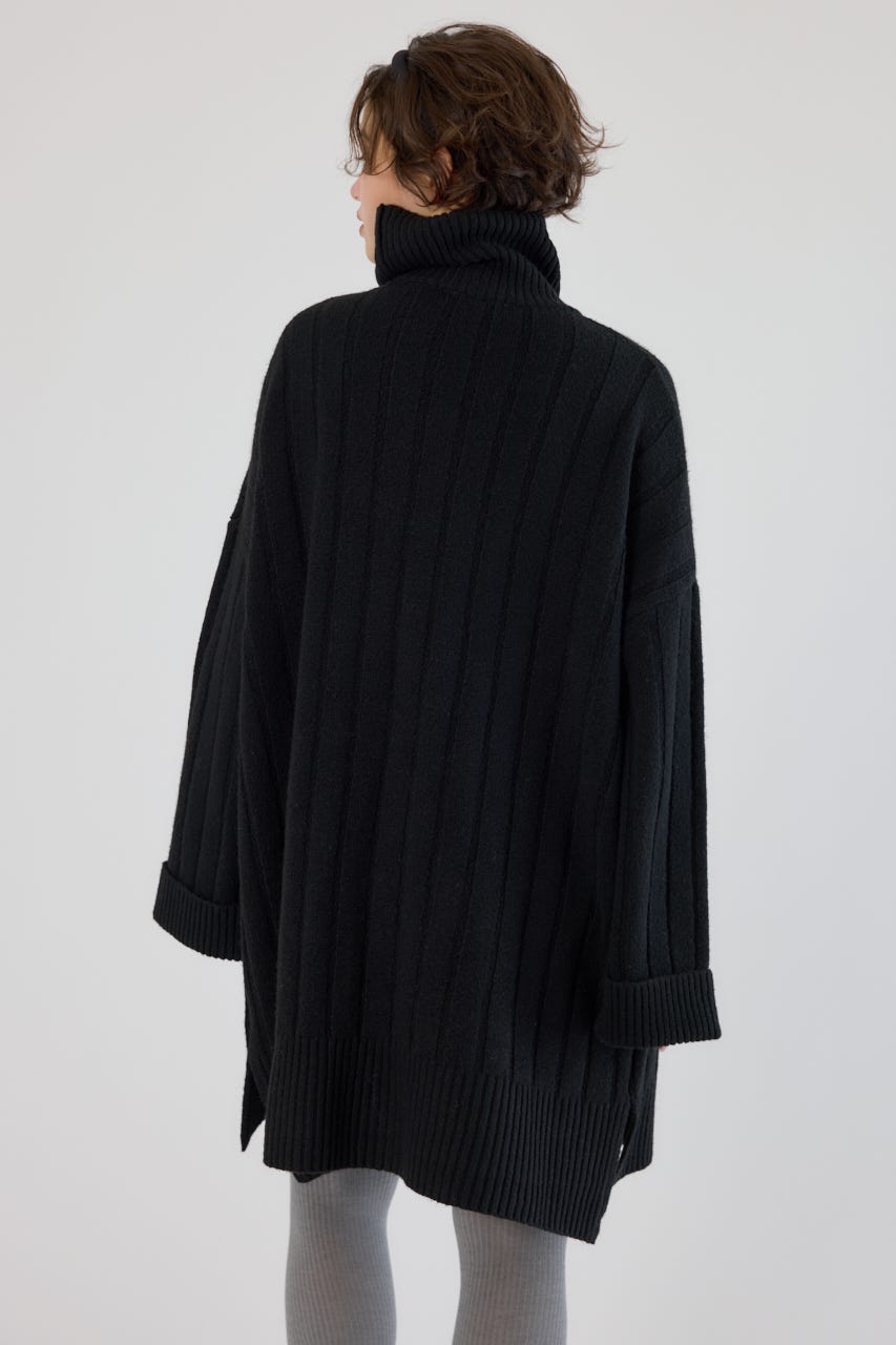 太めのリブ編みが縦のラインを強調し、着やせ効果のあるすっきりとした印象に。