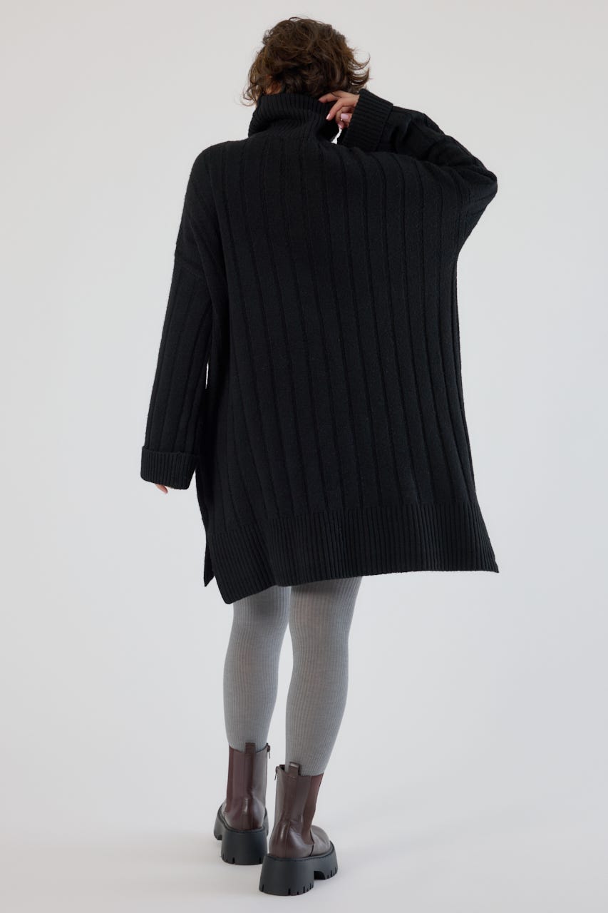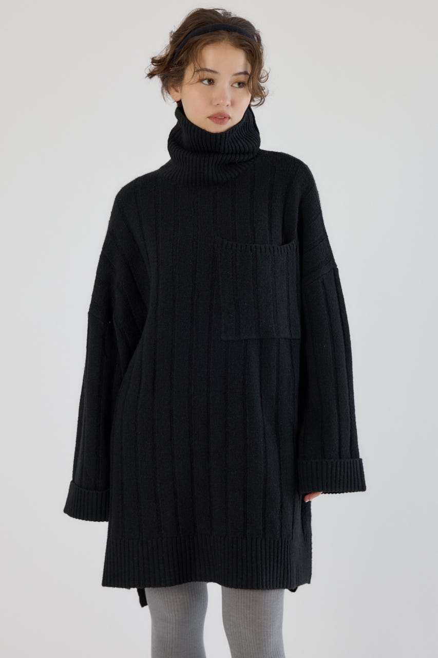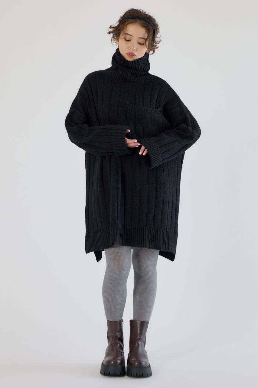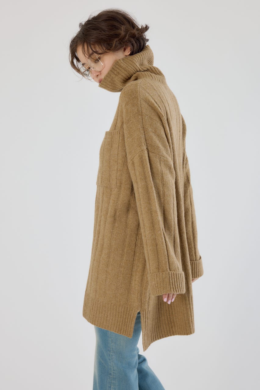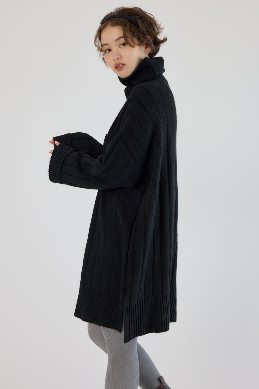 太めのリブ編みが縦のラインを強調し、着やせ効果のあるすっきりとした印象に。