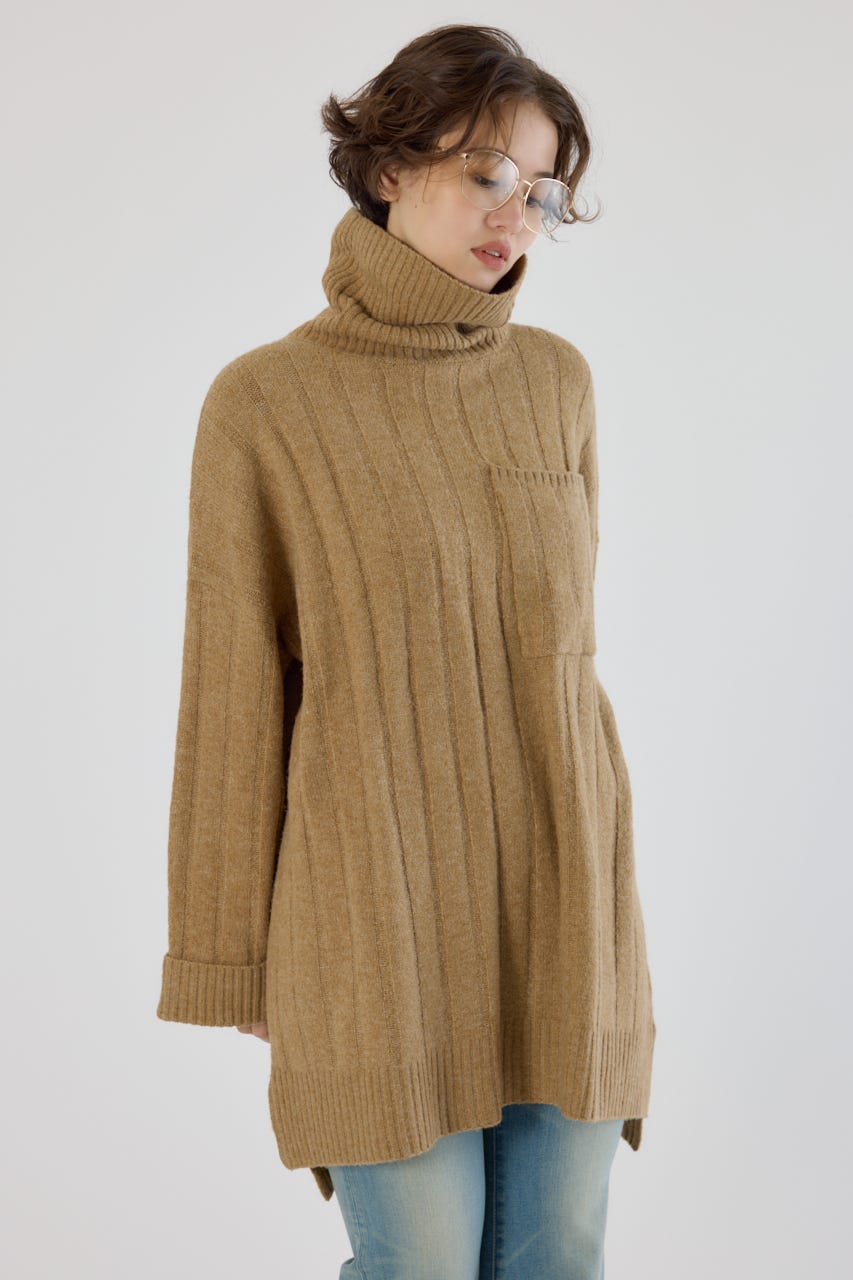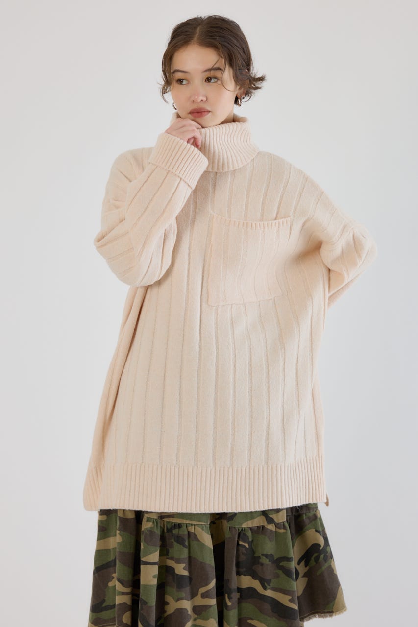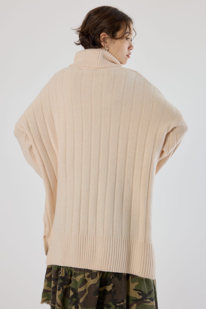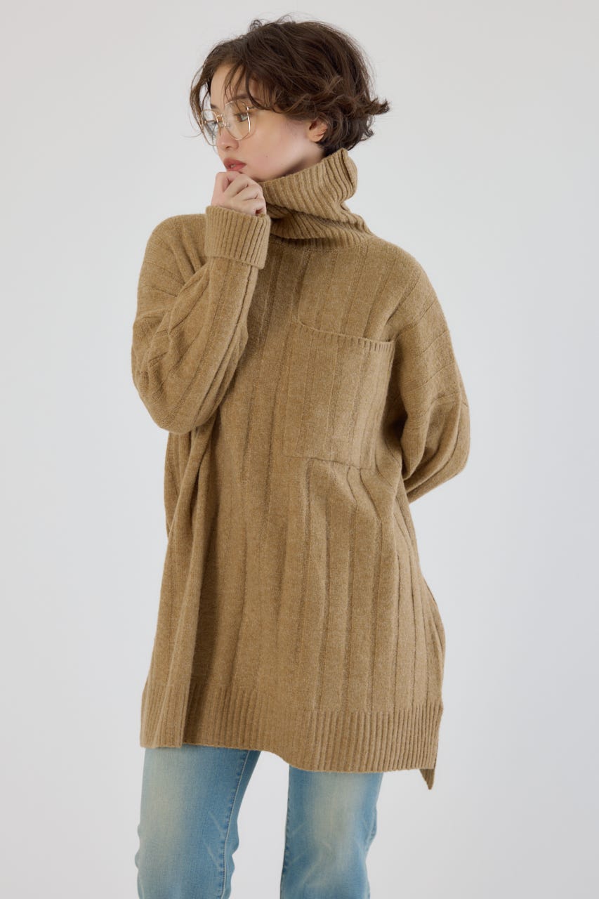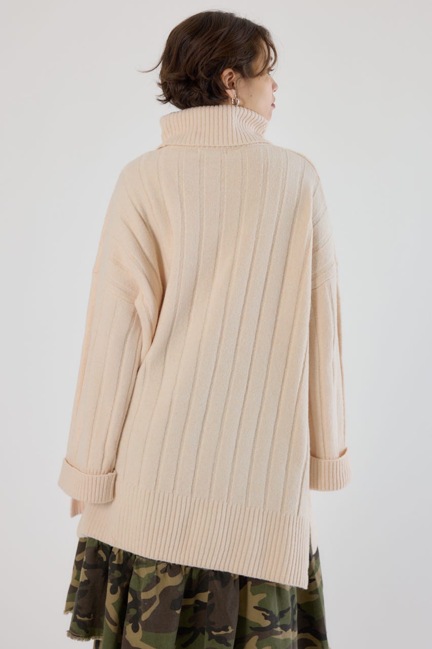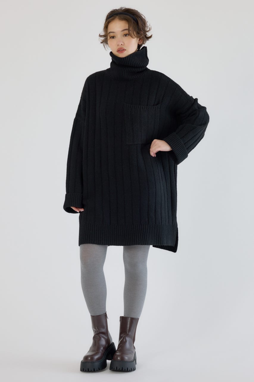 太めのリブ編みが縦のラインを強調し、着やせ効果のあるすっきりとした印象に。