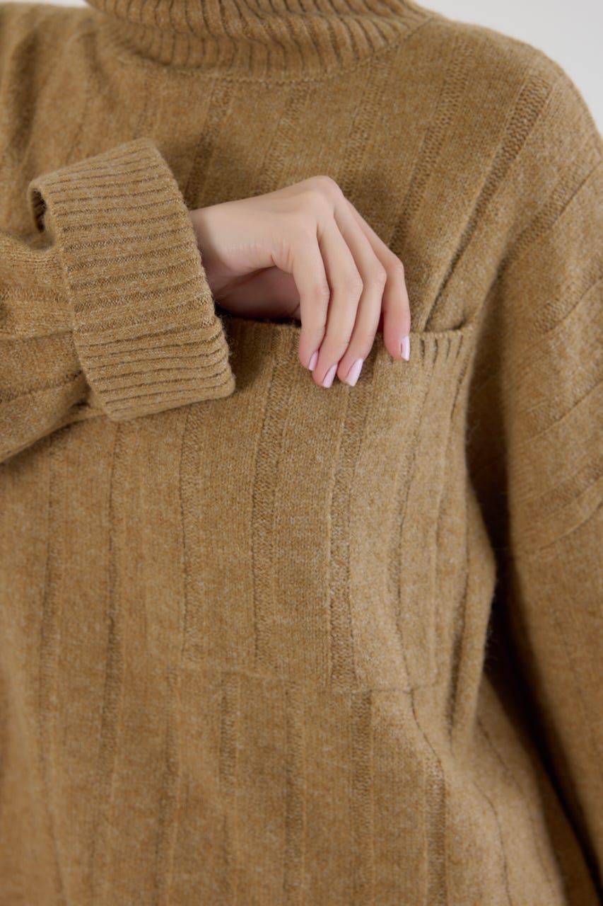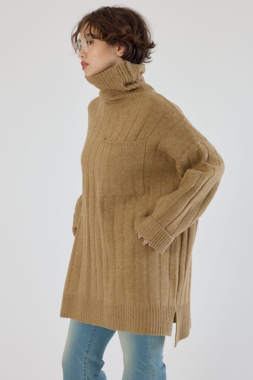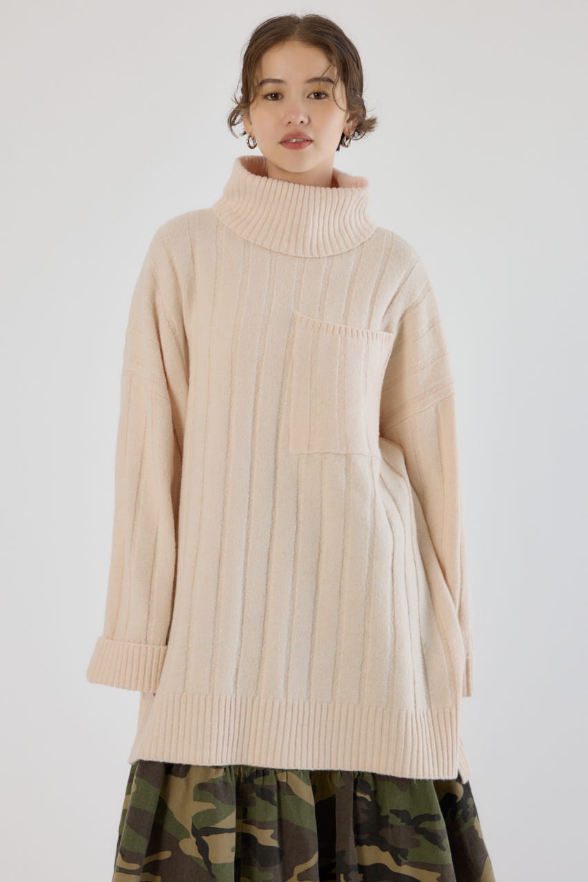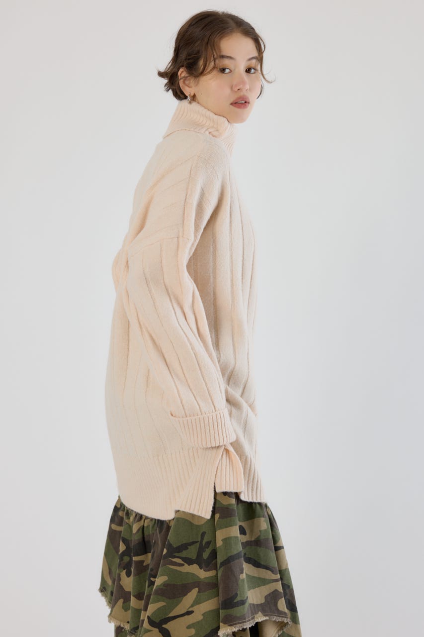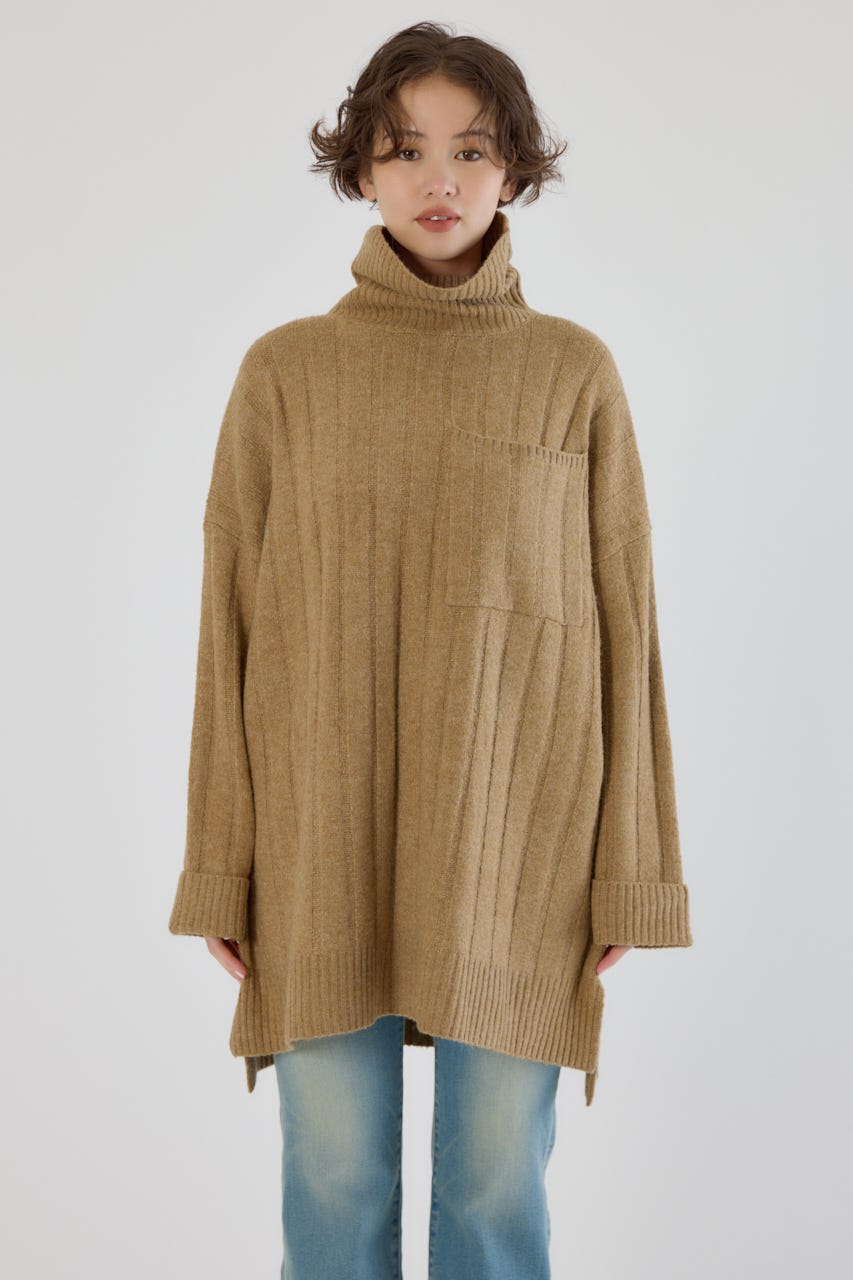 太めのリブ編みが縦のラインを強調し、着やせ効果のあるすっきりとした印象に。
