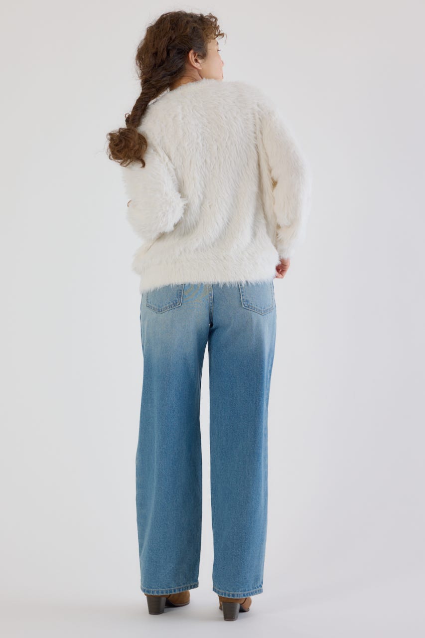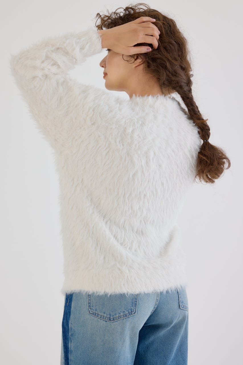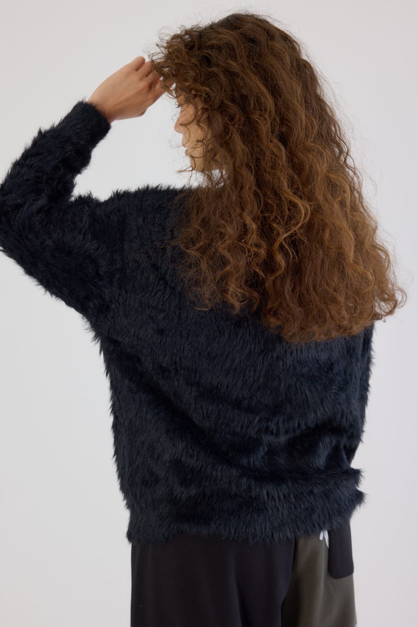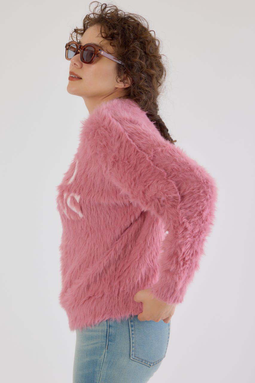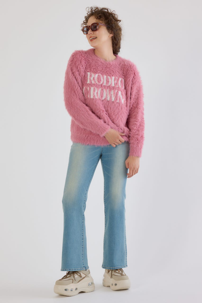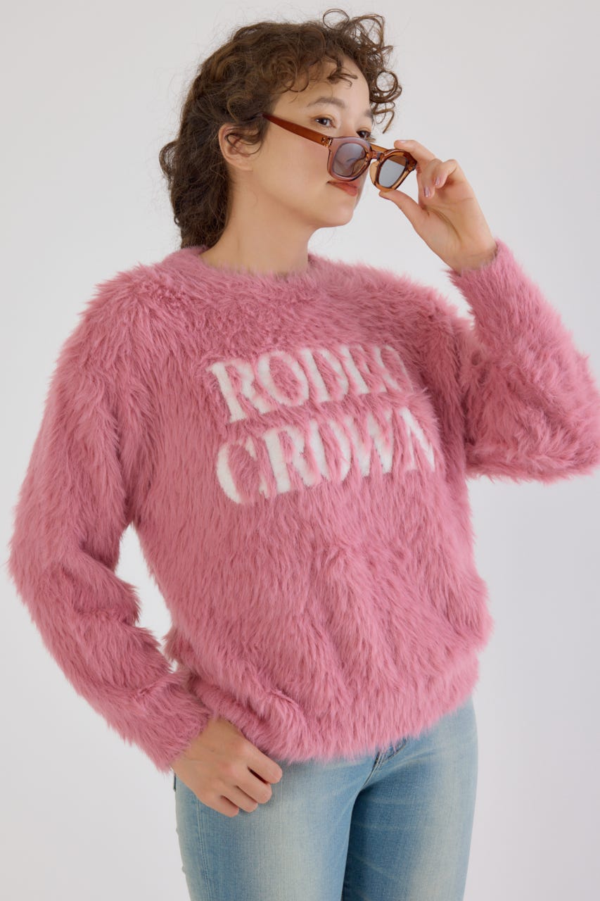 柔らかく着心地の良いシャギーニットでロゴを表現した一着。