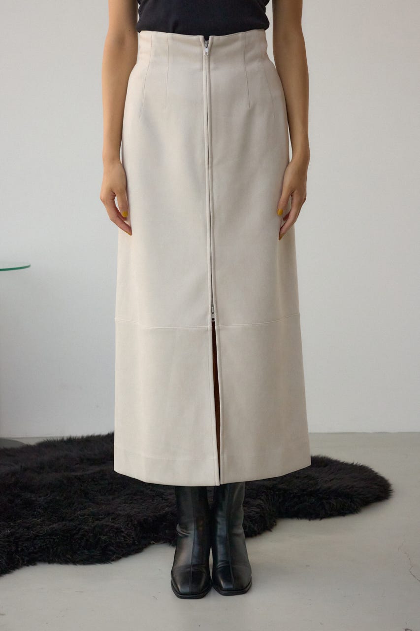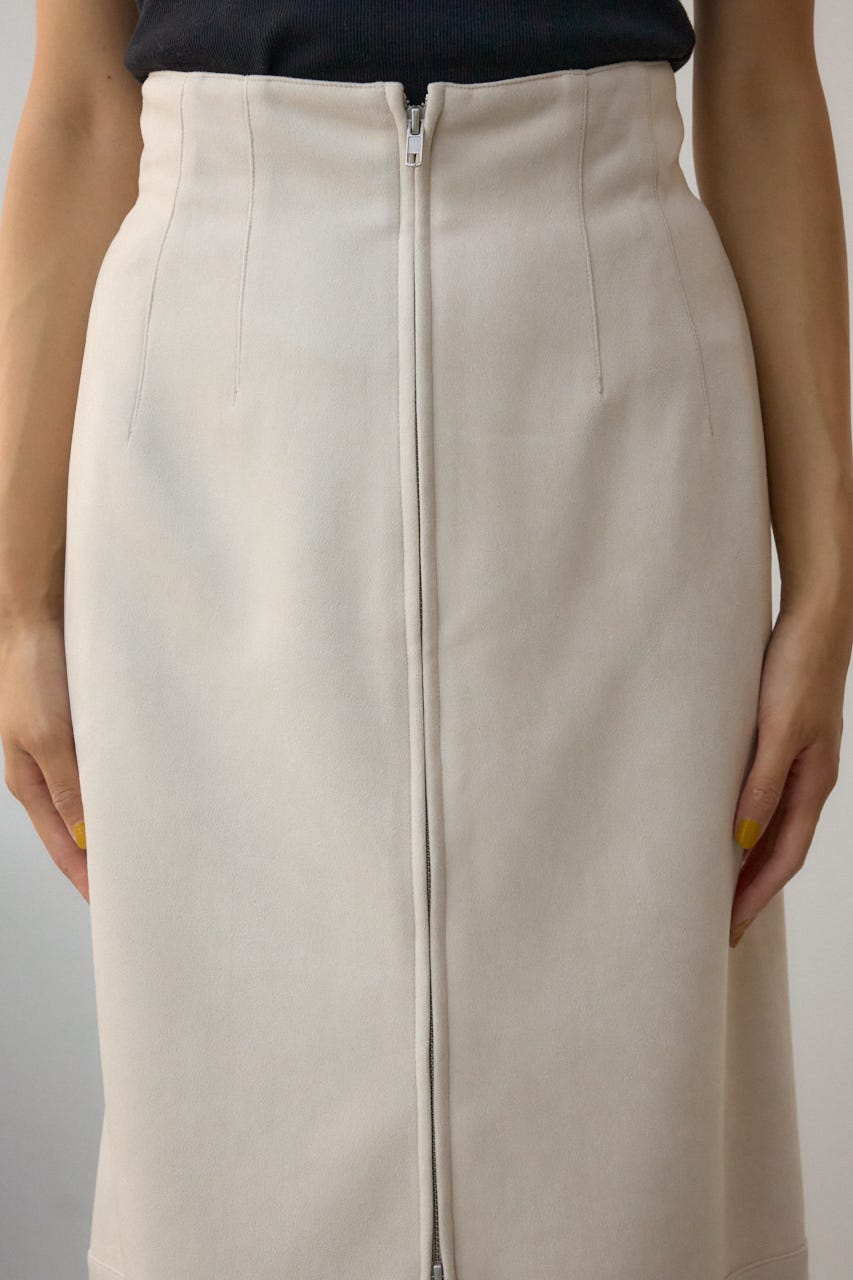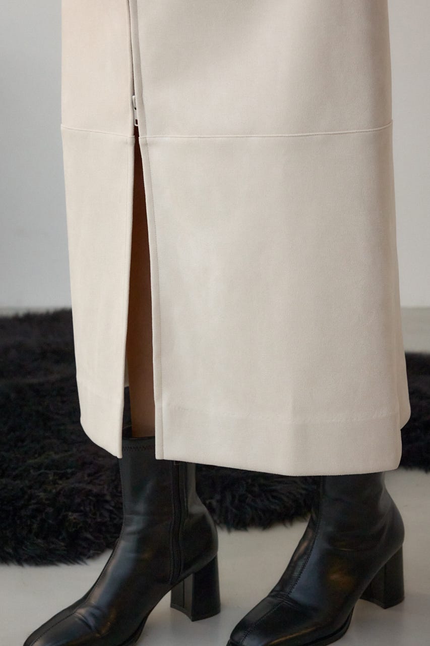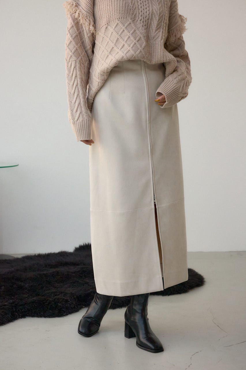 フェイクレザー/スエードの表情×フロントジップで、縦ラインが際立つ大人のタイトスカート。