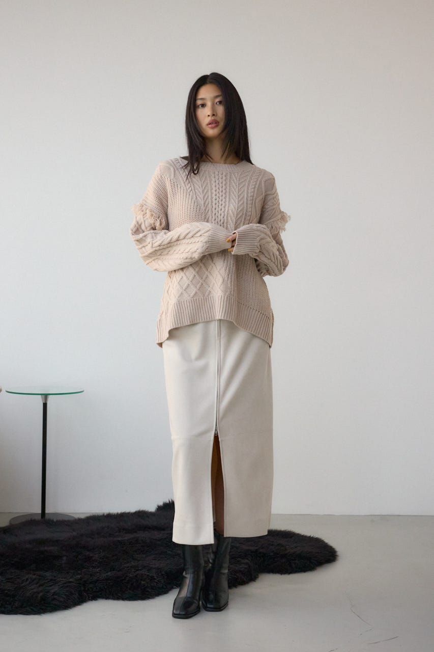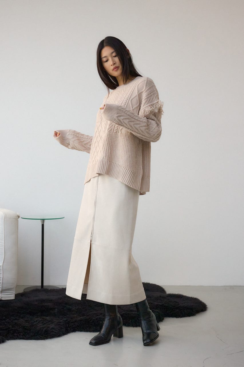 ざっくりニットをアウトにして着こなすことで、ゆる×タイトの絶妙なこなれバランスが完成。