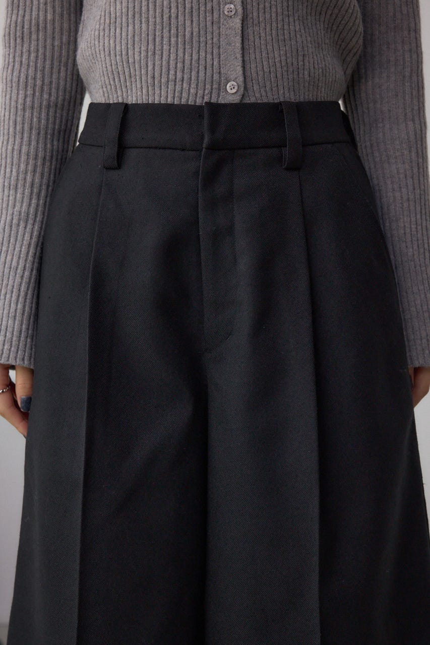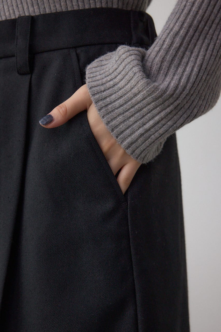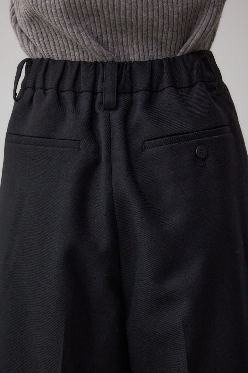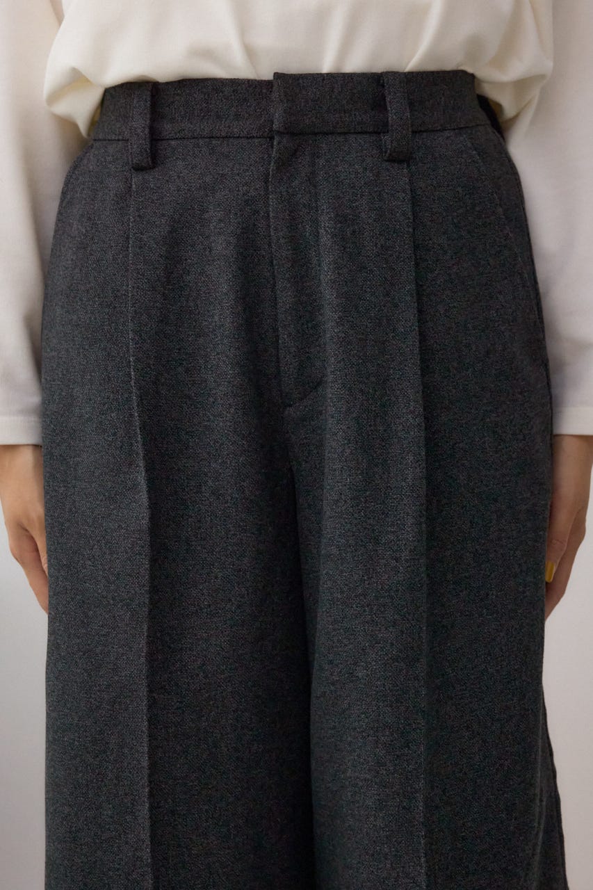 フロントタックと程よいワイドシルエットで脚のラインを拾わず、すっきり見え。