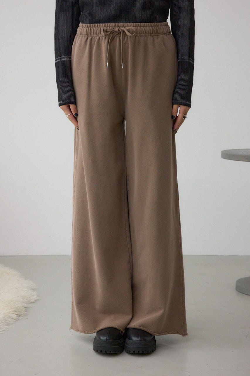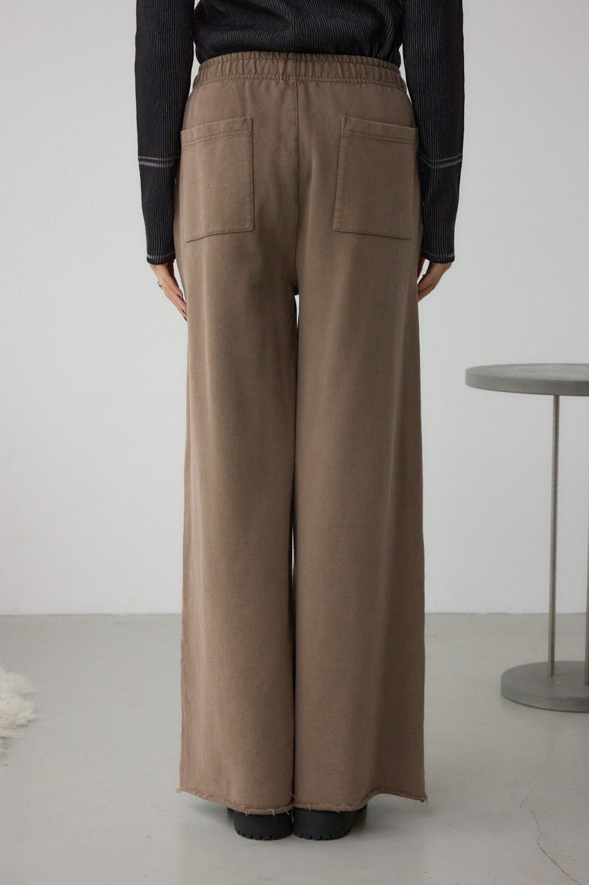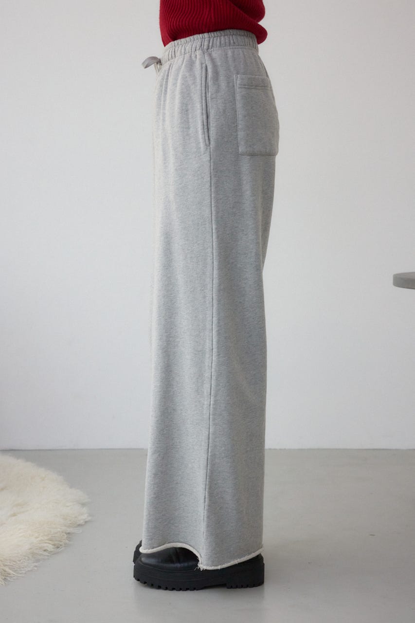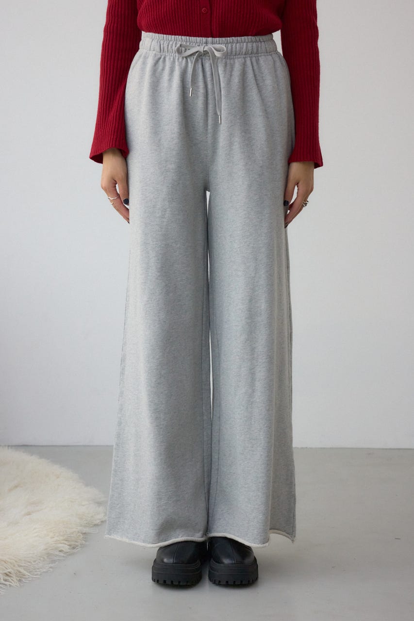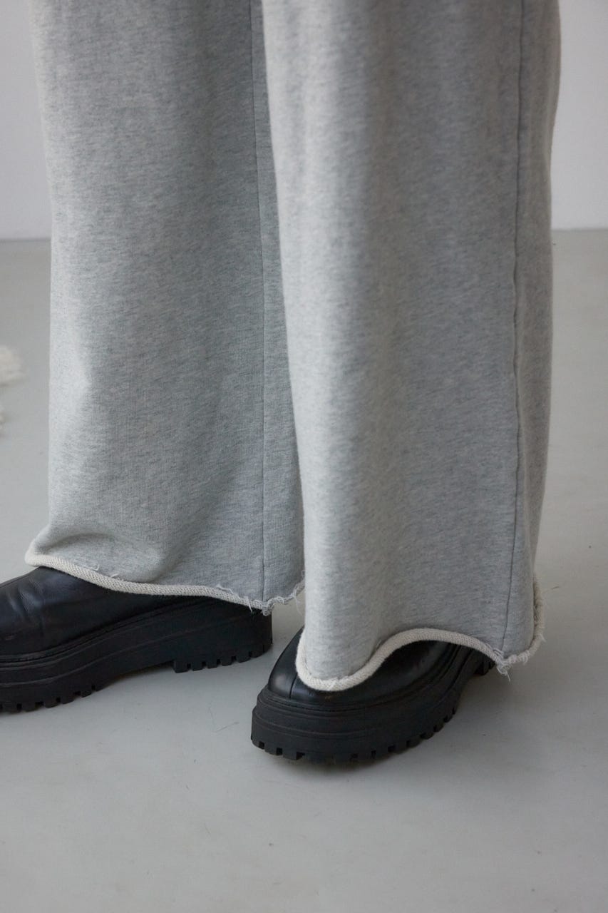 スウェット素材でカジュアルな印象もありつつ、太すぎない程よいワイドシルエットと裾のカットオフデザインがポイント。