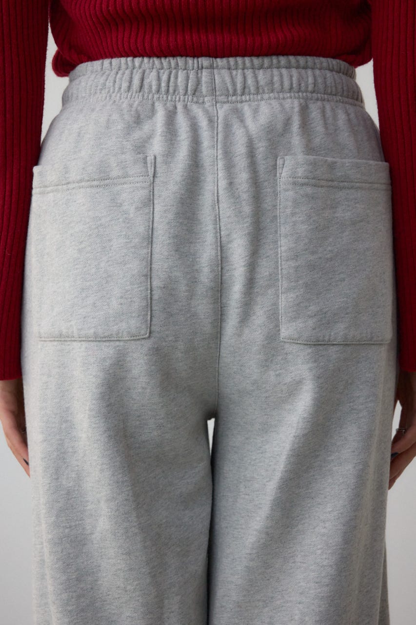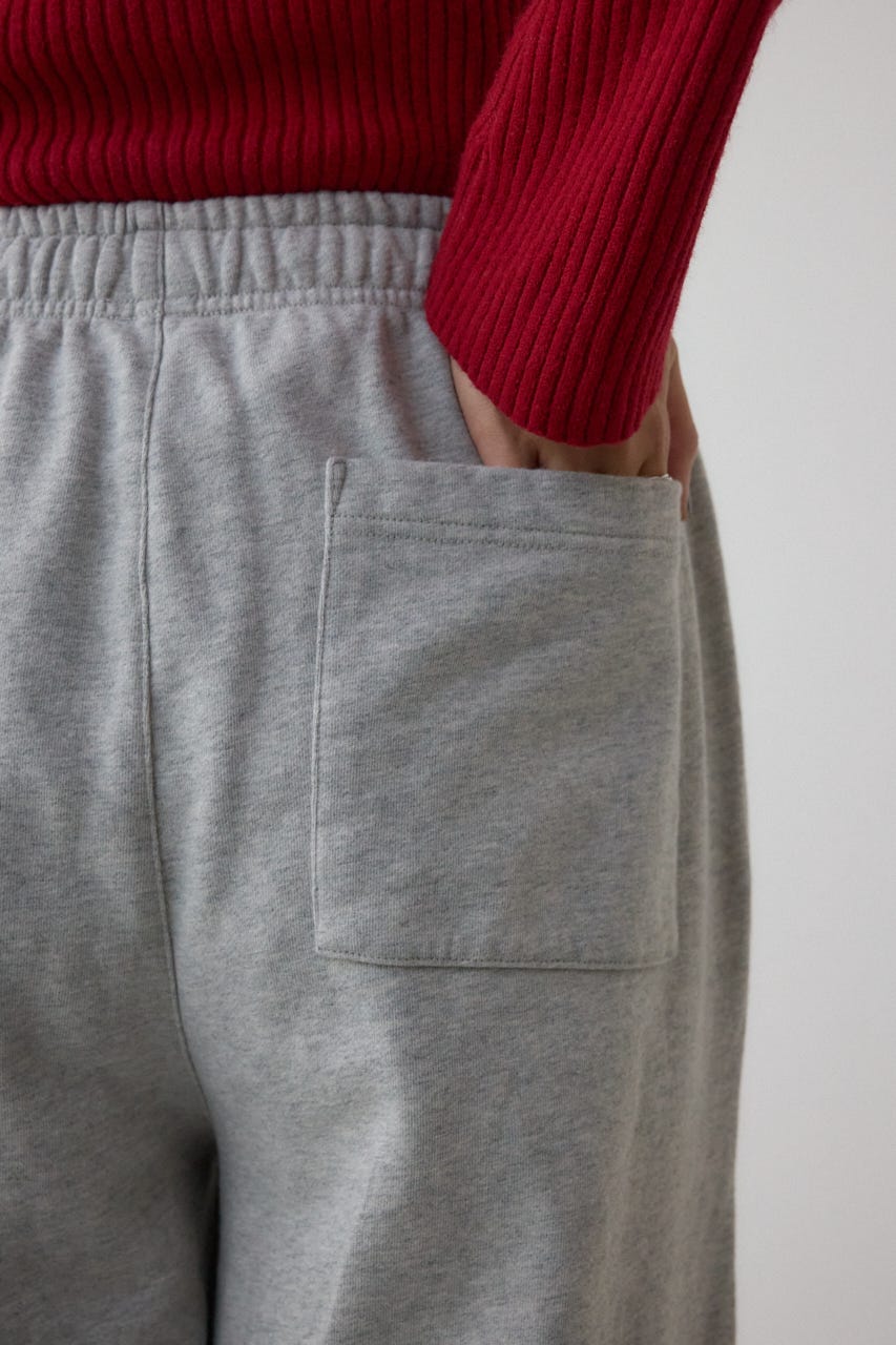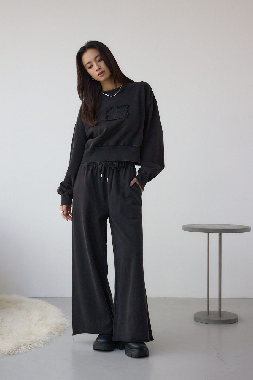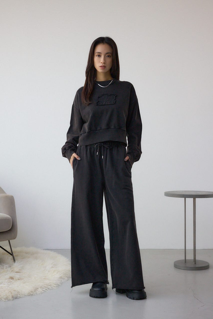 スウェット素材でカジュアルな印象もありつつ、太すぎない程よいワイドシルエットと裾のカットオフデザインがポイント。