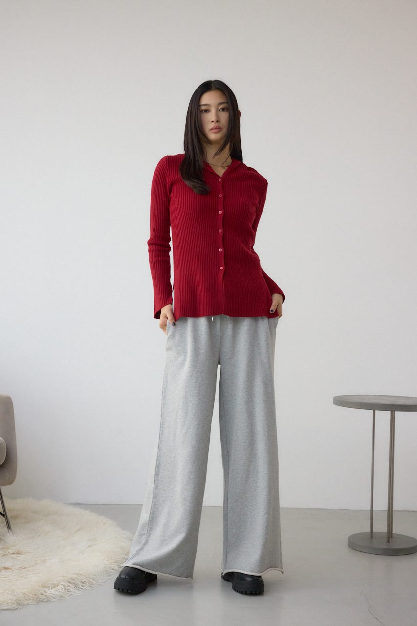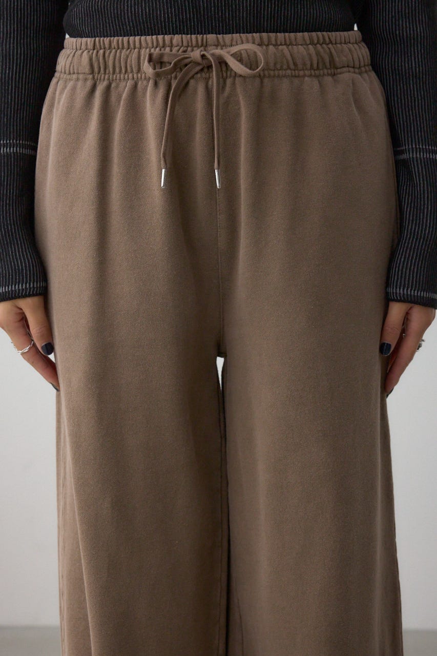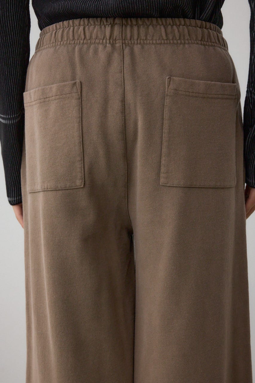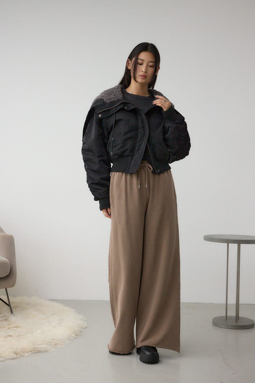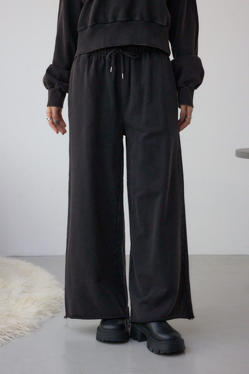 スウェット素材でカジュアルな印象もありつつ、太すぎない程よいワイドシルエットと裾のカットオフデザインがポイント。