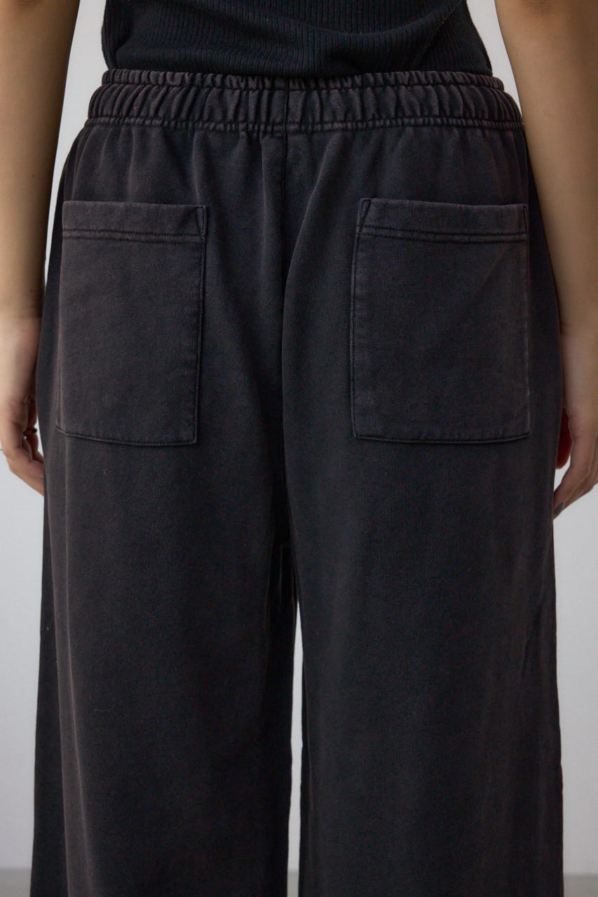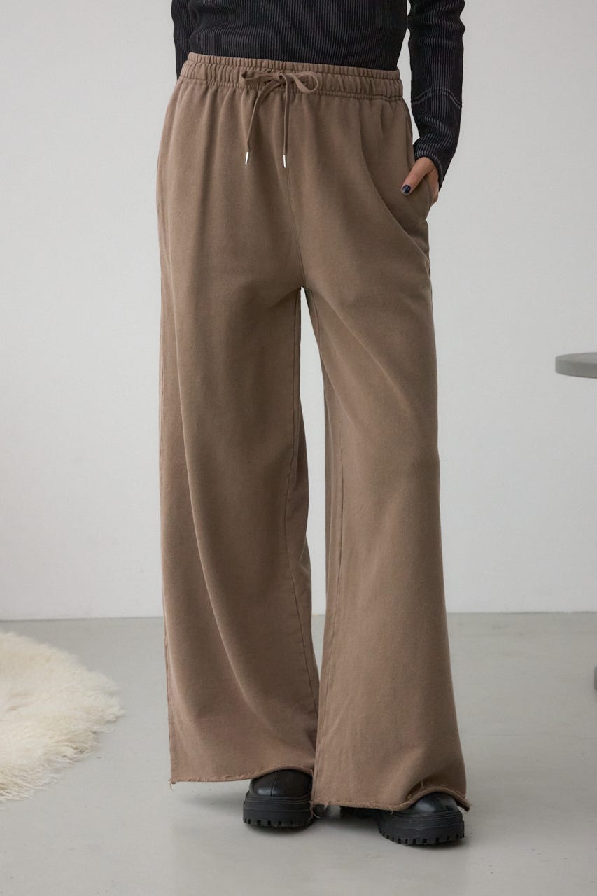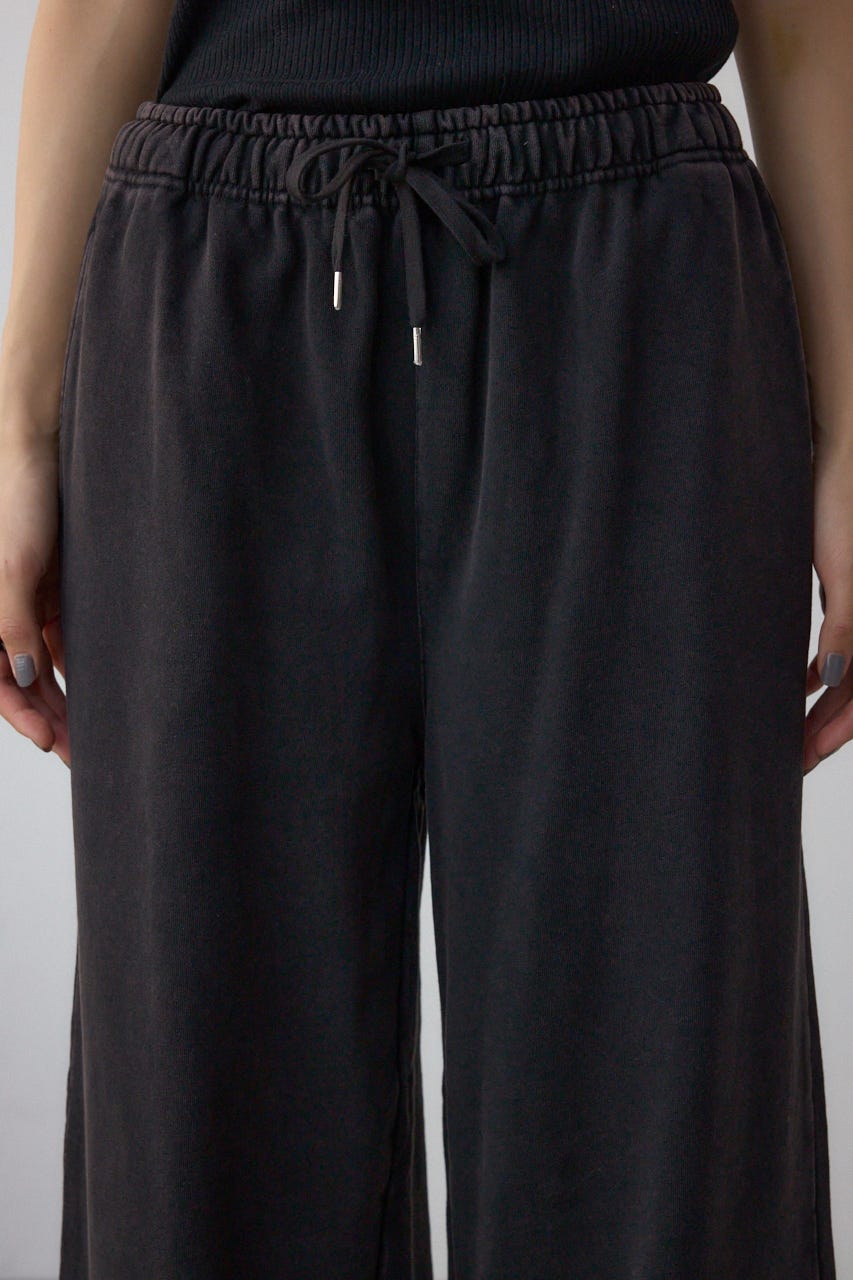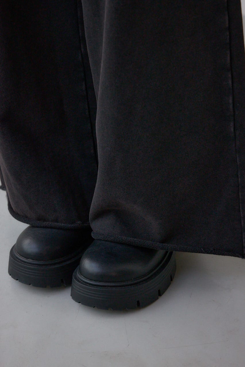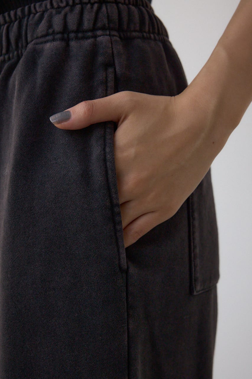 スウェット素材でカジュアルな印象もありつつ、太すぎない程よいワイドシルエットと裾のカットオフデザインがポイント。