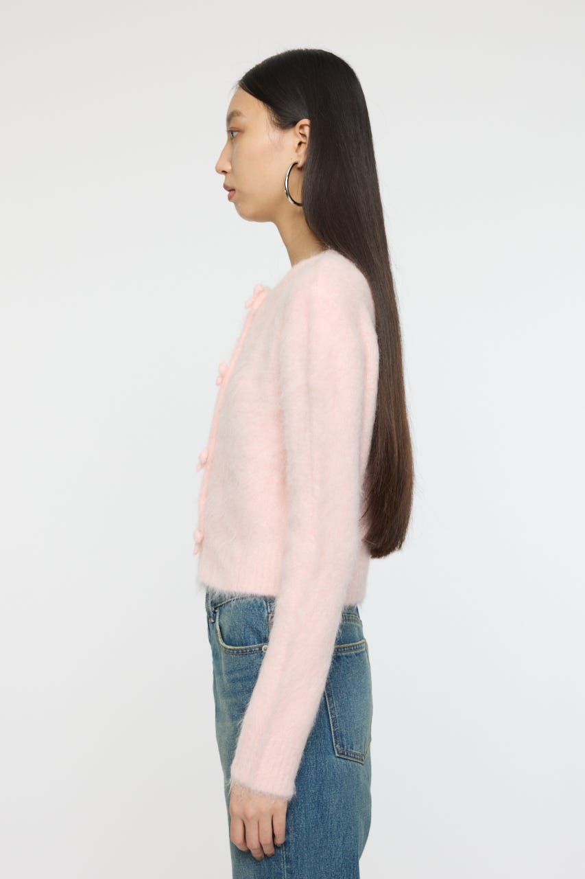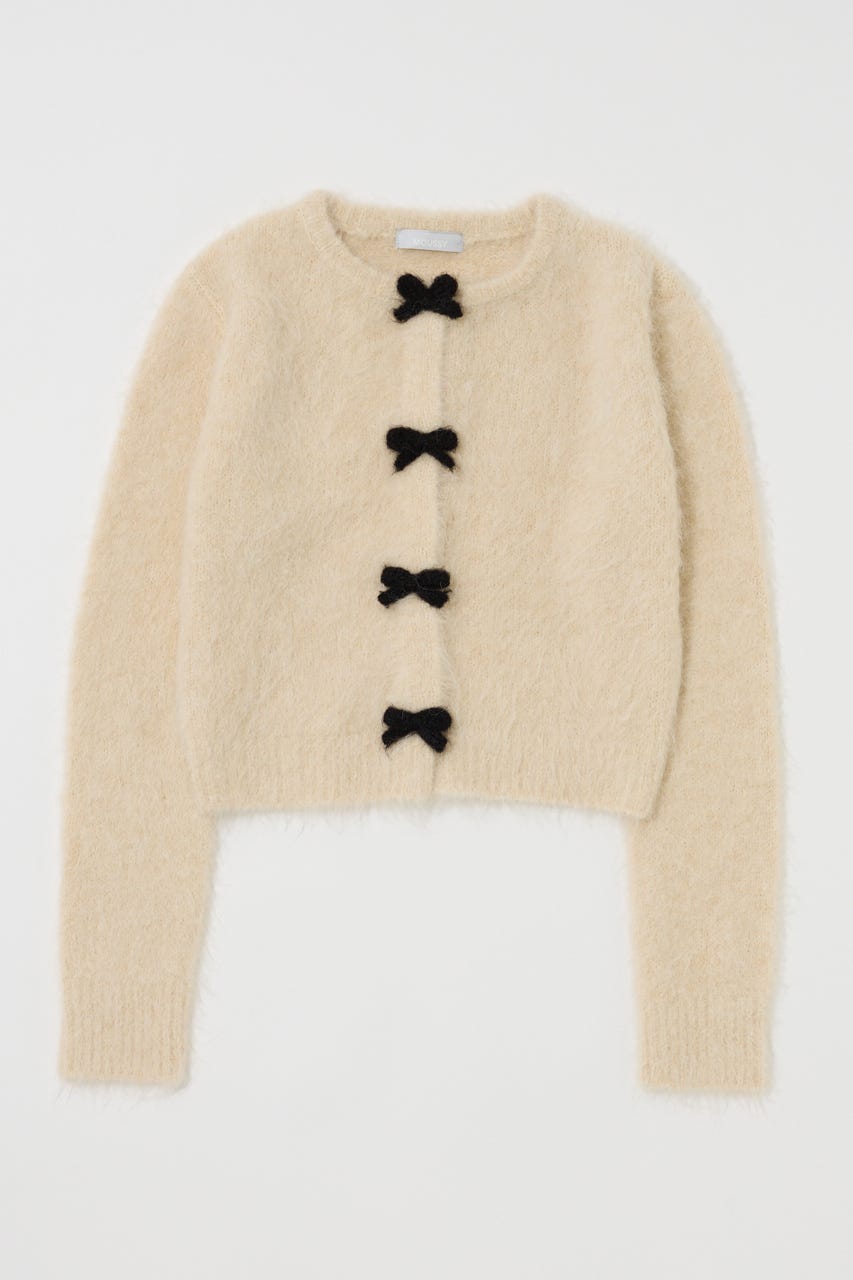 フロントのリボンがフェミニンな印象を与える、柔らかい風合いの素材と豊富なカラーバリエーションが魅力のニットカーディガン。