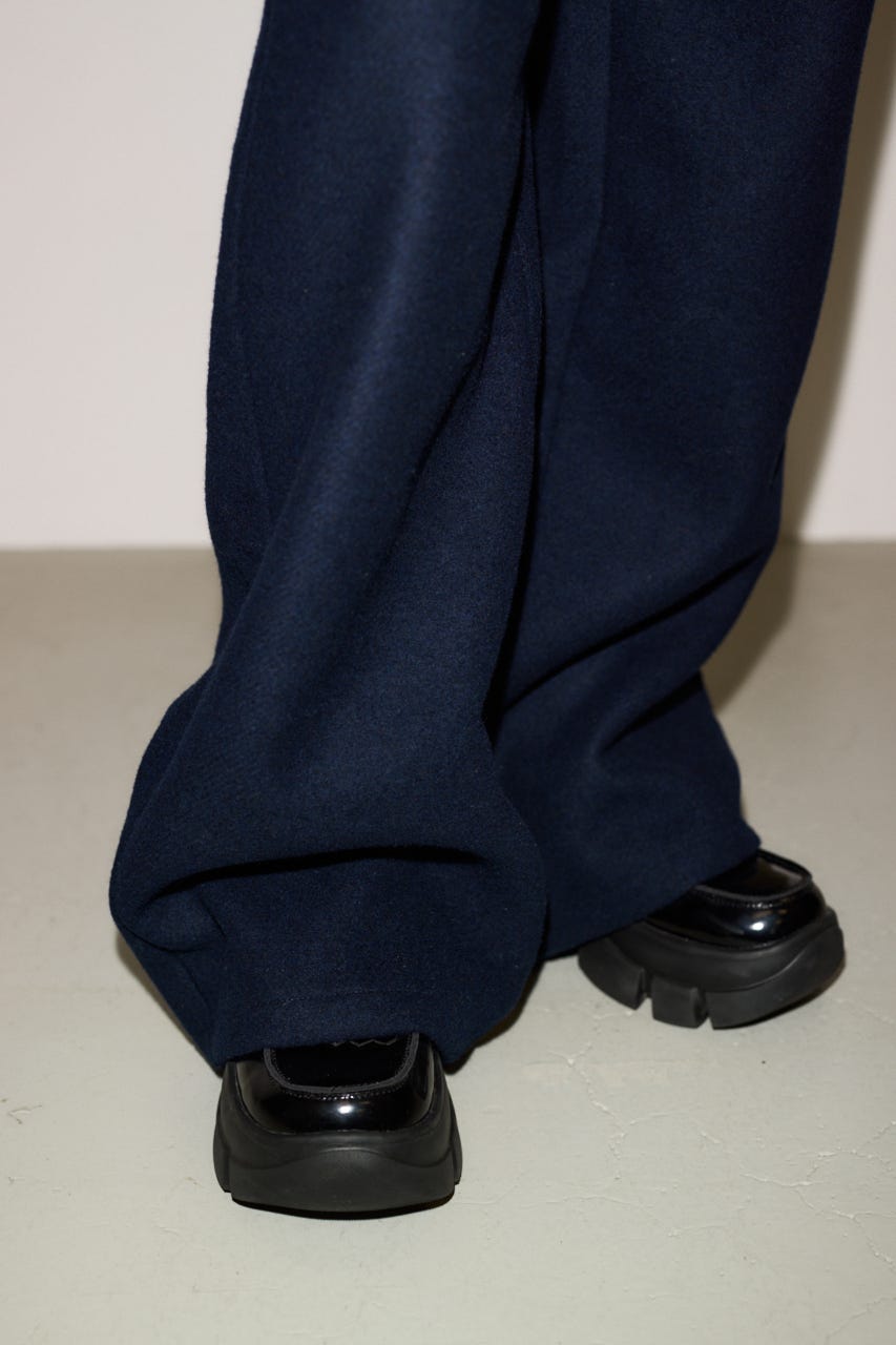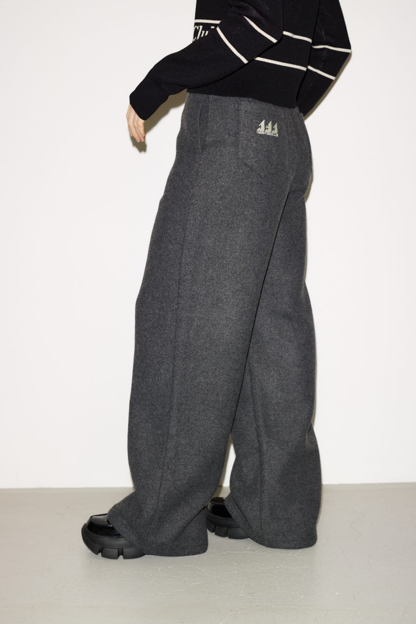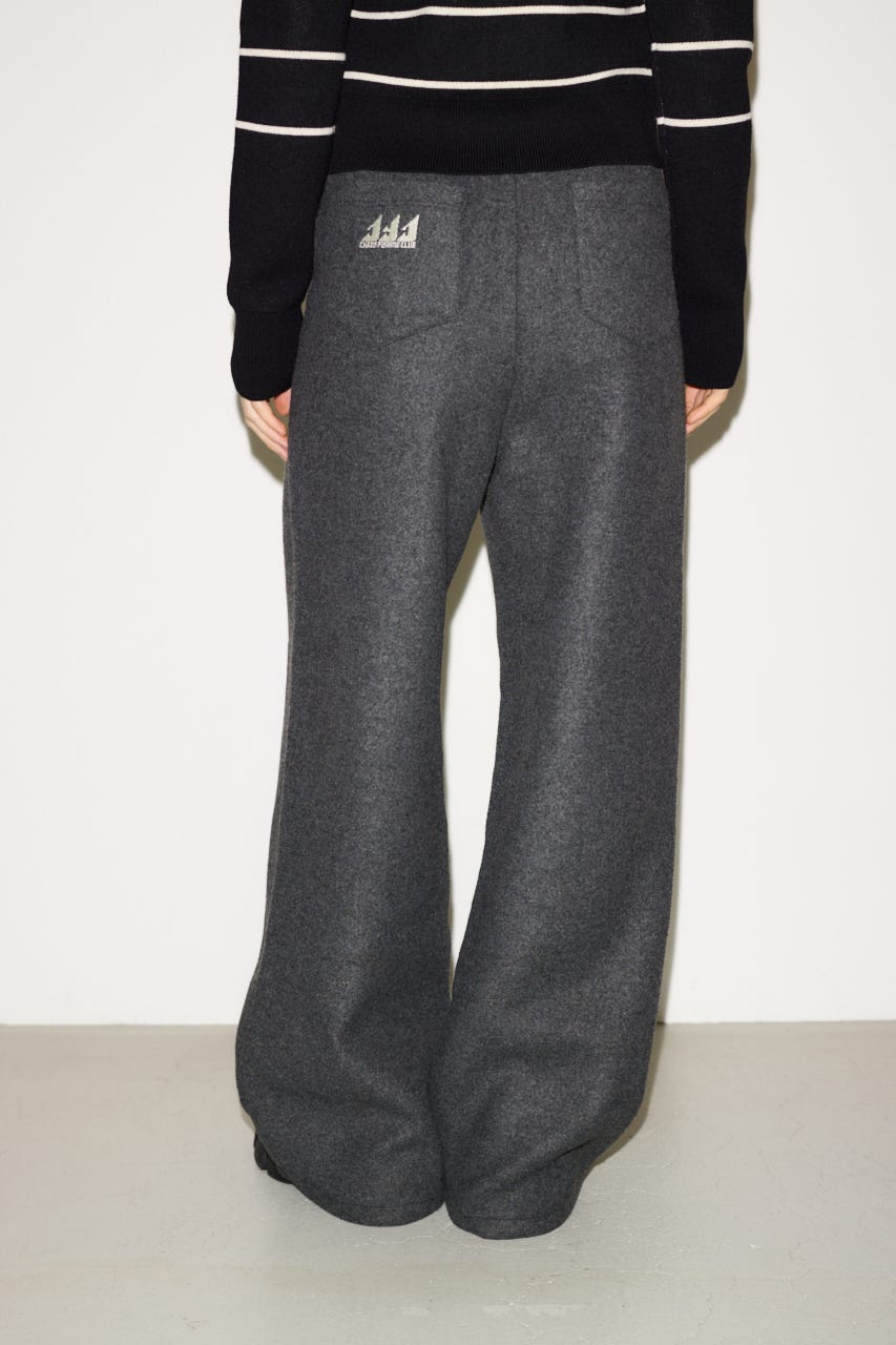 ウール混の暖かみのある素材を使用し、程よい太さのストレートシルエットでデイリー使いしやすく、ウエスト部分は後身頃がゴム使用になっているのでリラックス感のあるアイテムに。
